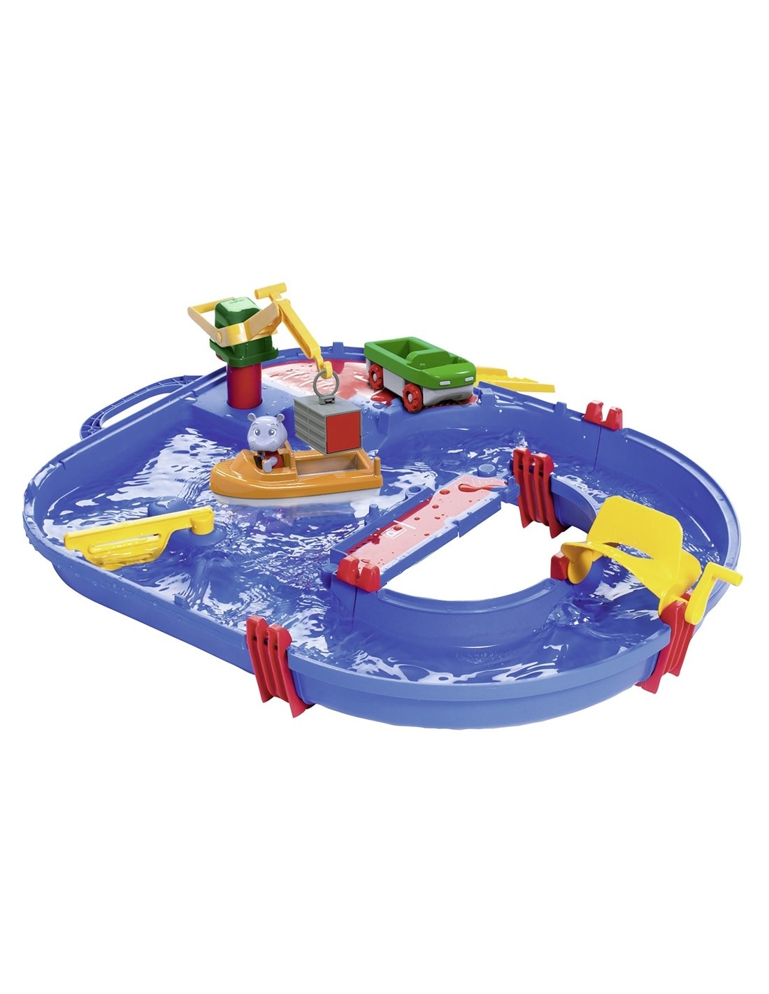El sistema de canales de agua cuenta con una gran dársena portuaria con grúa de carga, un barco portacontenedores, un vehículo anfibio y la figura de Wilma, el hipopótamo; con la ayuda de la manivela con pala extra grandes se generan fácilmente corrientes para que los barcos puedan viajar a través de los anchos canales, las abrazaderas de conexión estancas cierran los canales de forma segura.