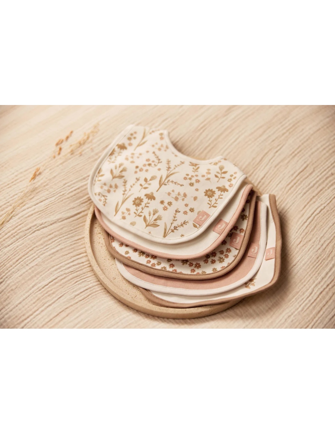 Esta colección On The Go incluye baberos en bonitos colores como Sea Green, Ivory y Biscuit, cada uno con un estampado diferente.