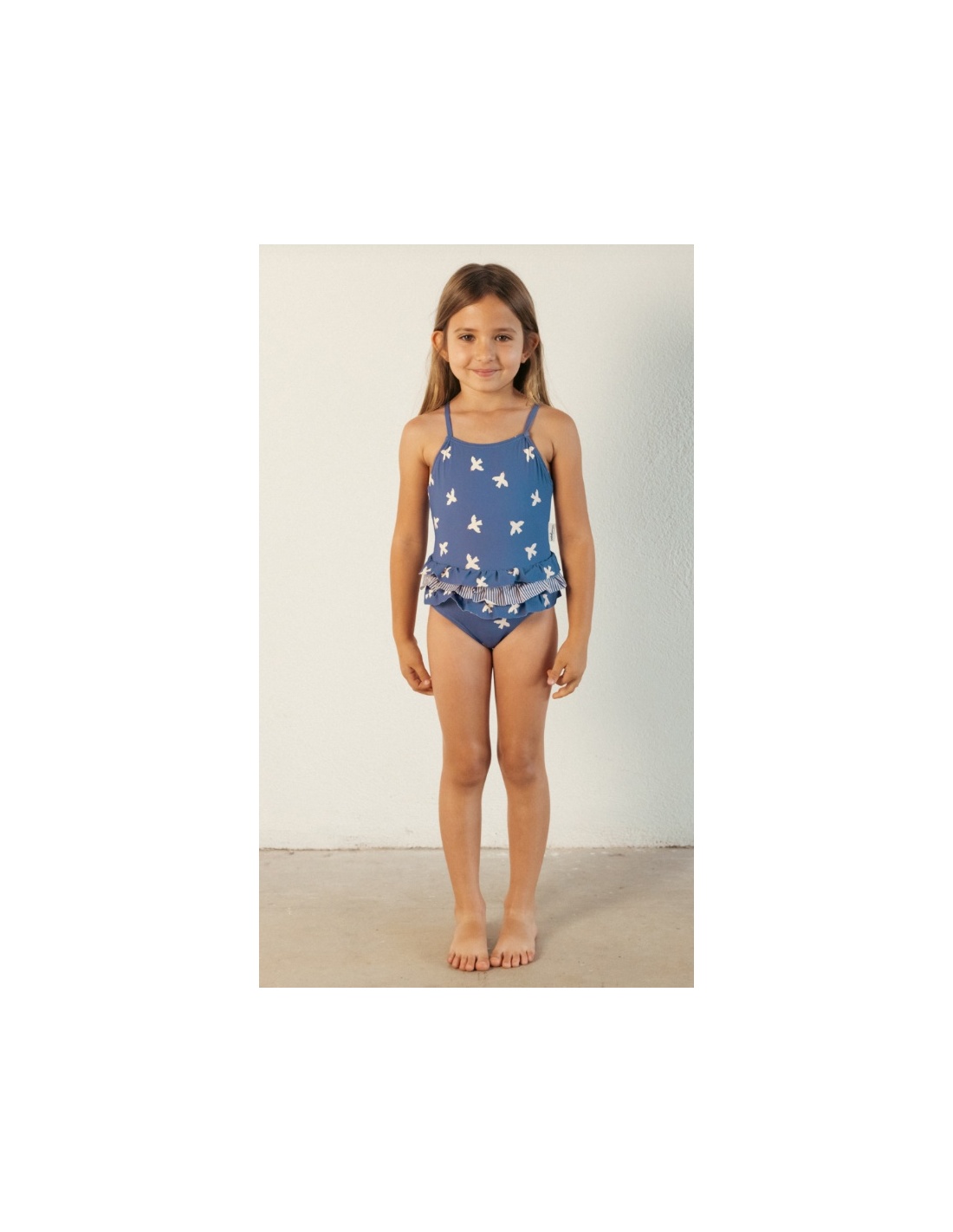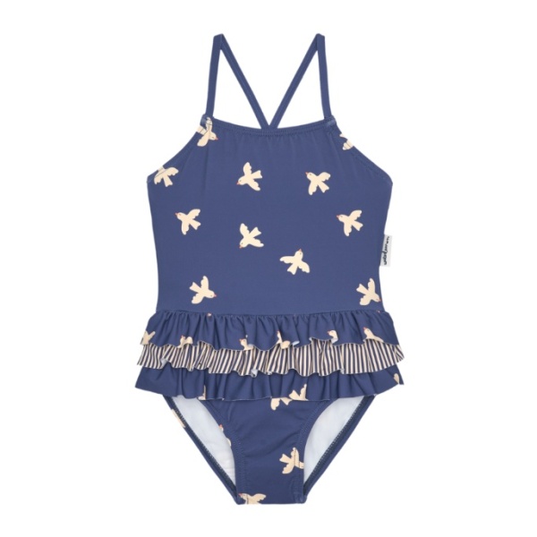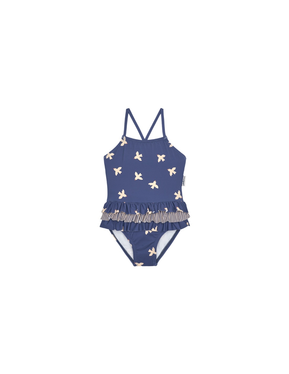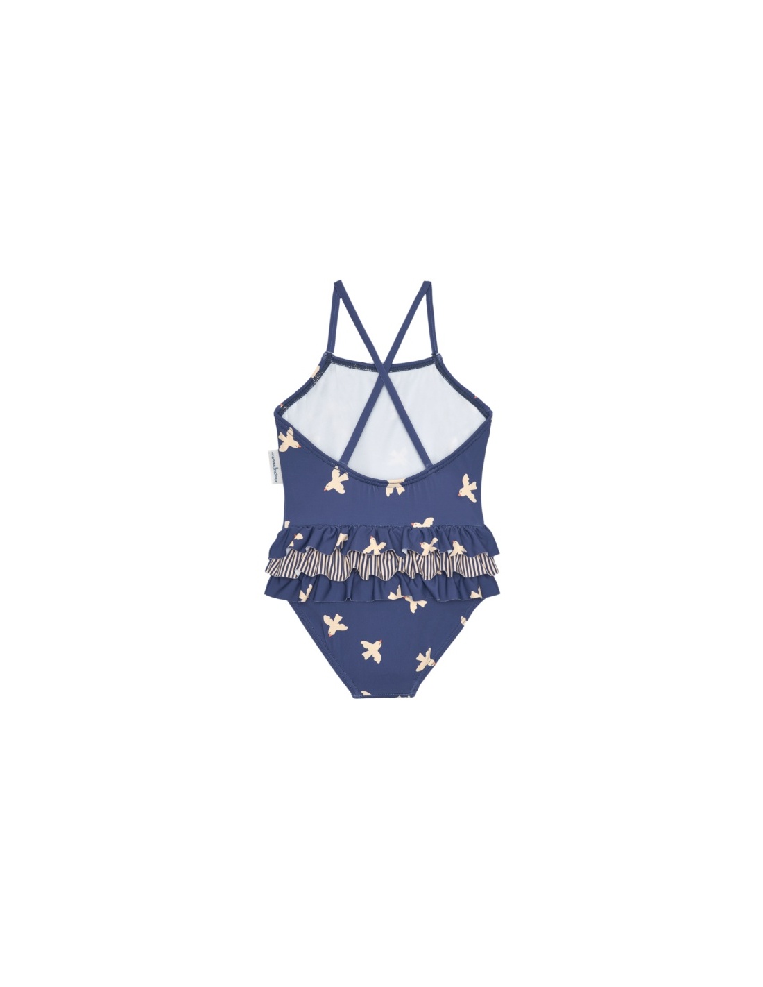 Bañador escote recto, tirantes finos cruzados en la espalda y tres volantes en la cintura, con estampado de pájaros con fondo color azul marino.