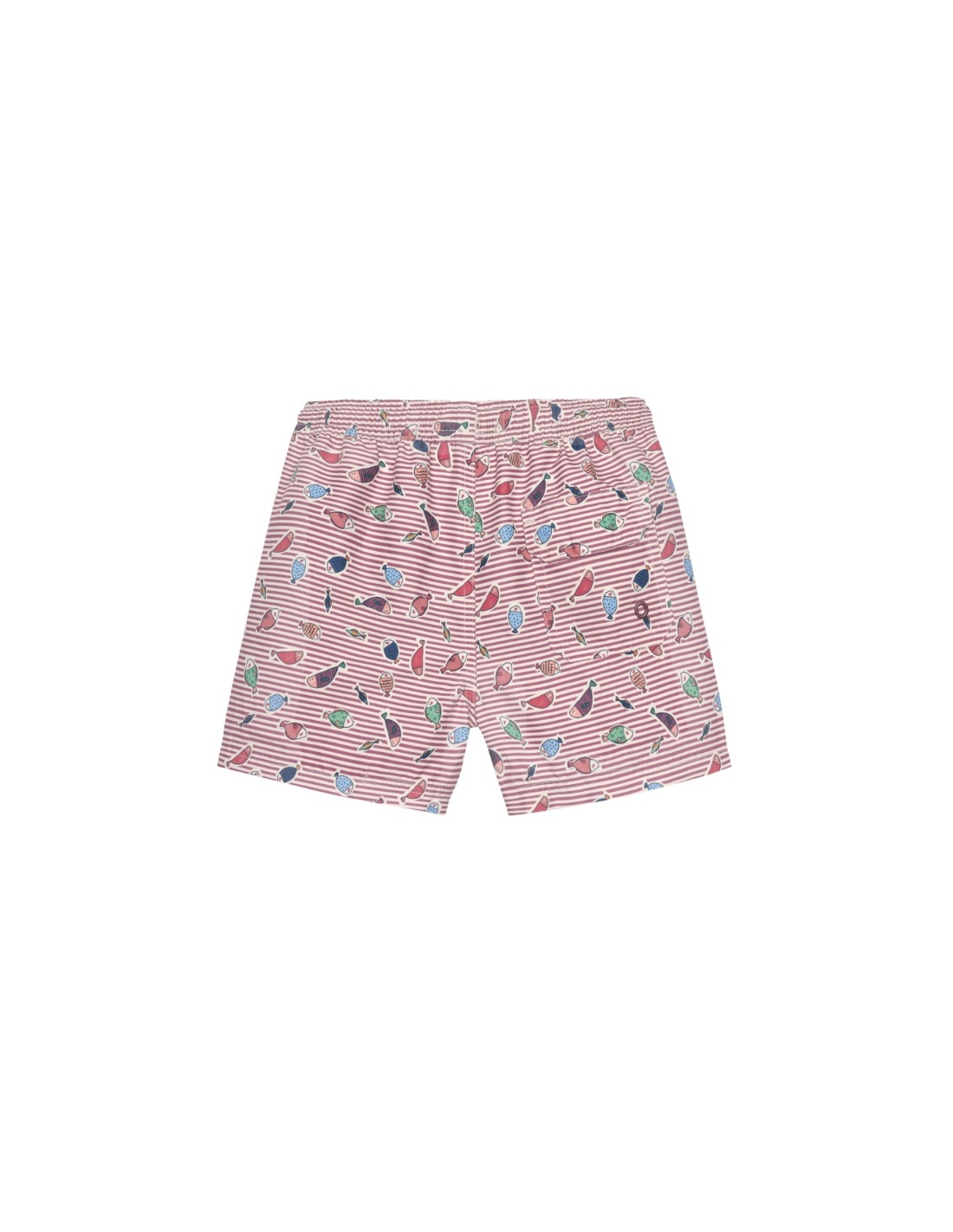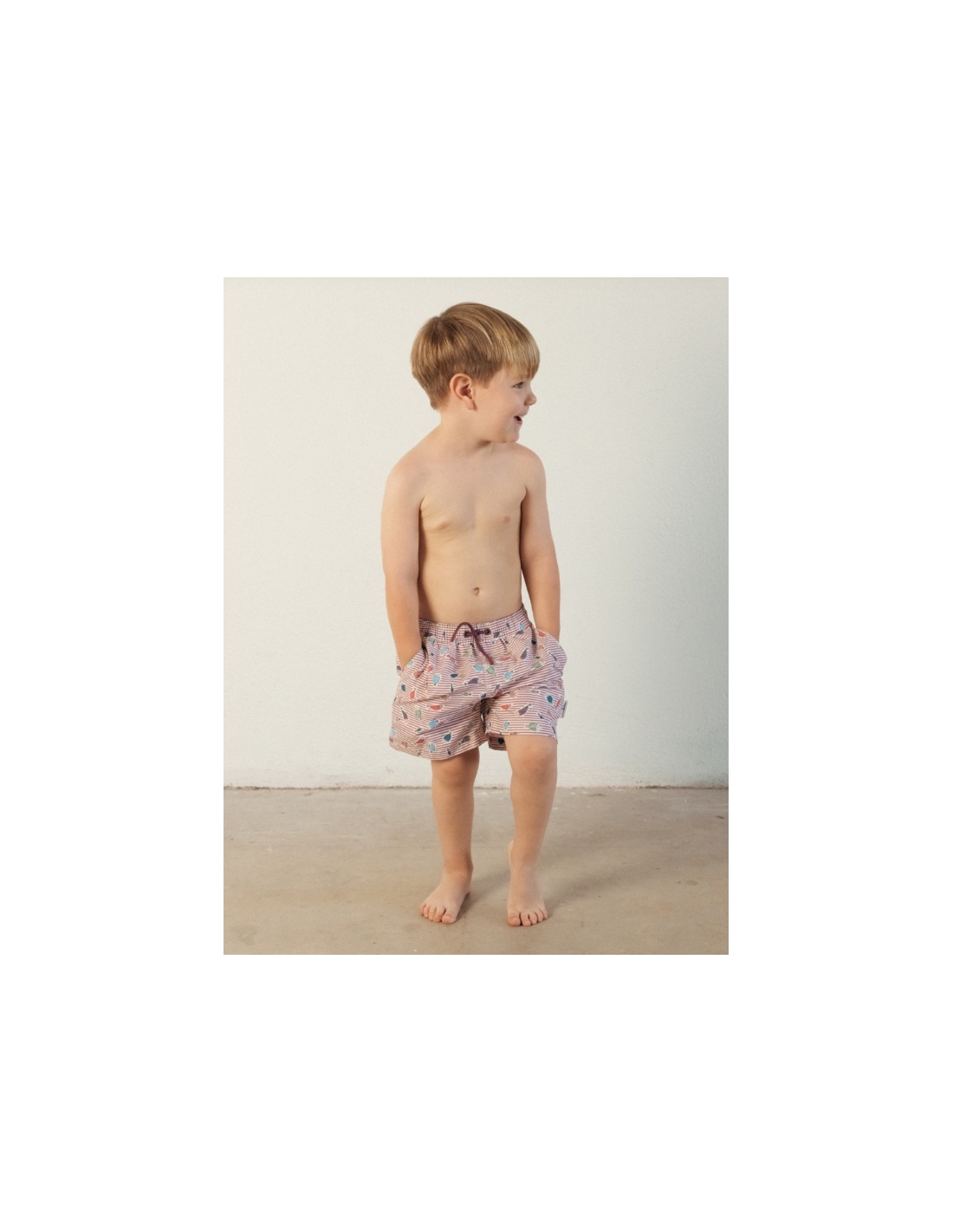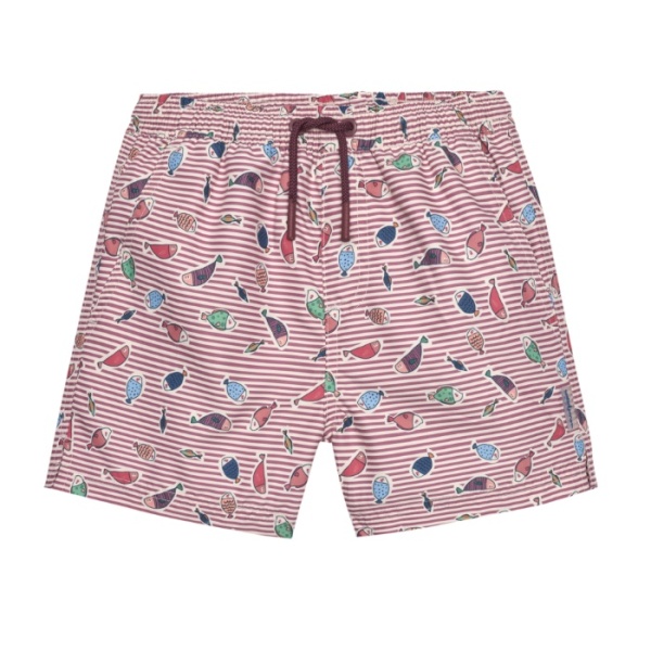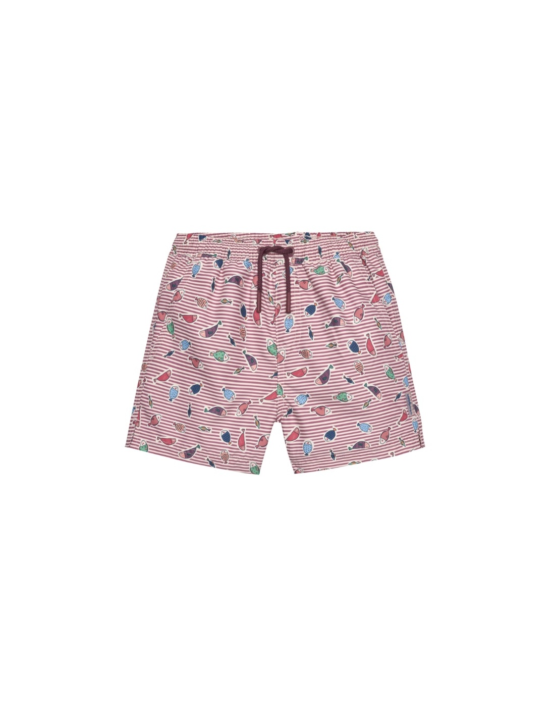 Bañador con cintura elástica, cordones ajustables, bolsillos laterales en delantero y bolsillo trasero con cierre de velcro. Estampado de peces con fondo de rayas.