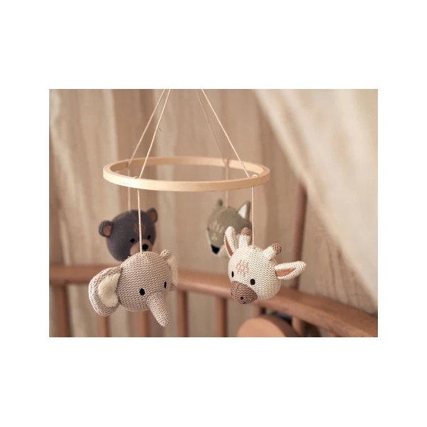 El móvil cuenta con 4 adorables animalitos colgados de un aro de madera: un pequeño zorro, una jirafa, un oso y un elefante que velarán dulcemente por tu bebé.