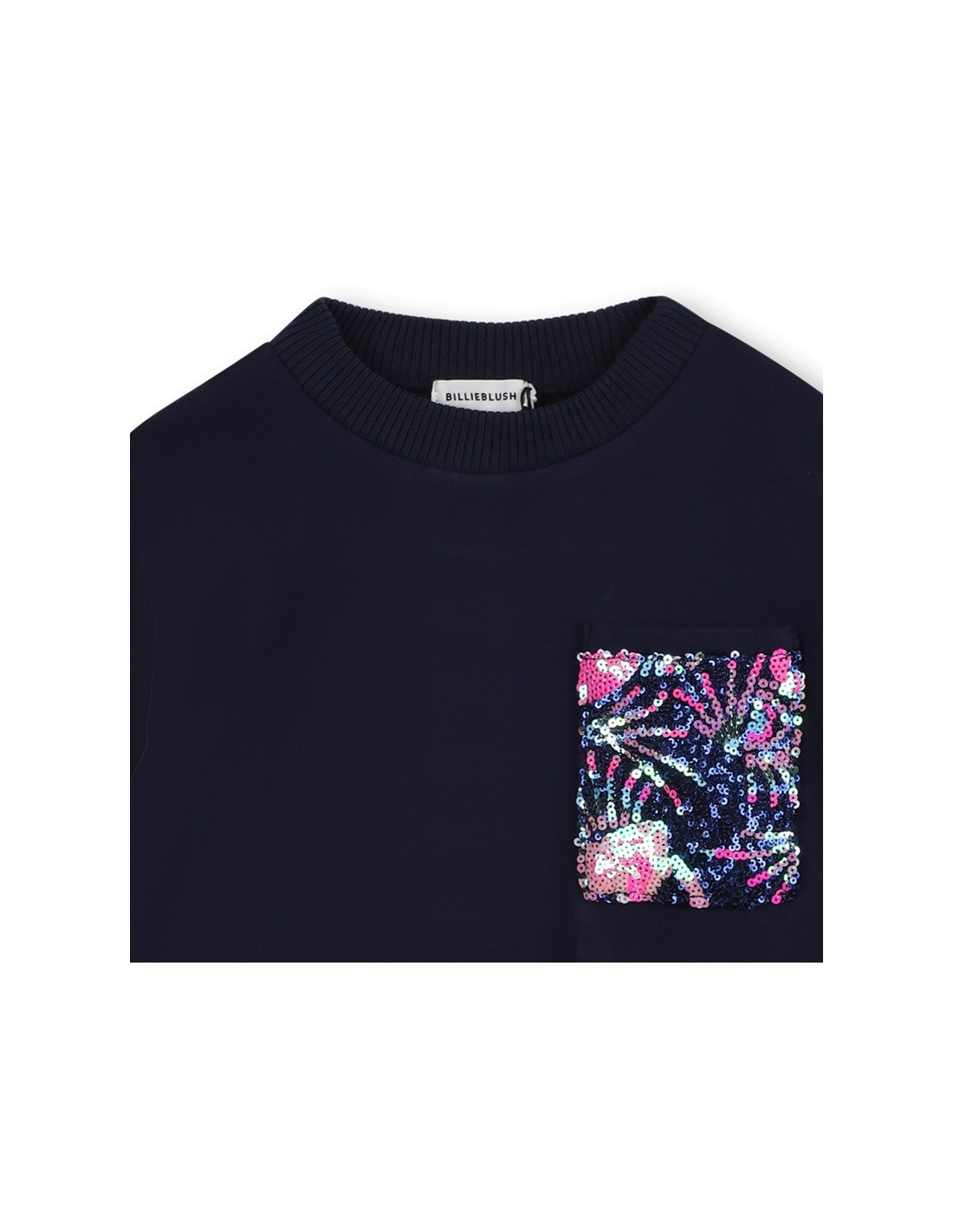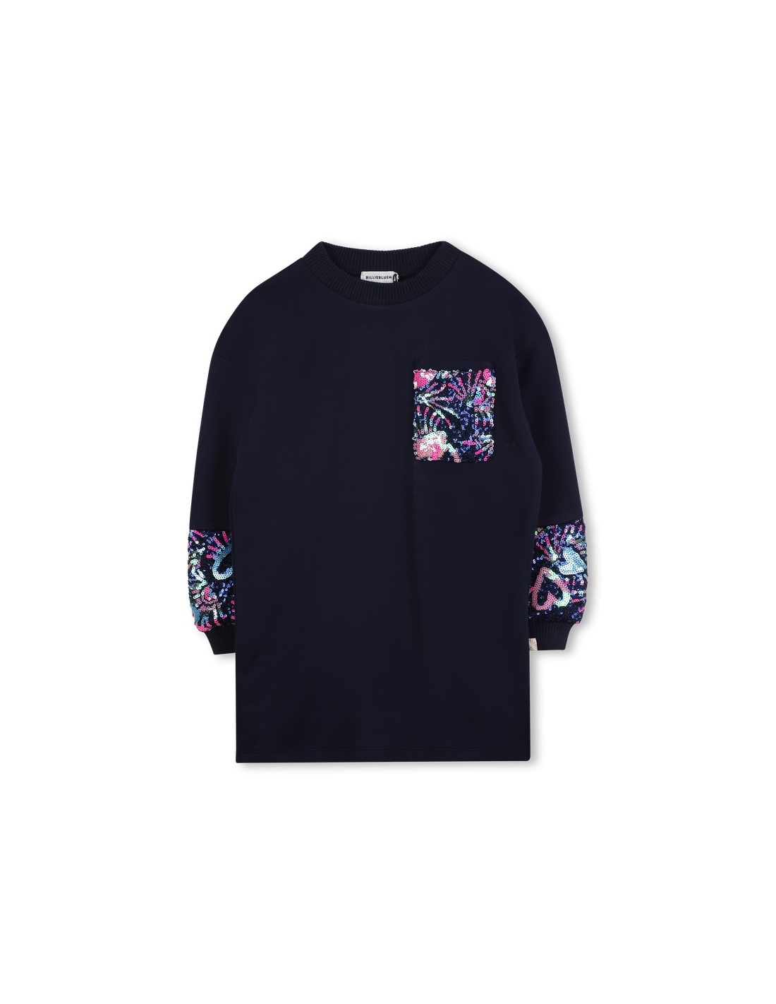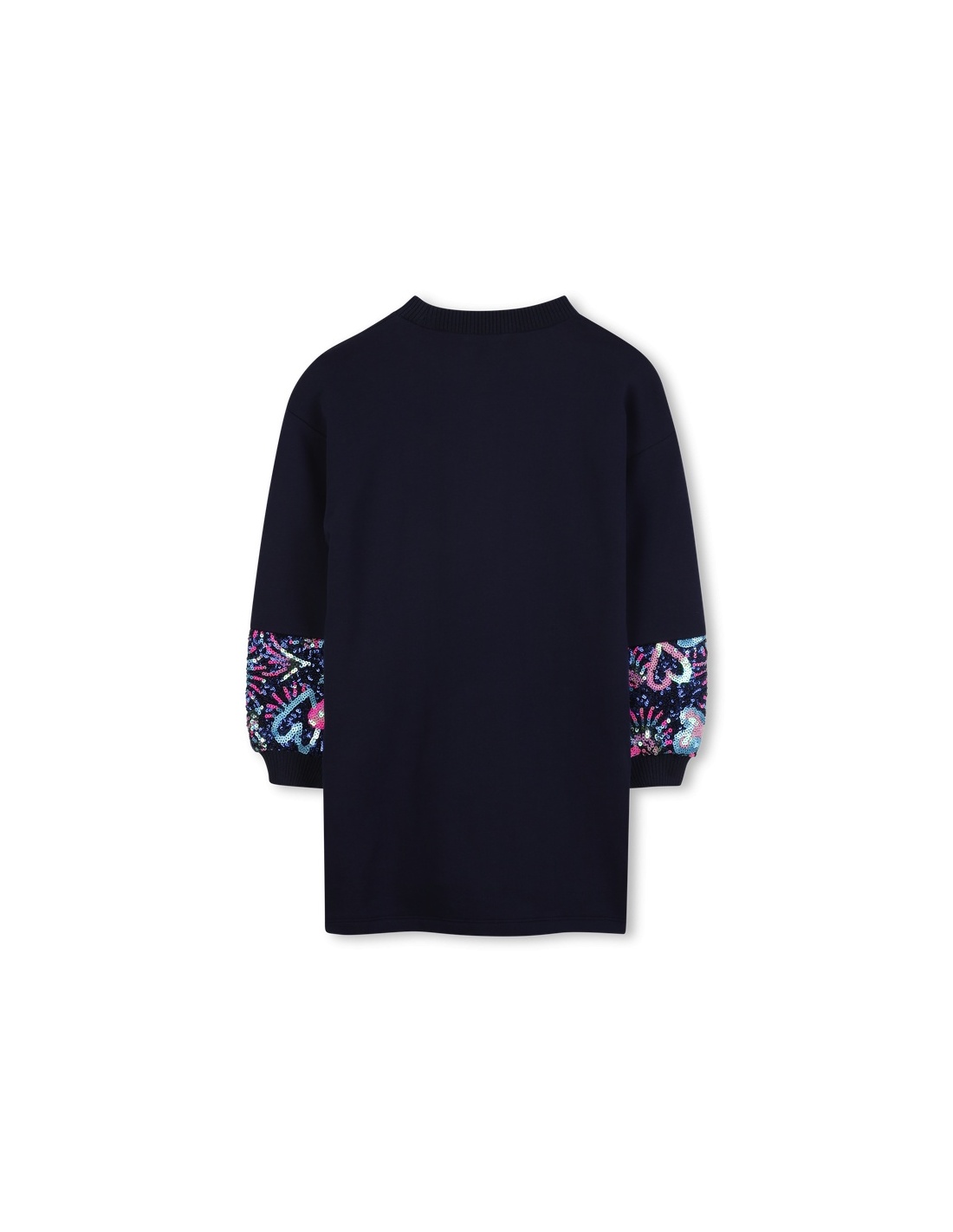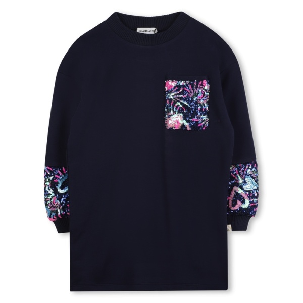 Este vestido de forro polar con lentejuelas y firma BILLIEBLUSH se distingue por sus mangas abullonadas. Su material suave envuelve cómodamente, mientras que los detalles brillantes añaden una nota festiva. Perfecto para alegrar los días con un estilo tierno y alegre.