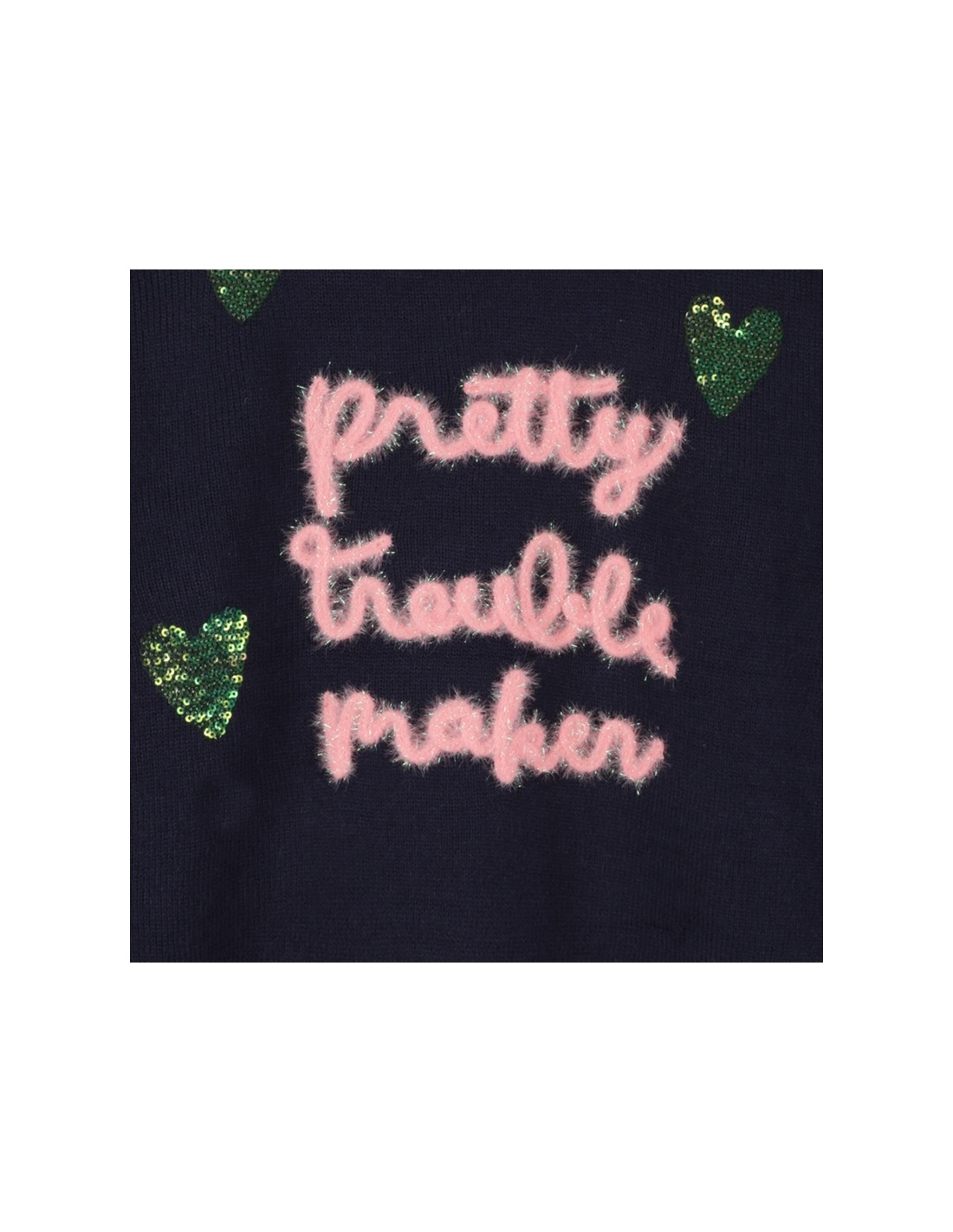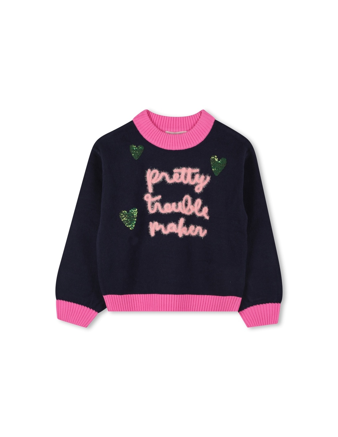 Este jersey de punto fino de BILLIEBLUSH es un modelo delicado y elegante, perfecto para añadir un toque de encanto a la vida cotidiana. La ilustración de la parte delantera, hecha con hilos de fantasía y corazones adornados con lentejuelas, agrega una nota brillante y divertida. El escote y la parte inferior del suéter en contraste de color agregan un bonito detalle visual que complementa perfectamente el diseño. Un jersey suave, moderno y lleno de fantasía.