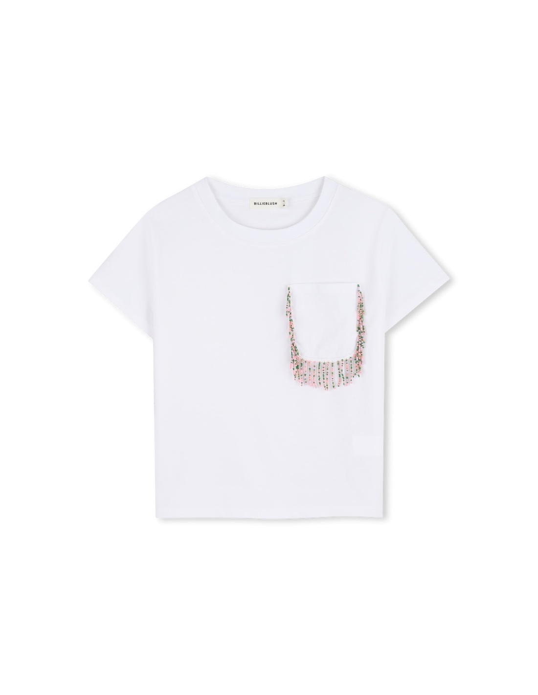Esta camiseta BILLIEBLUSH se distingue por su bolsillo decorado con perlas y delicados bordados que aportan un toque especial y elegante. Su material suave y su ajuste cómodo la convierten en una prenda ideal para el uso diario, acompañando cada movimiento con ligereza. Un modelo lleno de encanto y fantasía, perfecto para añadir una nota refinada y alegre a cualquier conjunto infantil.