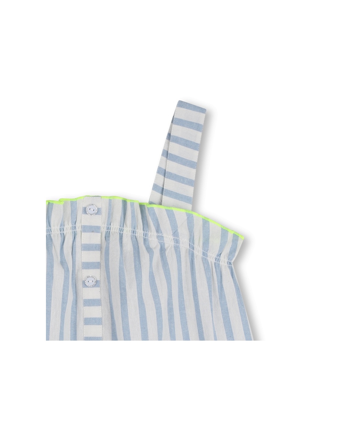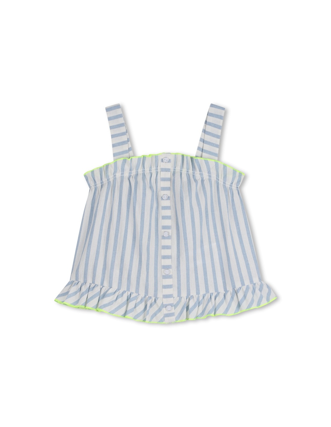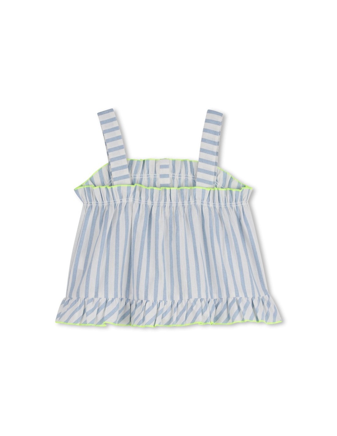 Frescura y encanto para los días soleados: esta blusa de algodón con tirantes de Billieblush combina un delicado estampado de rayas con volantes juguetones en la parte superior e inferior, creando un movimiento ligero y femenino. El contraste de bourdon realza cada detalle con un acabado cuidado y lleno de personalidad. Cómoda y fácil de llevar, es perfecta para acompañar jornadas de juegos e imaginación con un estilo chic y travieso.