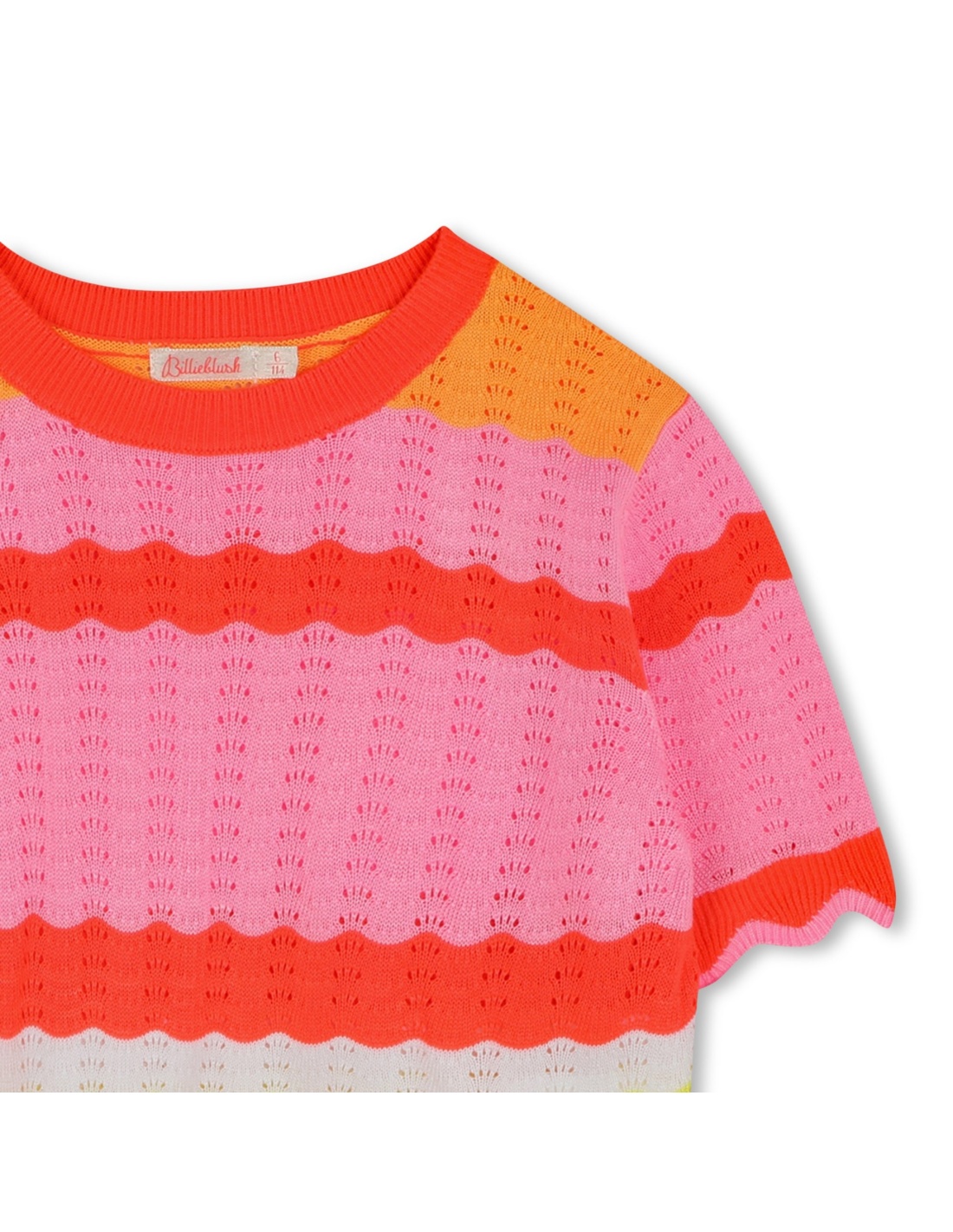Jersey de manga corta de punto de rayas multicolores de tamaños irregulares y la confección de punto calado.