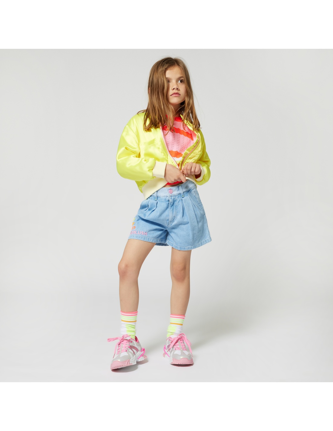 Este pantalón corto vaquero de Billieblush es perfecto para el día a día. Tiene cierre de cremallera y botón y cintura ajustable a cualquier morfología. El lateral izquierdo está adornado con una ilustración de lentejuelas multicolores. Este modelo está hecho de tela vaquera elástica hecha principalmente de algodón.
