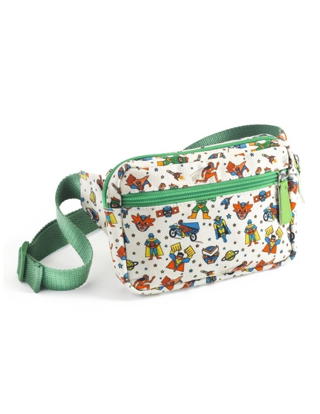 Una riñonera con dibujos relacionados con superhéroes con un gran bolsillo central y un bolsillo pequeño en la parte delantera. Se puede llevar como bandolera o en la cintura según el estilo de cada uno.