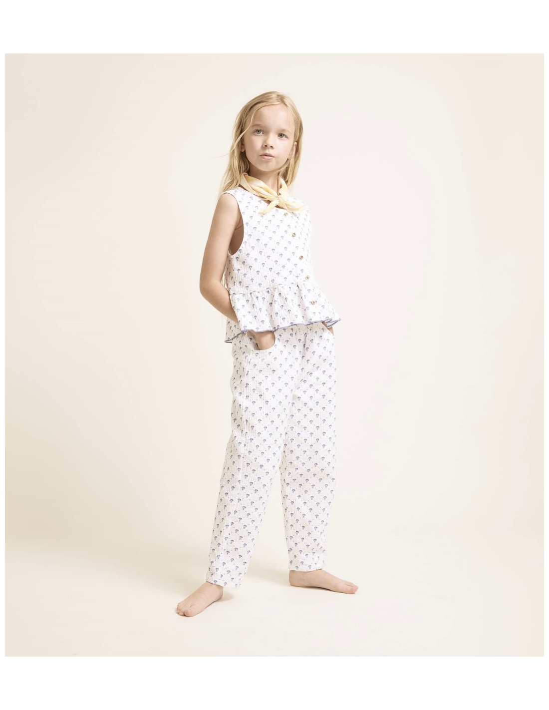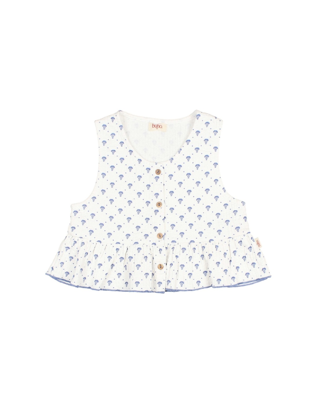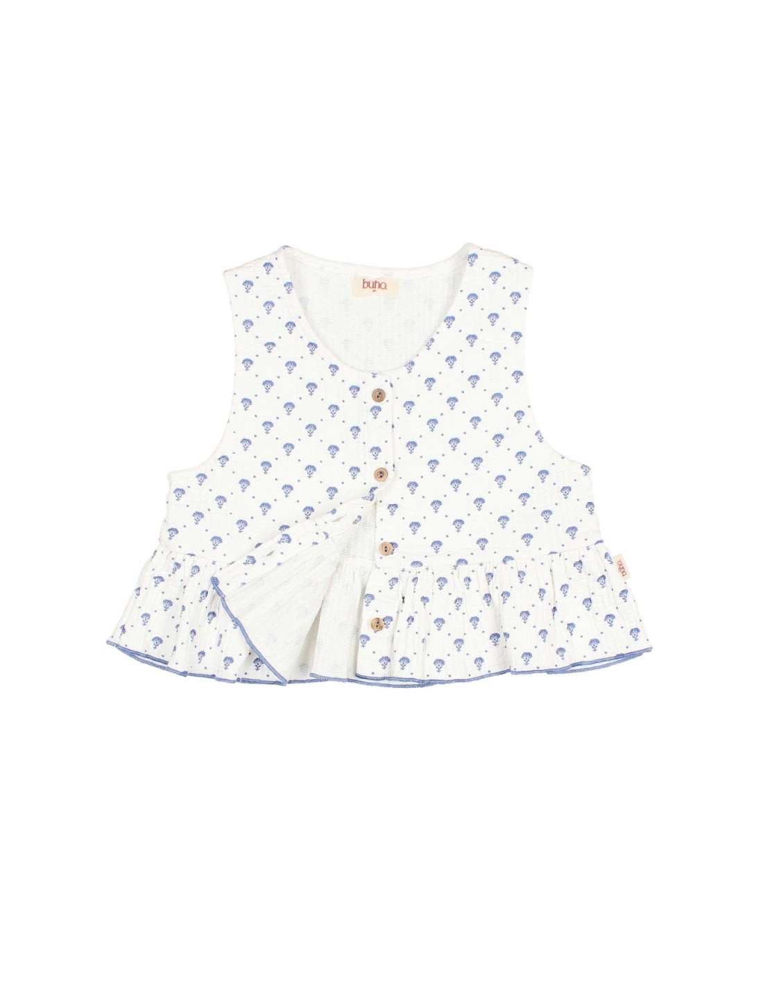 Top de tejido de algodón pespunteado con estampado bali. Volante en el bajo con acabado repulgo a contraste. Escote redondo. Abotonado frontal con botones de madera.
