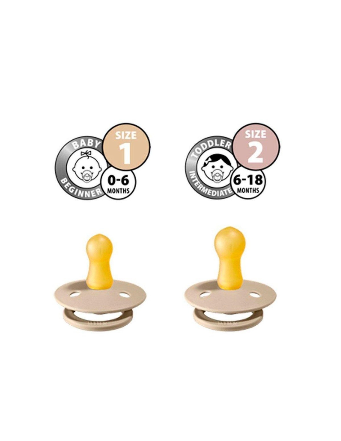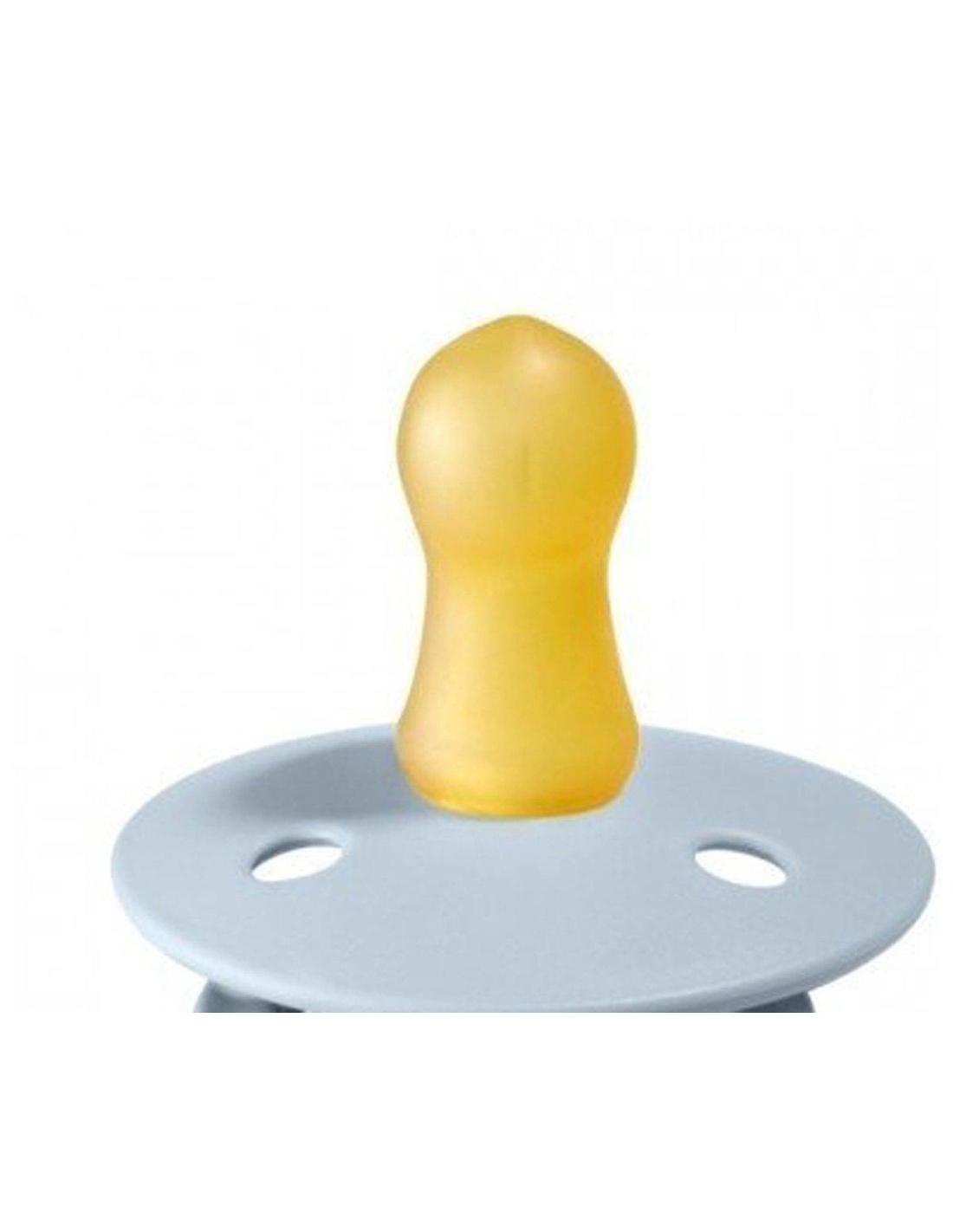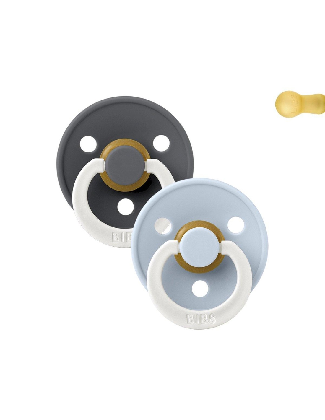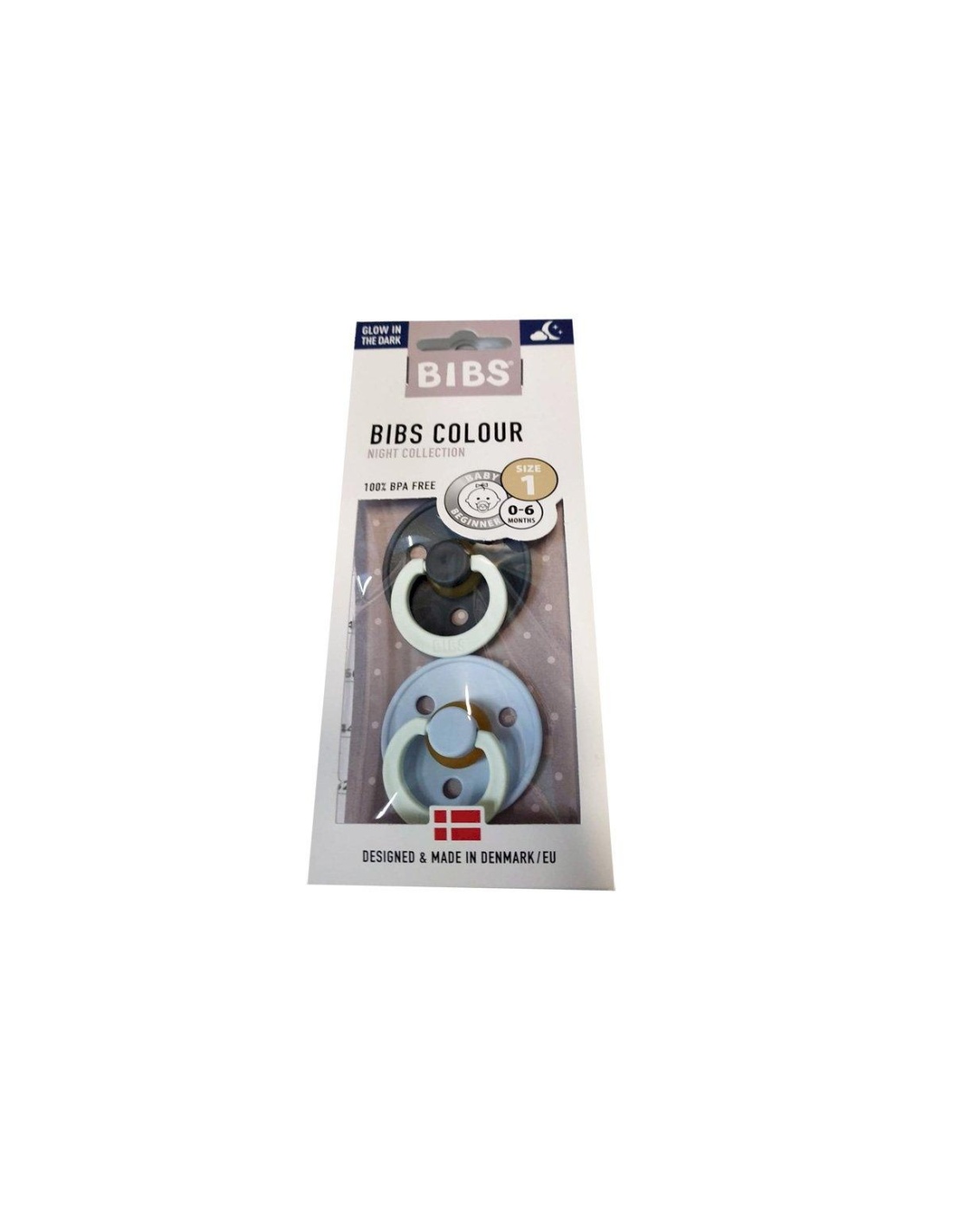 Este práctico pack incluye dos chupetes nocturnos BIBS en elegantes tonos Baby Blue y Iron. Diseñados con la clásica tetina redonda de caucho natural, imitan la forma del pecho materno, favoreciendo el reflejo natural de succión del bebé.
