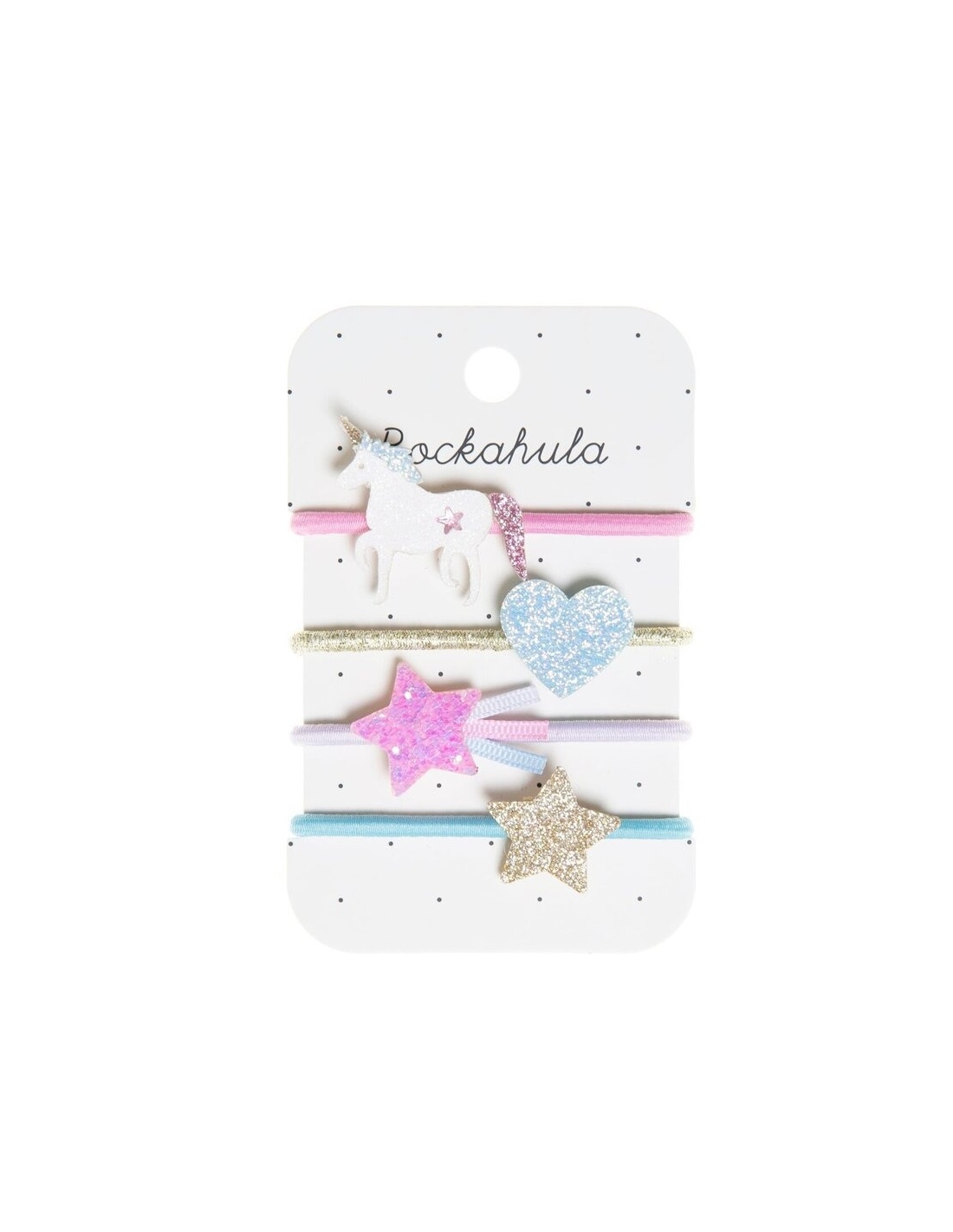 ¡Creemos en los unicornios! ¡Y tú también puedes, con nuestros unicornios brillantes! Este paquete de cuatro gomas es todo diferente e incluye nuestro unicornio, un corazón brillante, una estrella dorada y una estrella fugaz rosa.