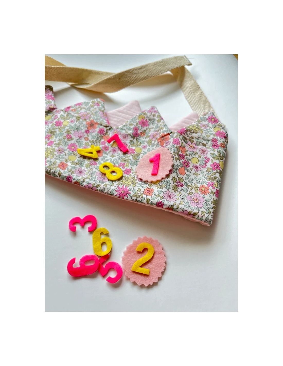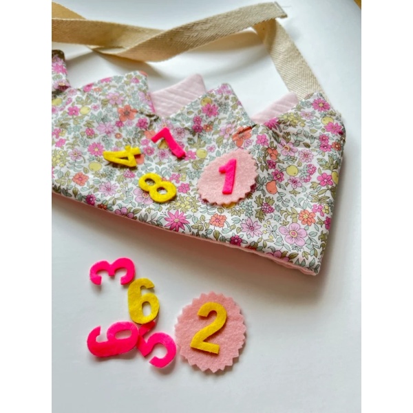 Corona de tela reversible en estampado Liberty y algodón, cierre con cintas de algodón y números del 1 al 9.