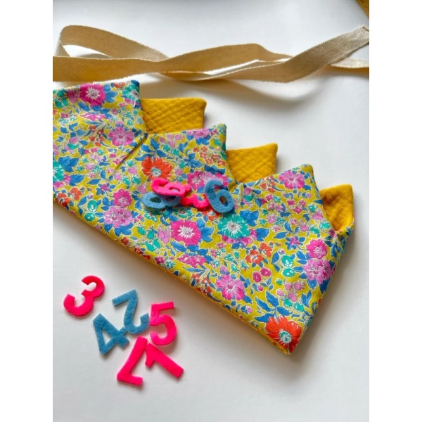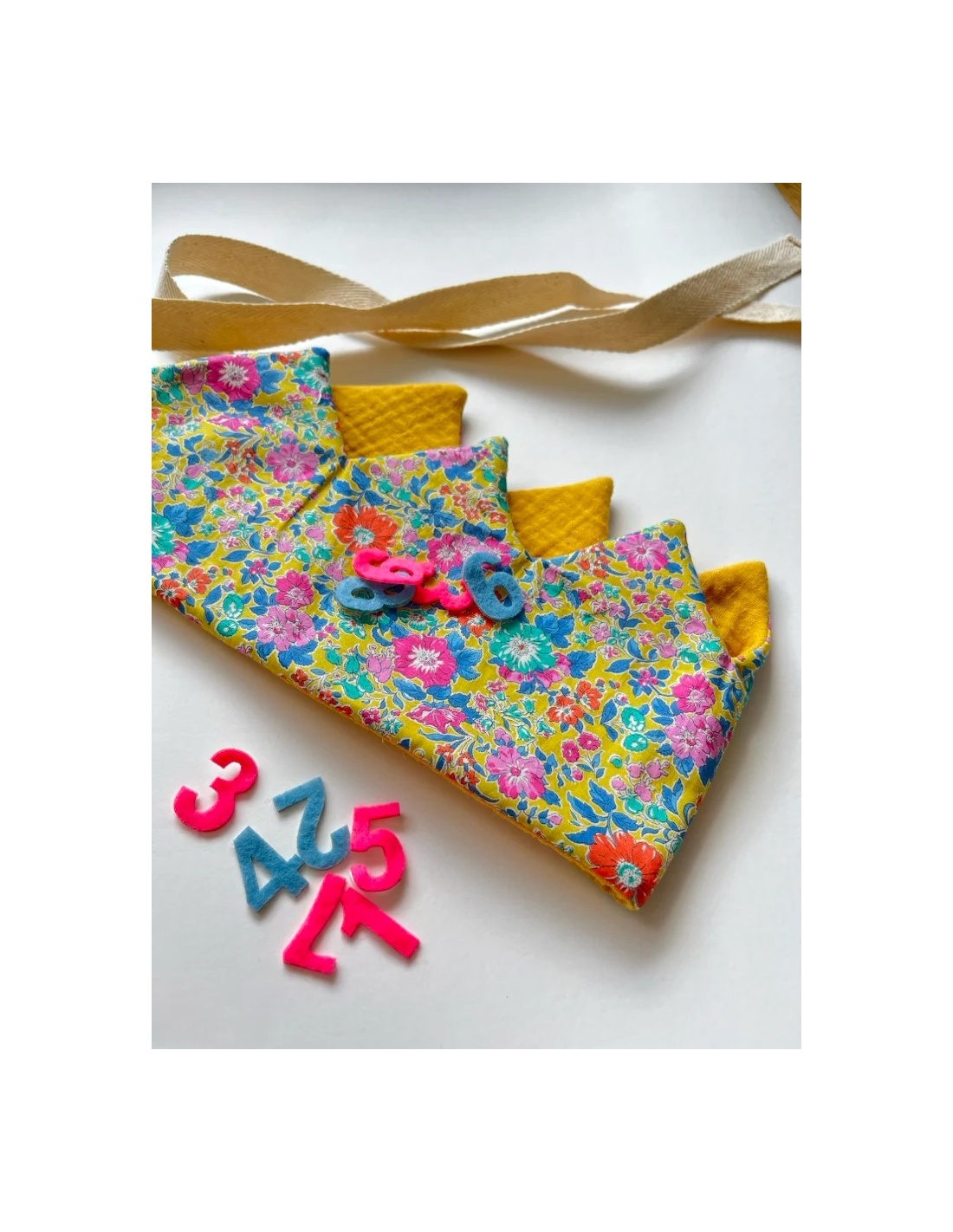 Corona de tela reversible en estampado Liberty y algodón, cierre con cintas de algodón y números del 1 al 9.