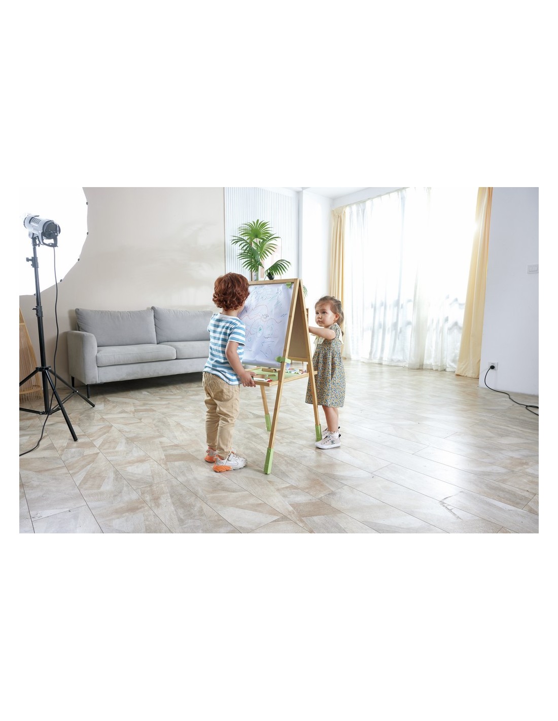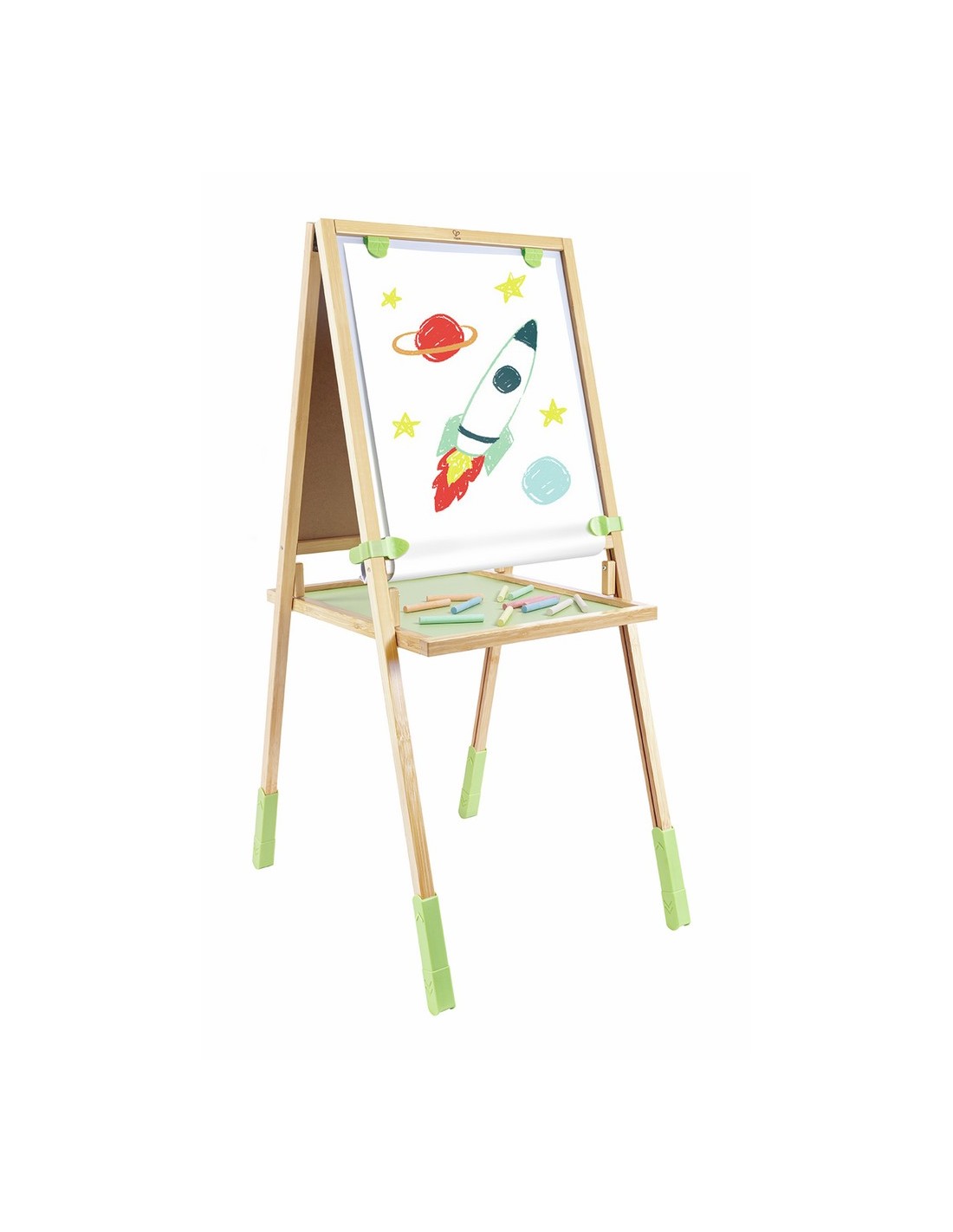 Una fantástica pizarra de doble cara y fácil montaje. Puedes girarla para elegir entre la pizarra negra, la pizarra blanca magnética o el papel. El diseño de doble cara permite que dos niños jueguen al mismo tiempo. Tiene un sistema de altura regulable permite ajustarlo a la estatura de los niños.
