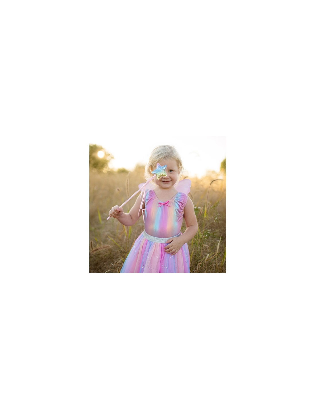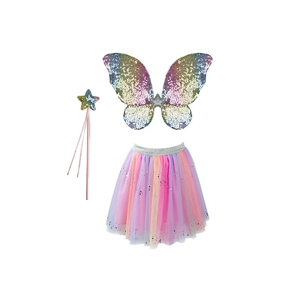 ste conjunto incluye una falda de lentejuelas brillantes con un diseño de colores del arcoíris, acompañada de unas alas decoradas con detalles de lentejuelas y una varita mágica a juego. Es un conjunto perfecto para disfraces o para momentos especiales.