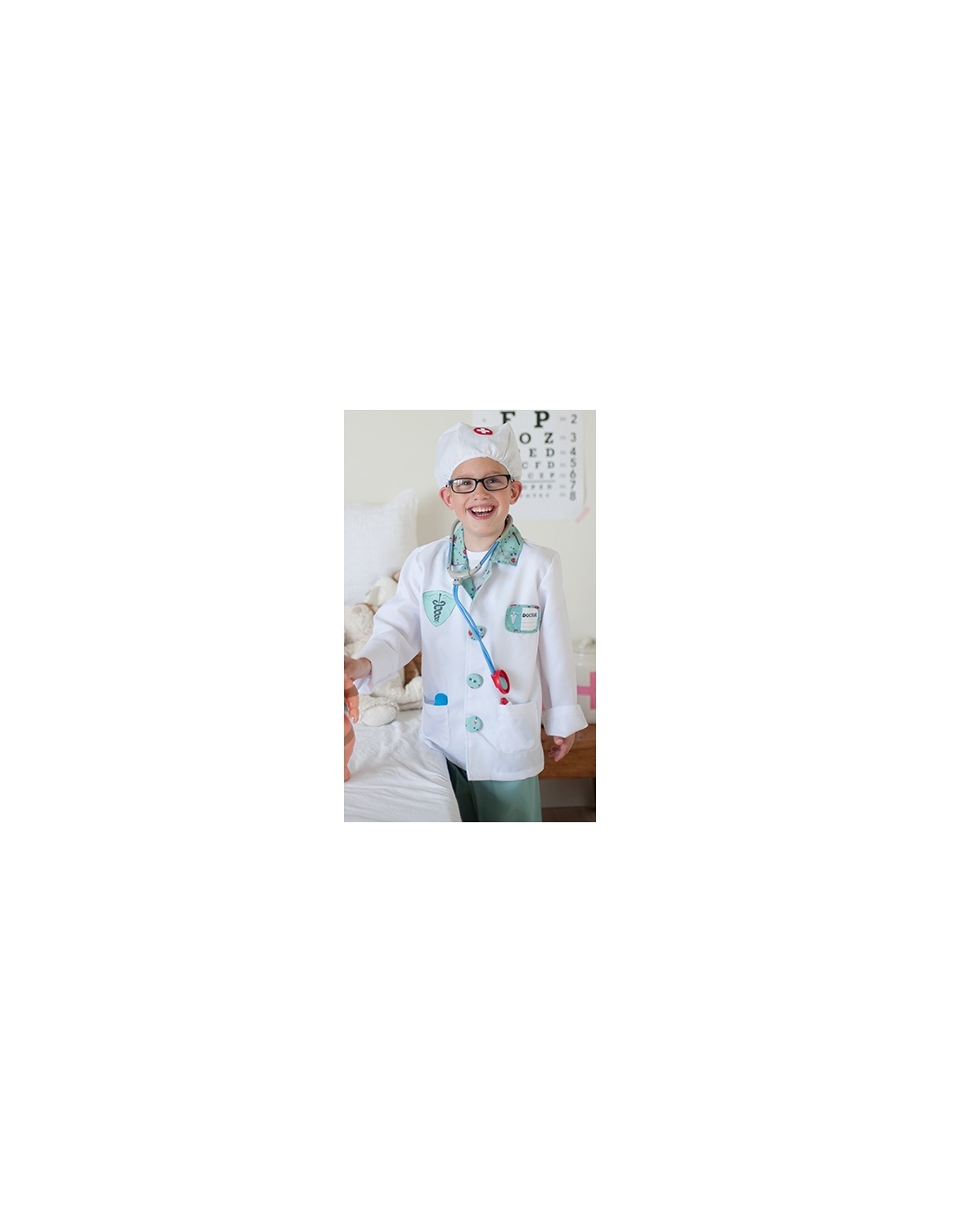 Este disfraz incluye una bata de doctor de color verde y varios accesorios médicos, como un estetoscopio y otros utensilios relacionados con la profesión. Ideal para niños de 5 a 6 años, este conjunto permite que los pequeños jueguen a ser médicos y aprendan sobre el cuidado de la salud de una manera divertida y educativa. Perfecto para juegos de rol o disfraces.