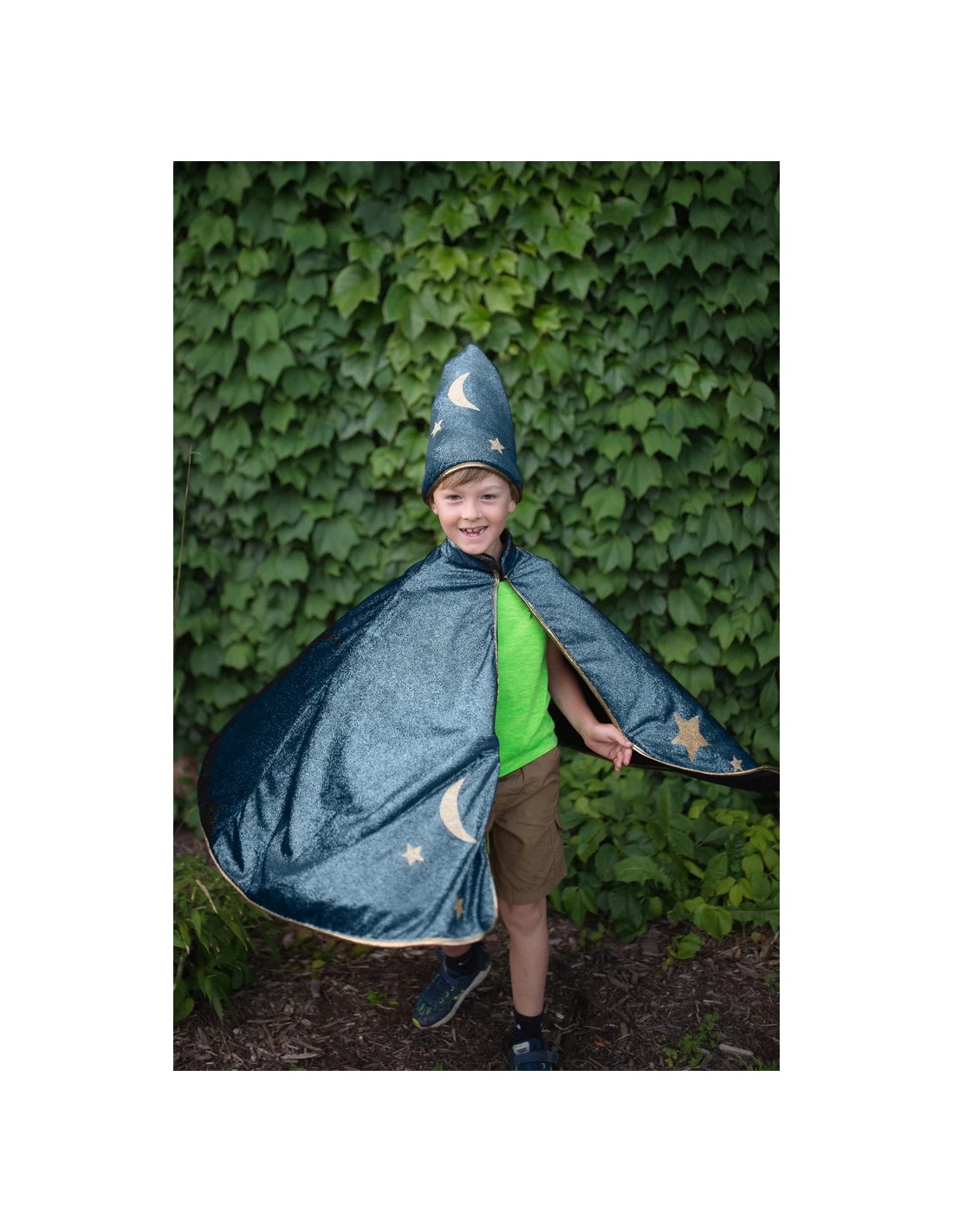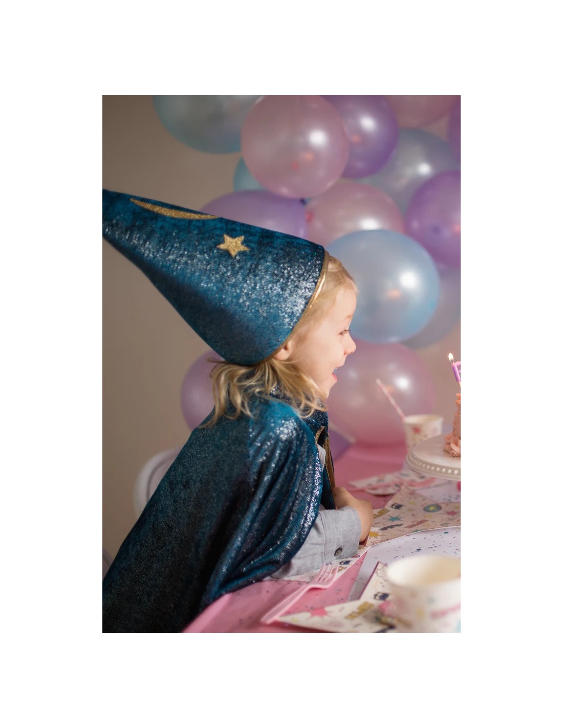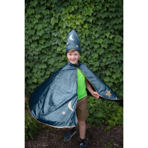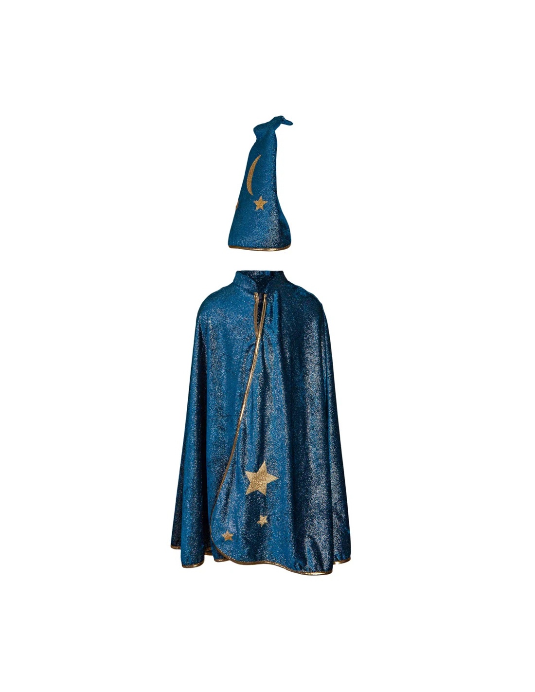 Una capa con estrellas brillantes reversible color azul fuerte. Con este disfraz se convertirán en auténticos hechiceros.