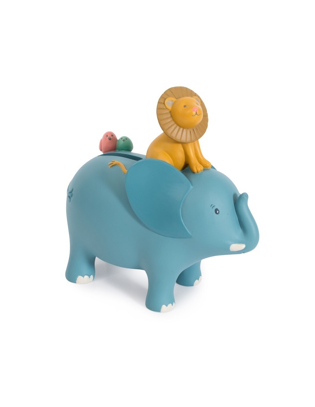 Qué mejor manera que guardar las monedas en una hucha donde un elefante, un león y unos pequeños pájaros serán los guardianes de los ahorros.