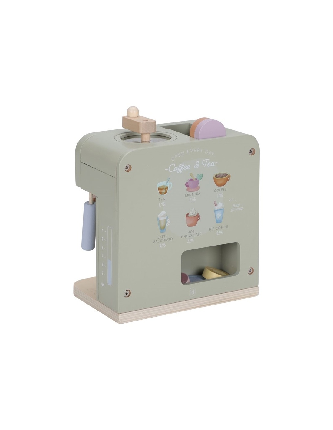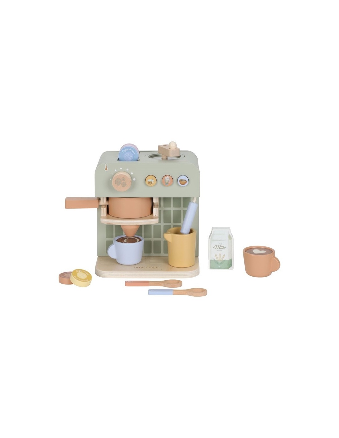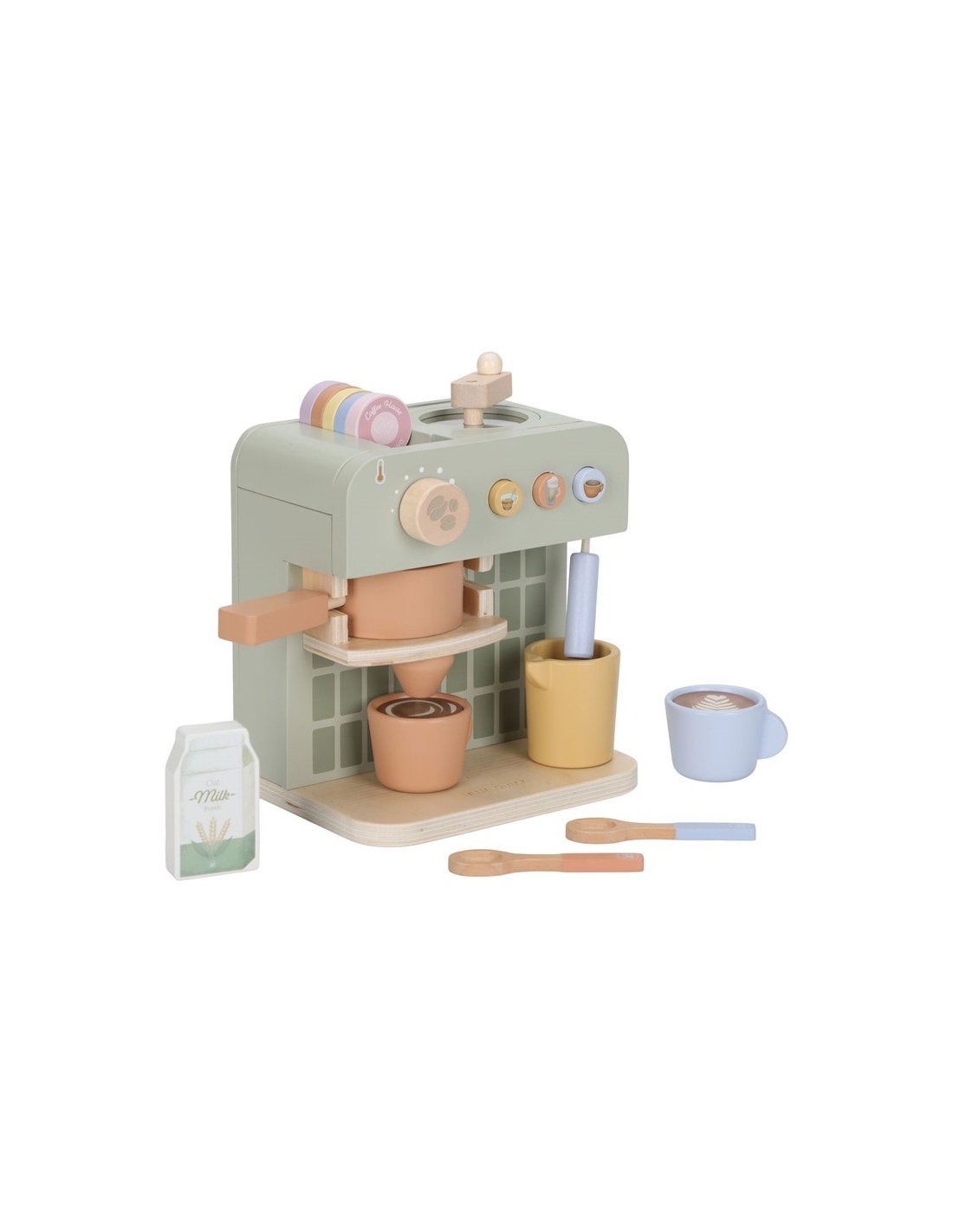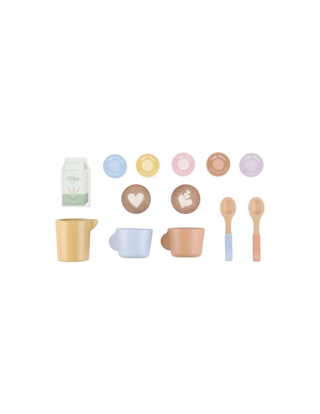 ¡Hora de una deliciosa taza de café o té! Con esta cafetera de madera, los pequeños baristas pueden moler granos, insertar cápsulas de café y remover su bebida con una cuchara. El set incluye dos tazas, dos cucharas, una jarra de leche, cartones de leche e incluso plantillas de capuchino para una auténtica experiencia de café. La parte trasera de la máquina presenta alegres ilustraciones. ¡Perfecta para combinar con el rincón de juego de café y divertirse aún más! ¿Hoy será café o té?