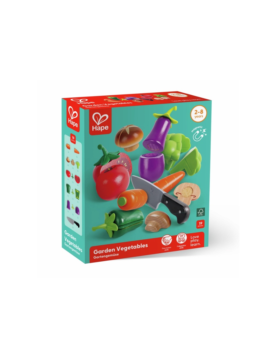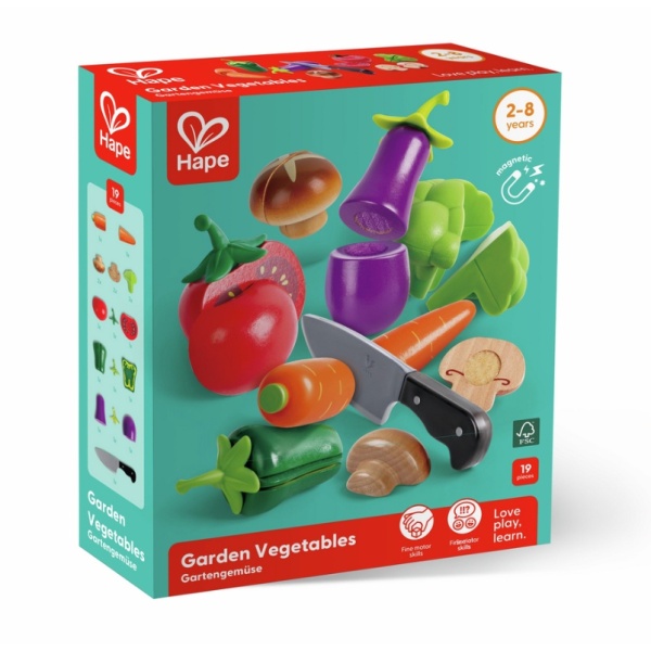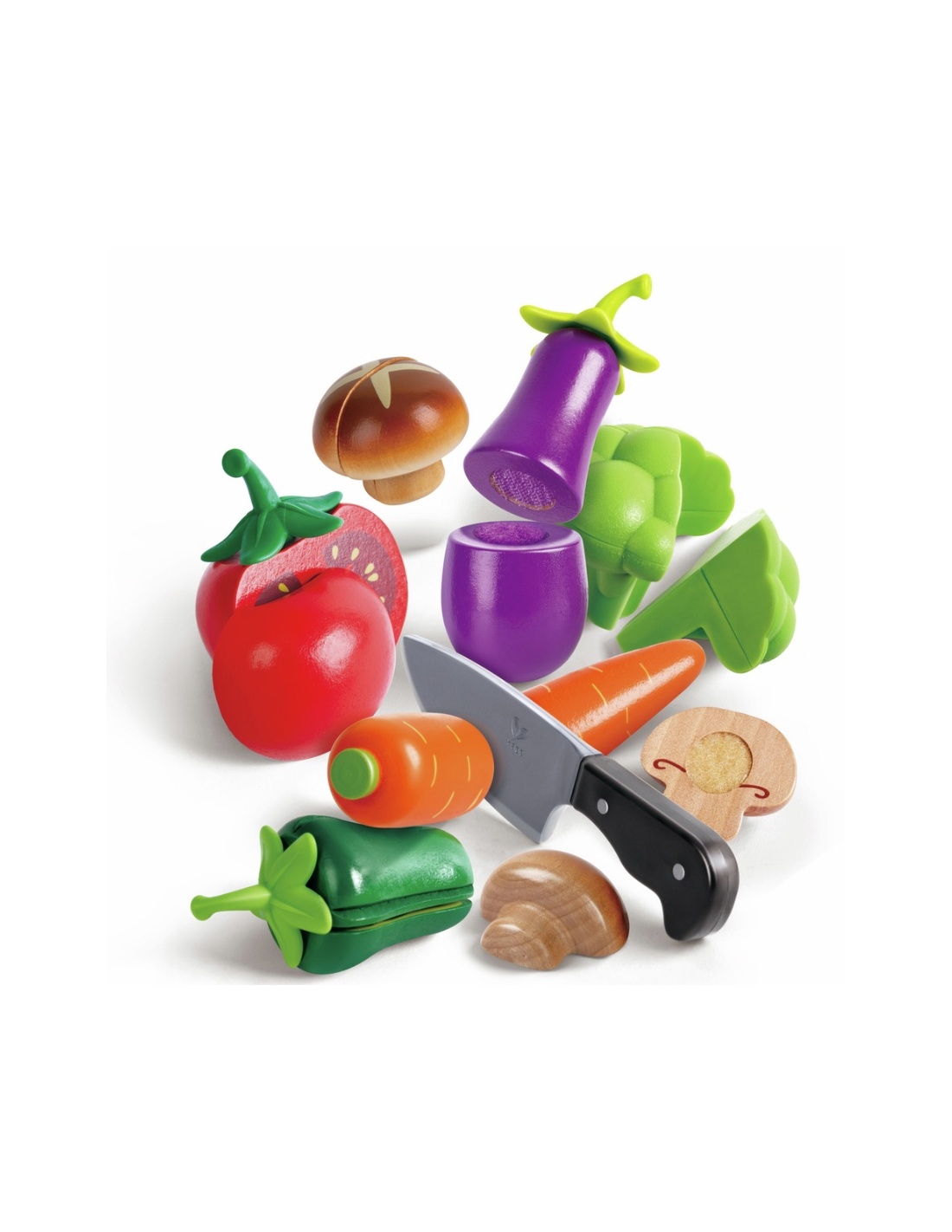 ¡No hay nada más sano que las verduras frescas! Recorta los tallos y luego utiliza el cuchillo de juego para cortar el pimiento verde, el tomate y mucho más. Las verduras se mantienen unidas con lengüetas autoadhesivas y se separan para mayor realismo.