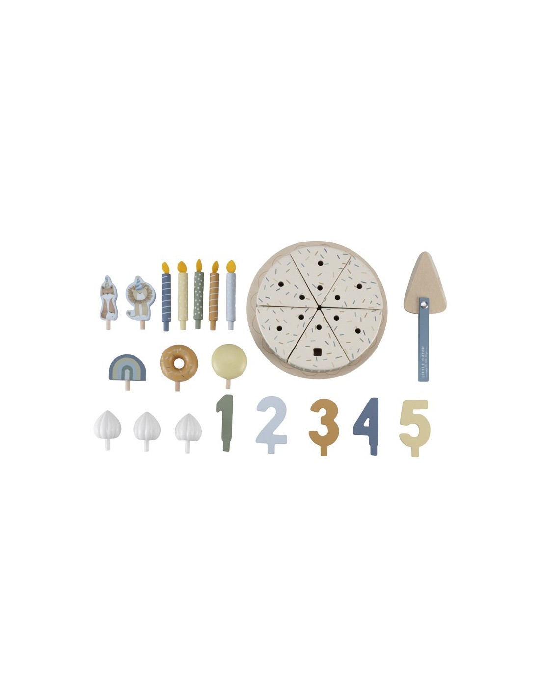 El set incluye: 6 porciones de pastel separadas con velcro, pala para servir, donut, macaron, zorro, león, arcoíris, velas, nata montada para el topping y número del 1 al 5.