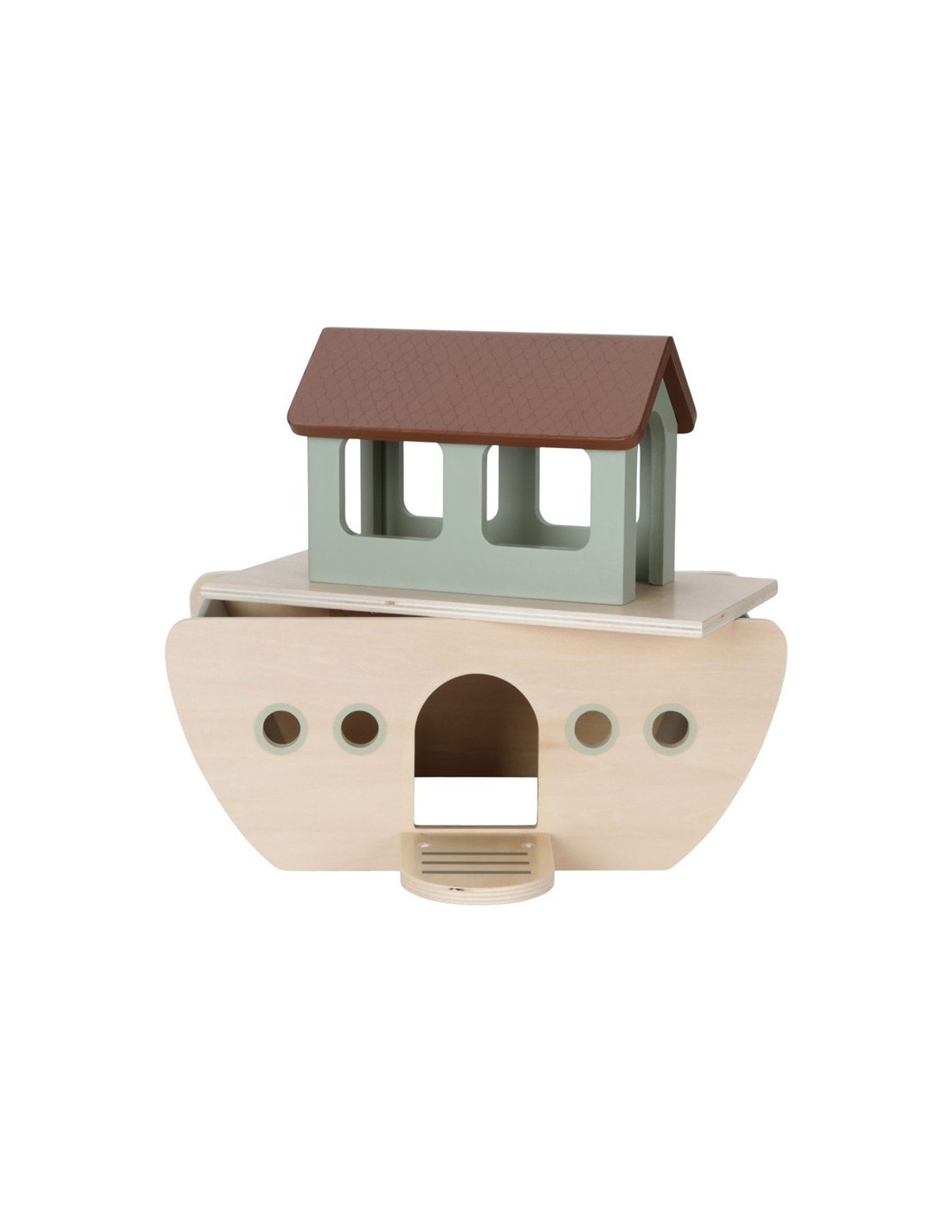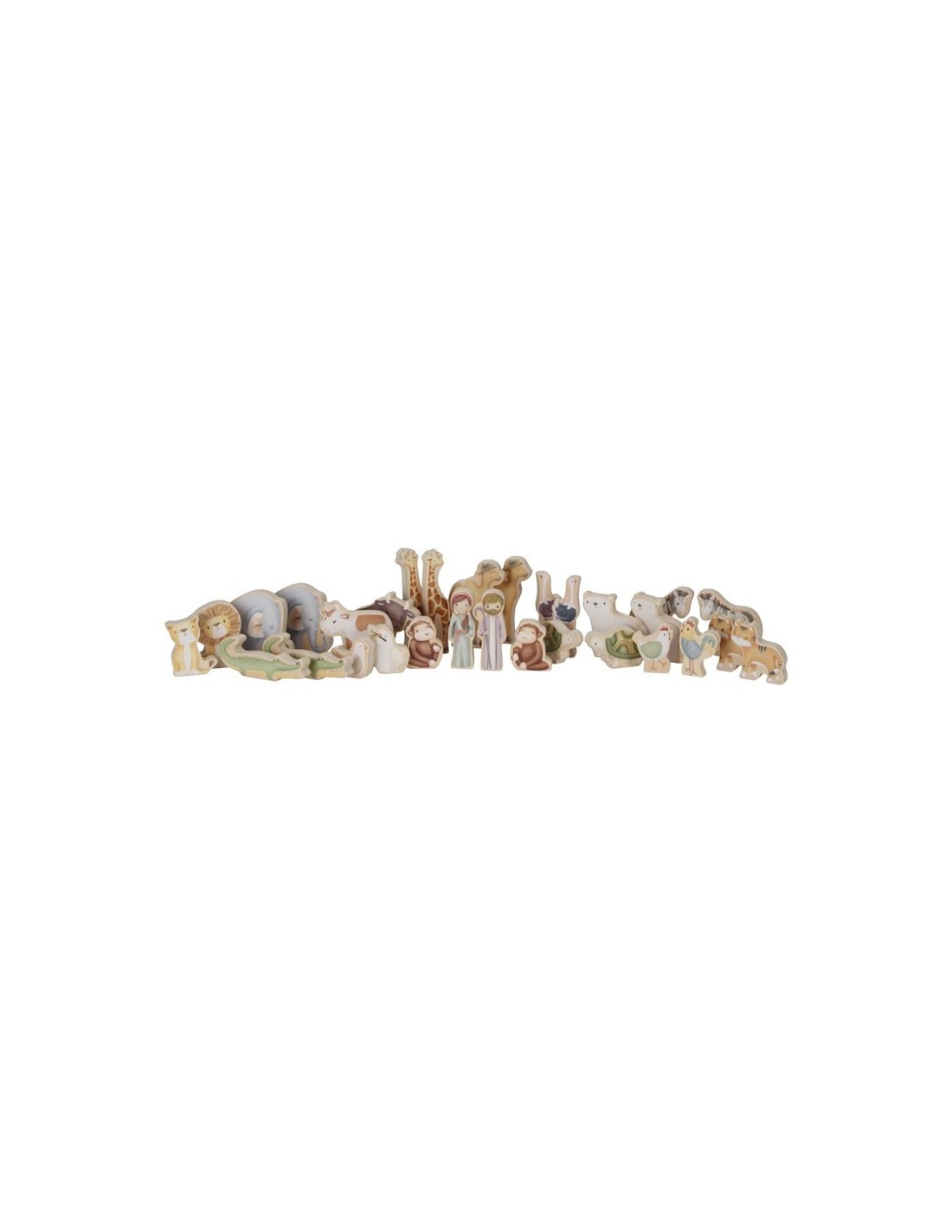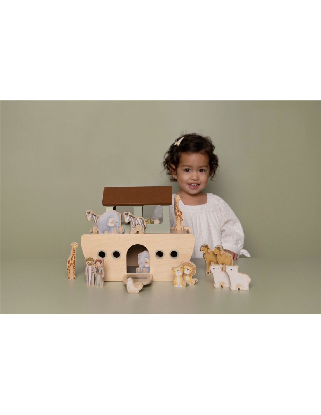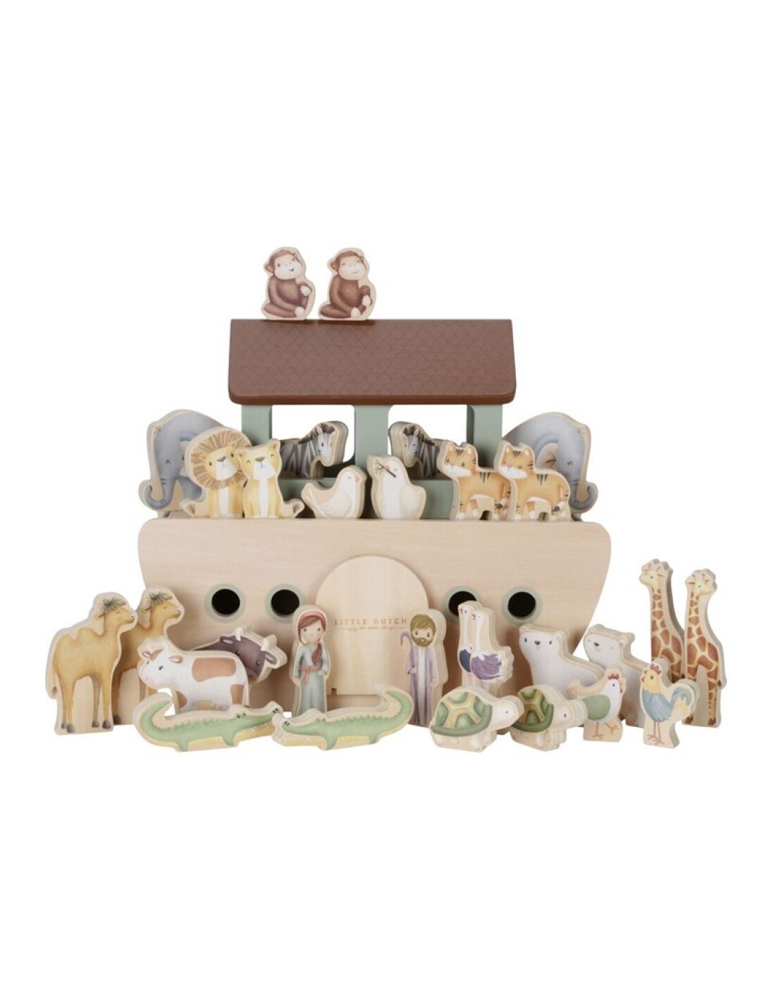 Un juego de madera del arca de Noé que incluye dos personajes y 28 animales: palomas, gallina, gallo, tortugas, monos, leones, avestruces, tigres, vaca y toro, osos polares, cocodrilos, jirafas, cebras, elefantes y camellos. Este set favorece el juego simbólico y desarrolla la imaginación y el vocabulario a través de una historia clásica.