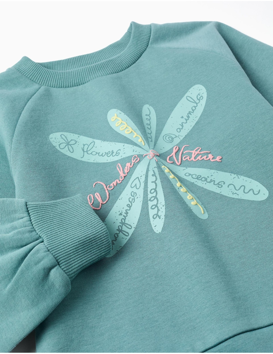 Sudadera verde claro para niña, confeccionada en una suave mezcla de algodón que brinda una sensación agradable al tacto y total comodidad. Su interior perchado proporciona un abrigo extra, ideal para los días más frescos. Destaca por su estampado frontal en relieve, que le da un toque original y divertido.