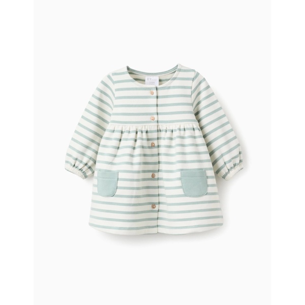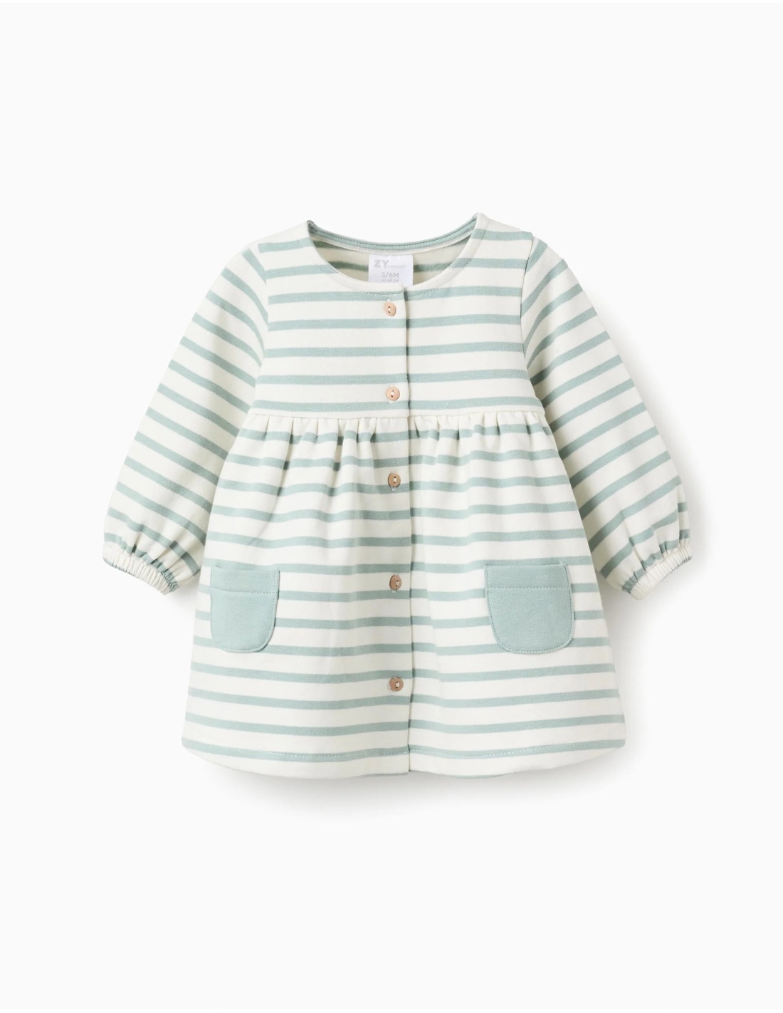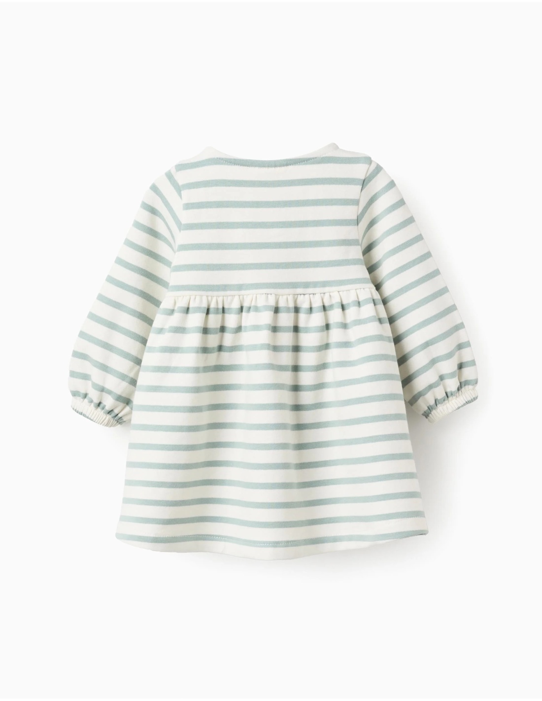 Vestido a rayas blancas y verde agua para recién nacida, con un delicado interior perchado que ofrece una sensación cálida y suave, perfecta para mantenerla cómoda en todo momento.