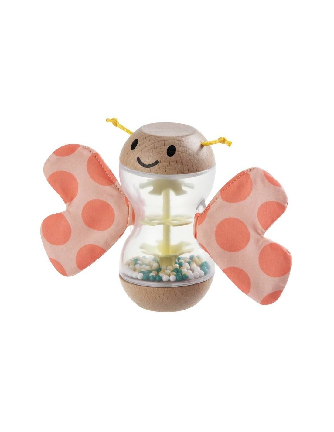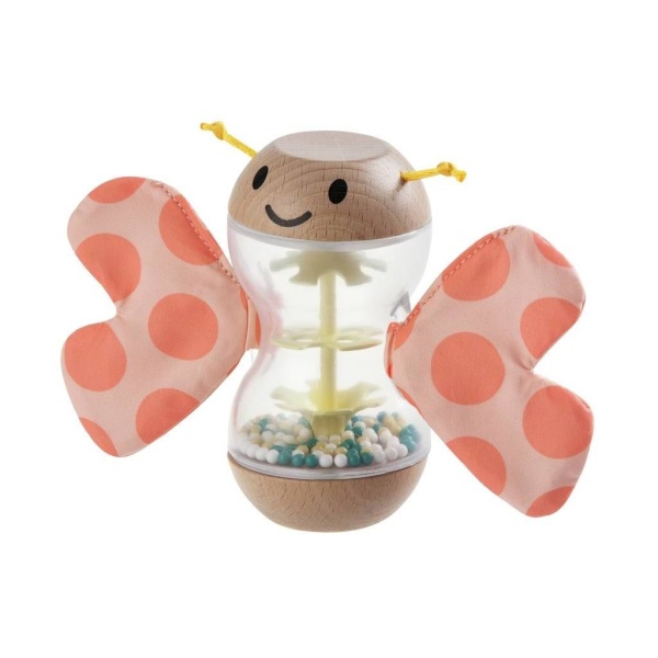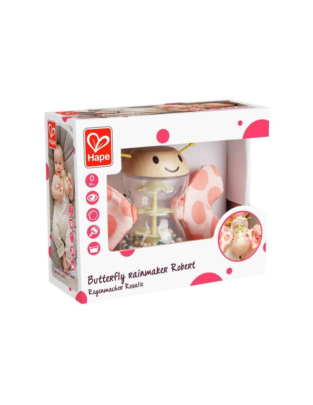 El creador de lluvia Butterfly Robert es un juguete multifuncional para niños. Combina materiales como textil, madera y plástico, estimulando el agarre. Sus perlas que caen simulan la lluvia, mientras que el papel de aluminio en las alas genera un sonido crujiente. Además, sus alas son extraíbles y lavables, y puede usarse como sonajero.