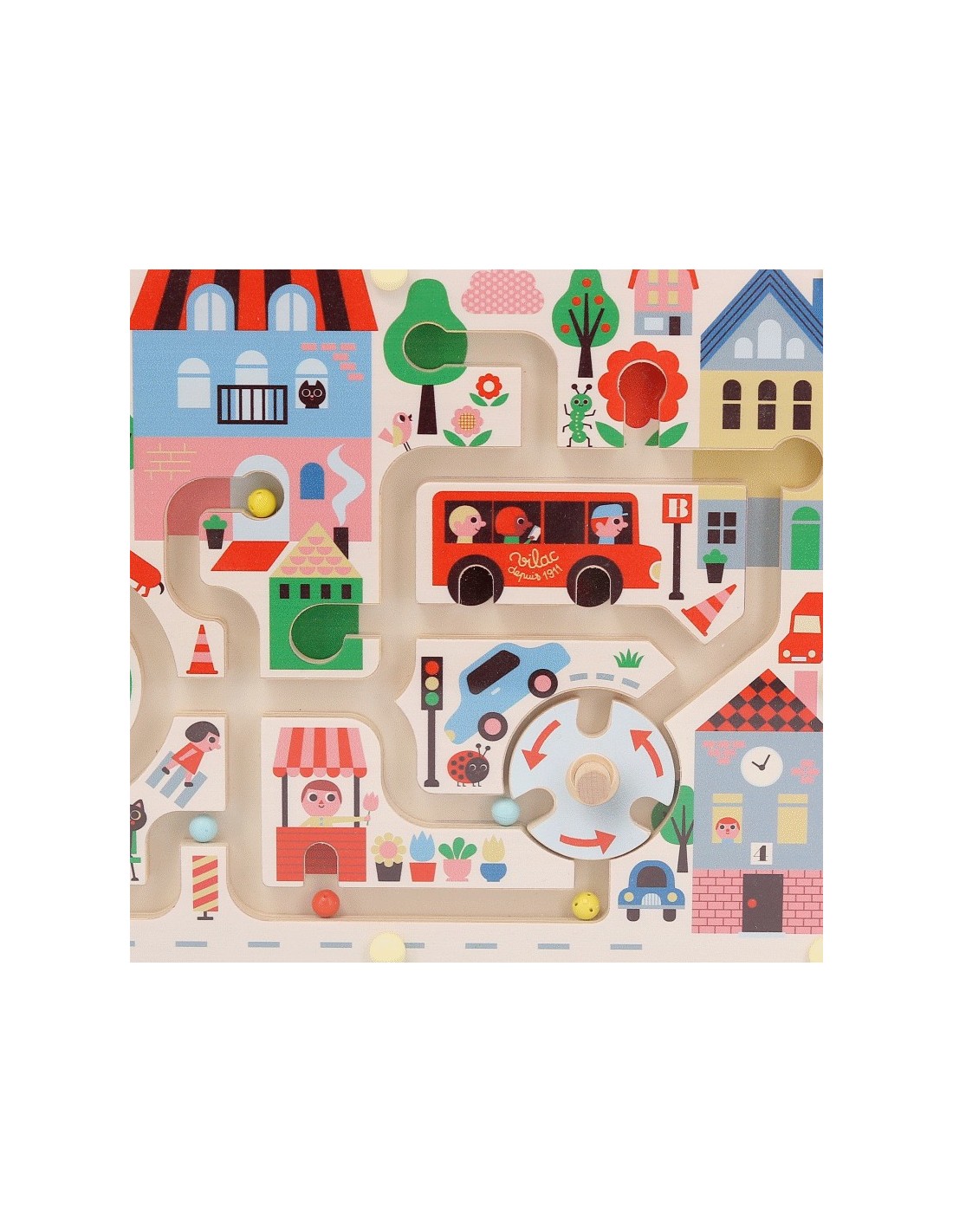 Con un pequeño lápiz magnético, tu peque hace viajar las bolas de colores de una calle a otra: una bola verde en un árbol, una roja en la flor, otras dos en las ruedas del autobús. ¡Es aún más divertido cuando pasas por la rotonda que tienes que activar!