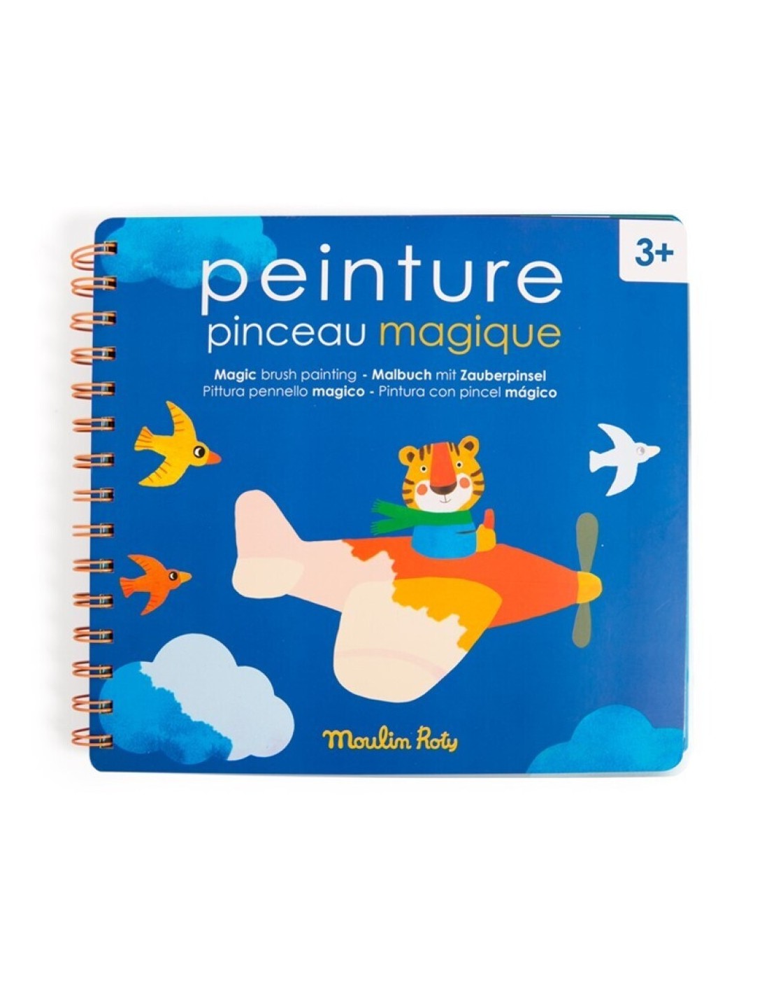 Un libro de 10 ilustraciones con un pincel con reserva de agua que al pintar en la zona en blanco aparece el color para luego desaparecer en unos minutos.