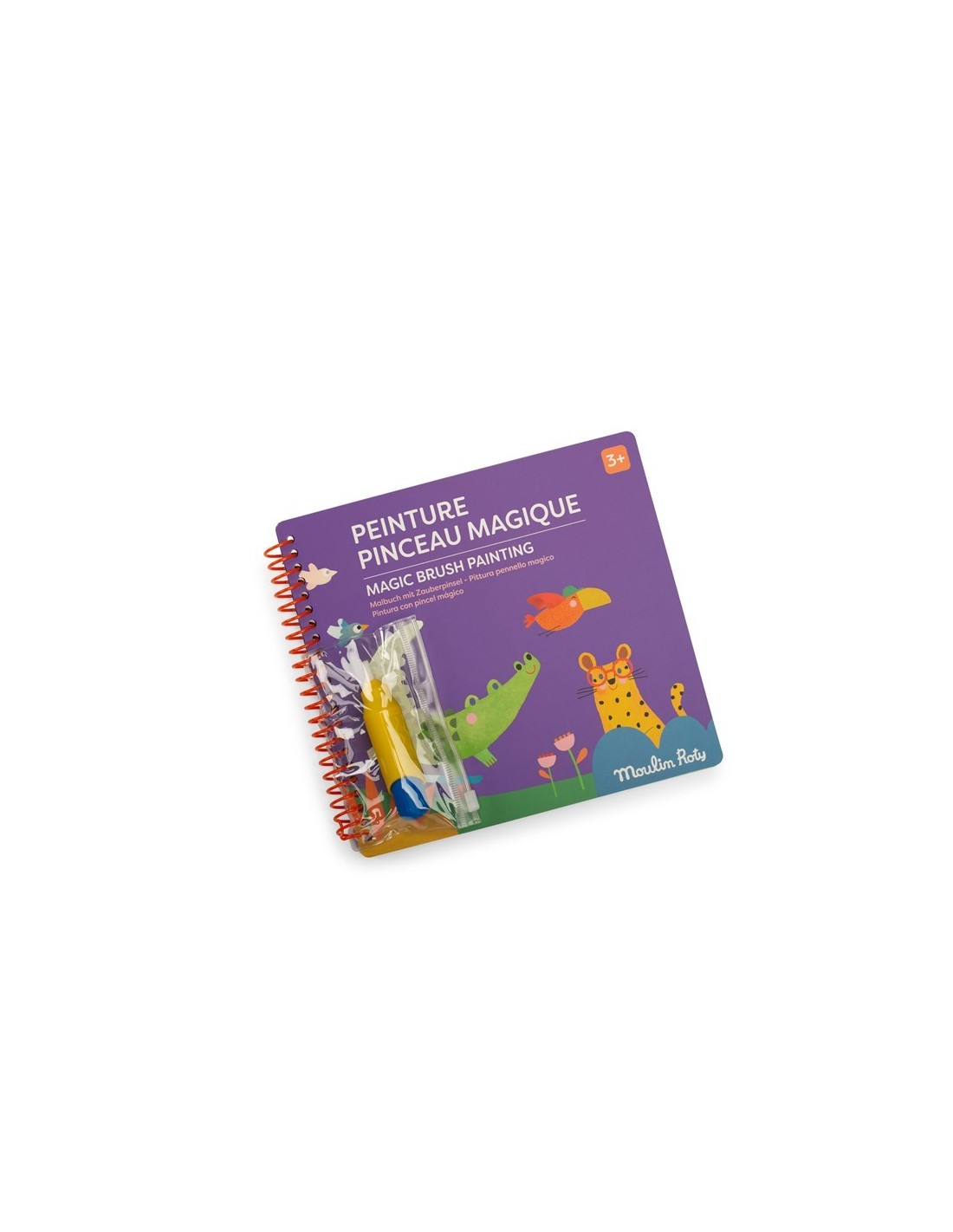 Un libro de 10 ilustraciones con un pincel con reserva de agua que al pintar en la zona en blanco aparece el color para luego desaparecer en unos minutos.