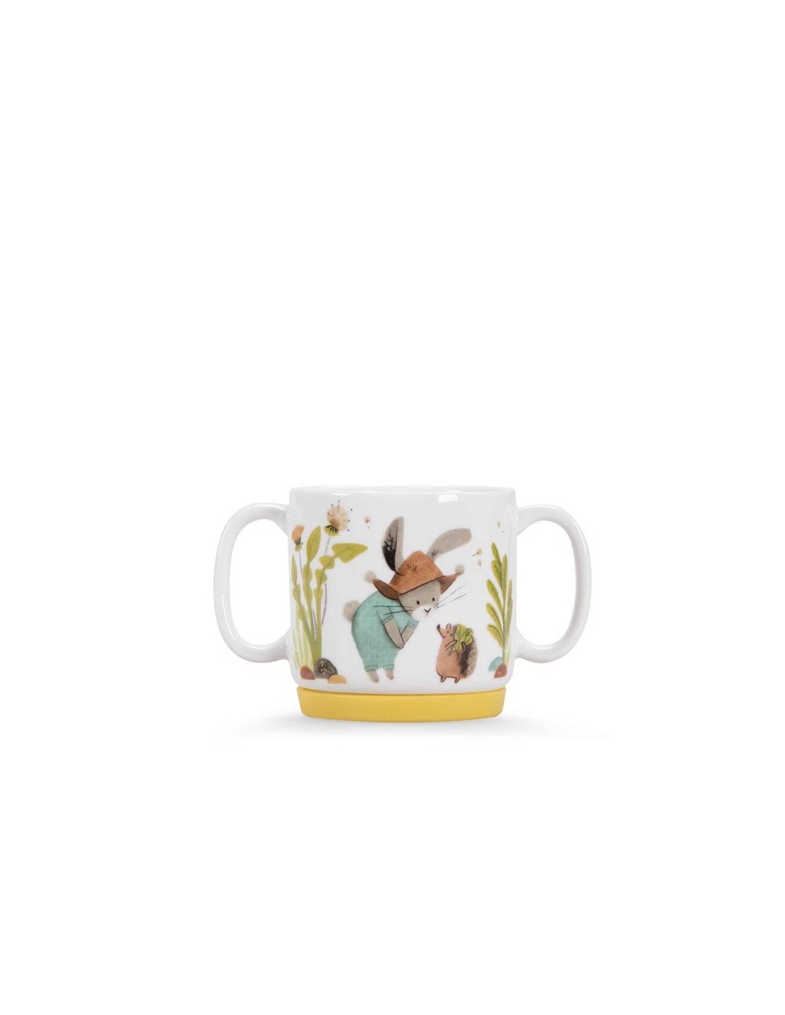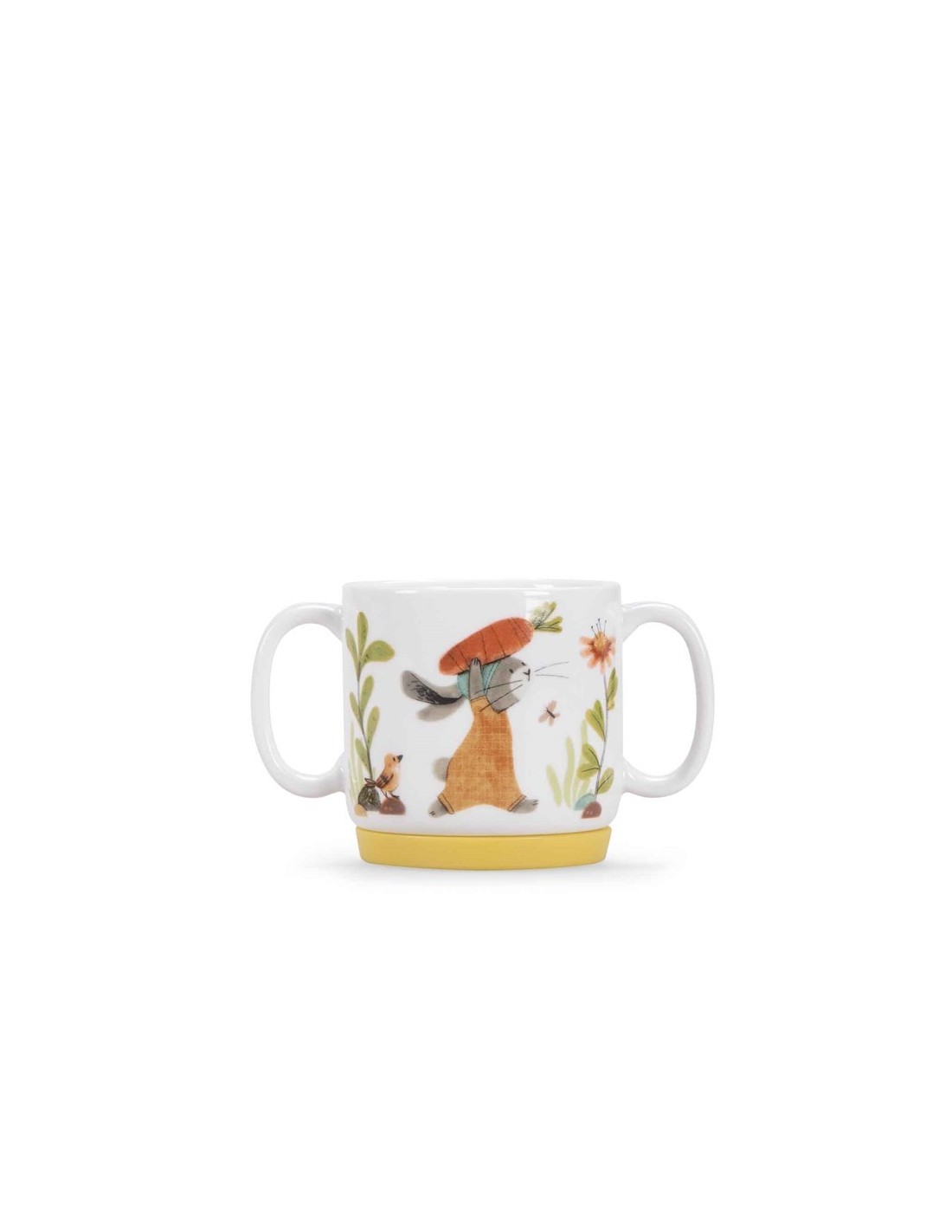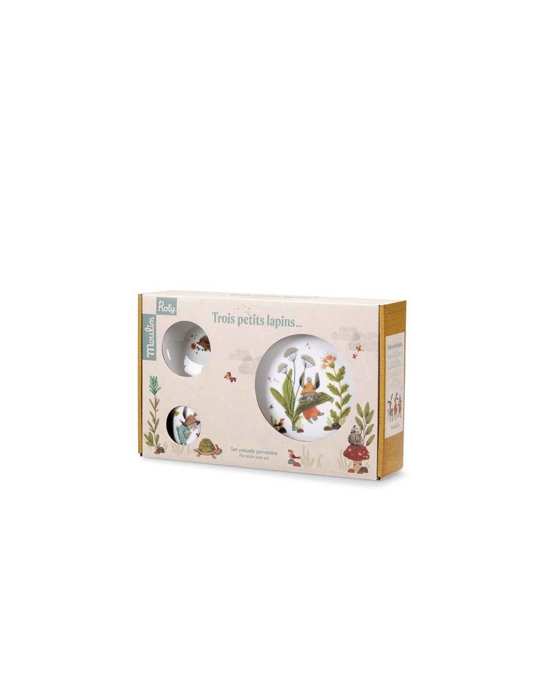 Una preciosa vajilla con ilustraciones de la colección de Petits Lapins de Moulin Roty. Incluye un bol, una taza con asas y un plato con bases de silicona para mayor comodidad a la hora de comer.