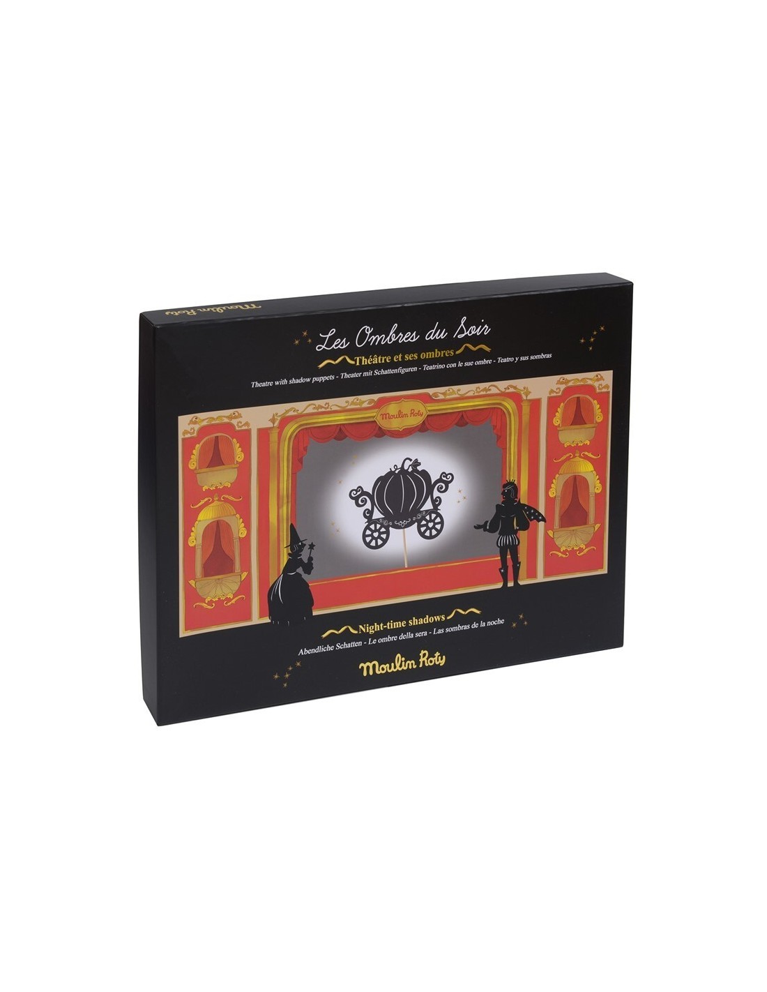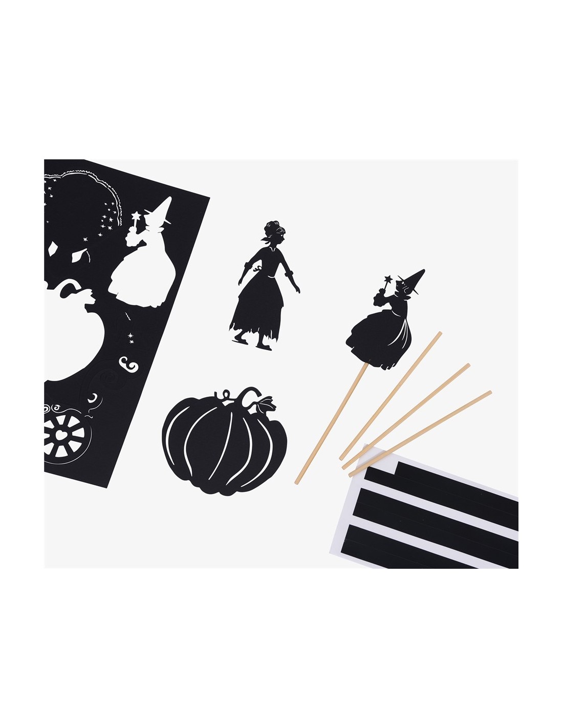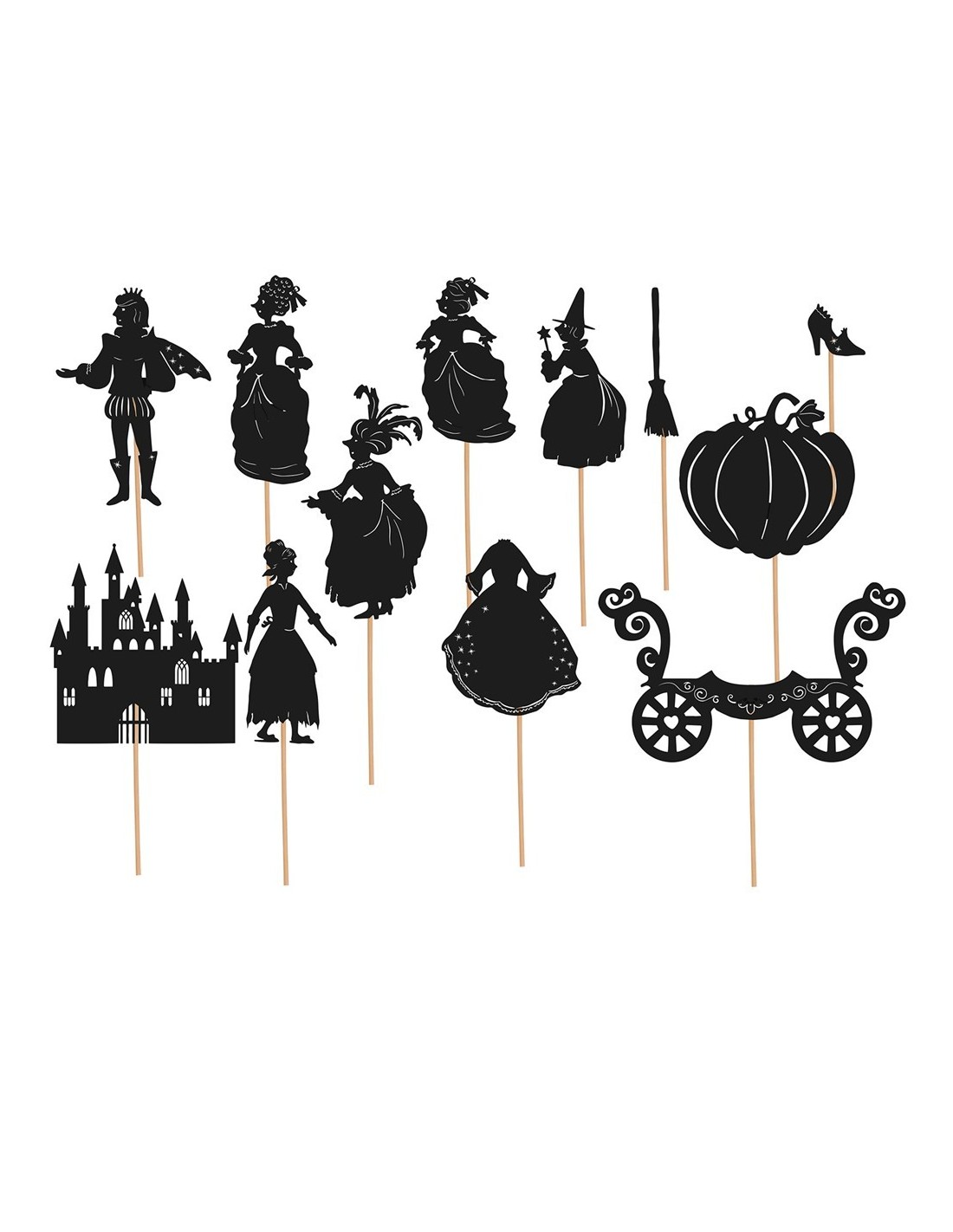 Un teatro de cartón, 2 escenarios de fondo y 12 siluetas del cuento de Cenicienta para crear historias cuando llegue la noche.