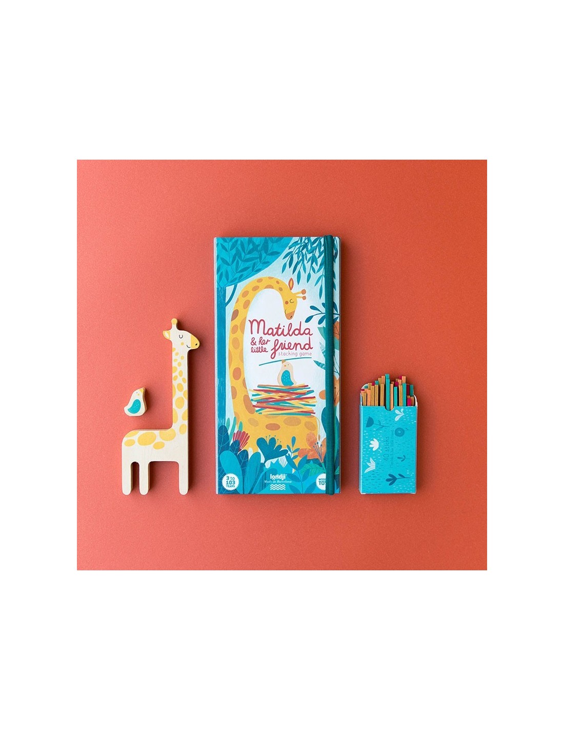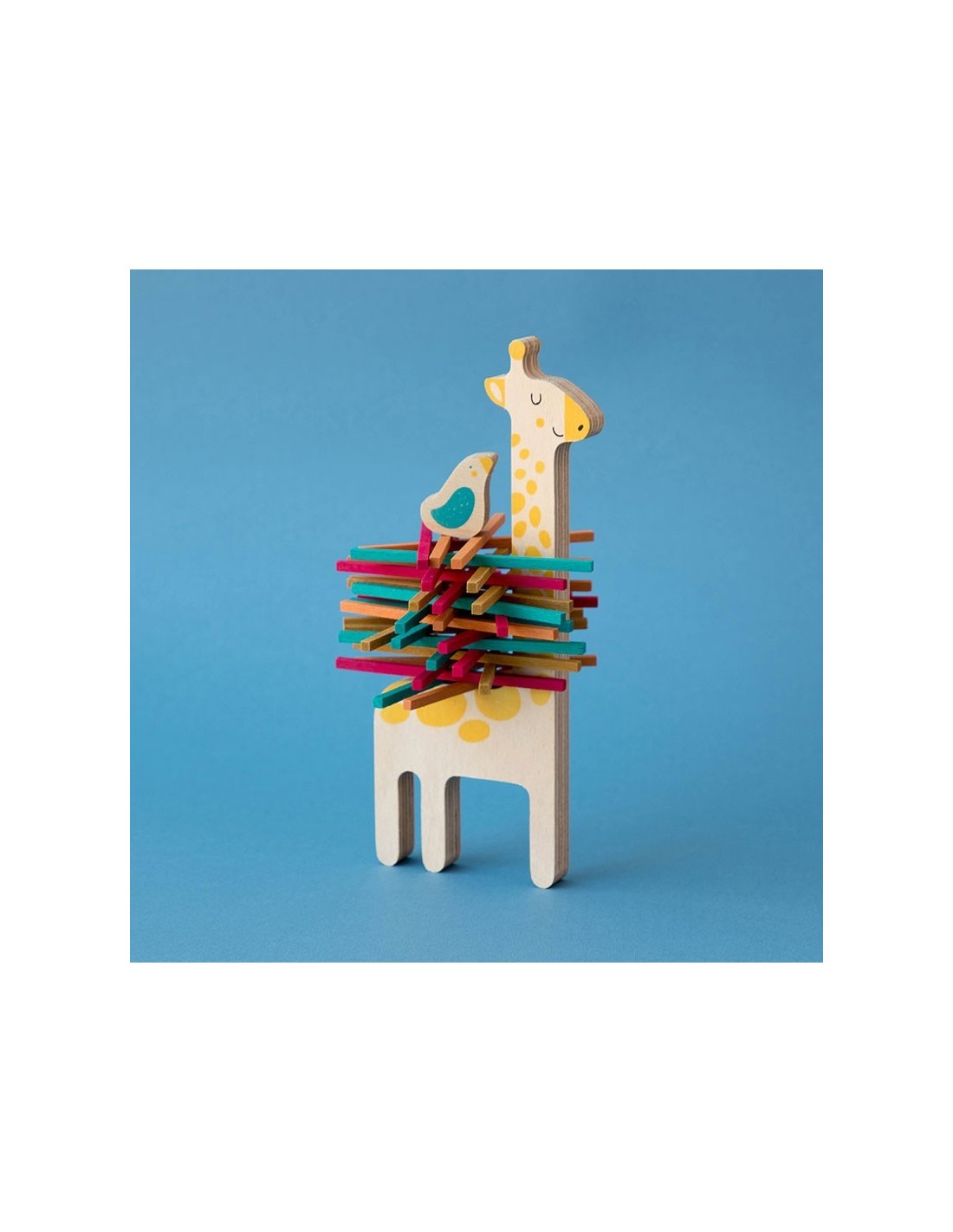 Un juego de equilibrio en el cual se reparten los palos de madera entre los jugadores para ir colocándolos encima de la jirafa. A quien se le caigan los palitos durante su turno los recogerá y se los llevará todos. Gana el que se quede sin ningún bastón, colocando el pajarito encima como signo de triunfo.