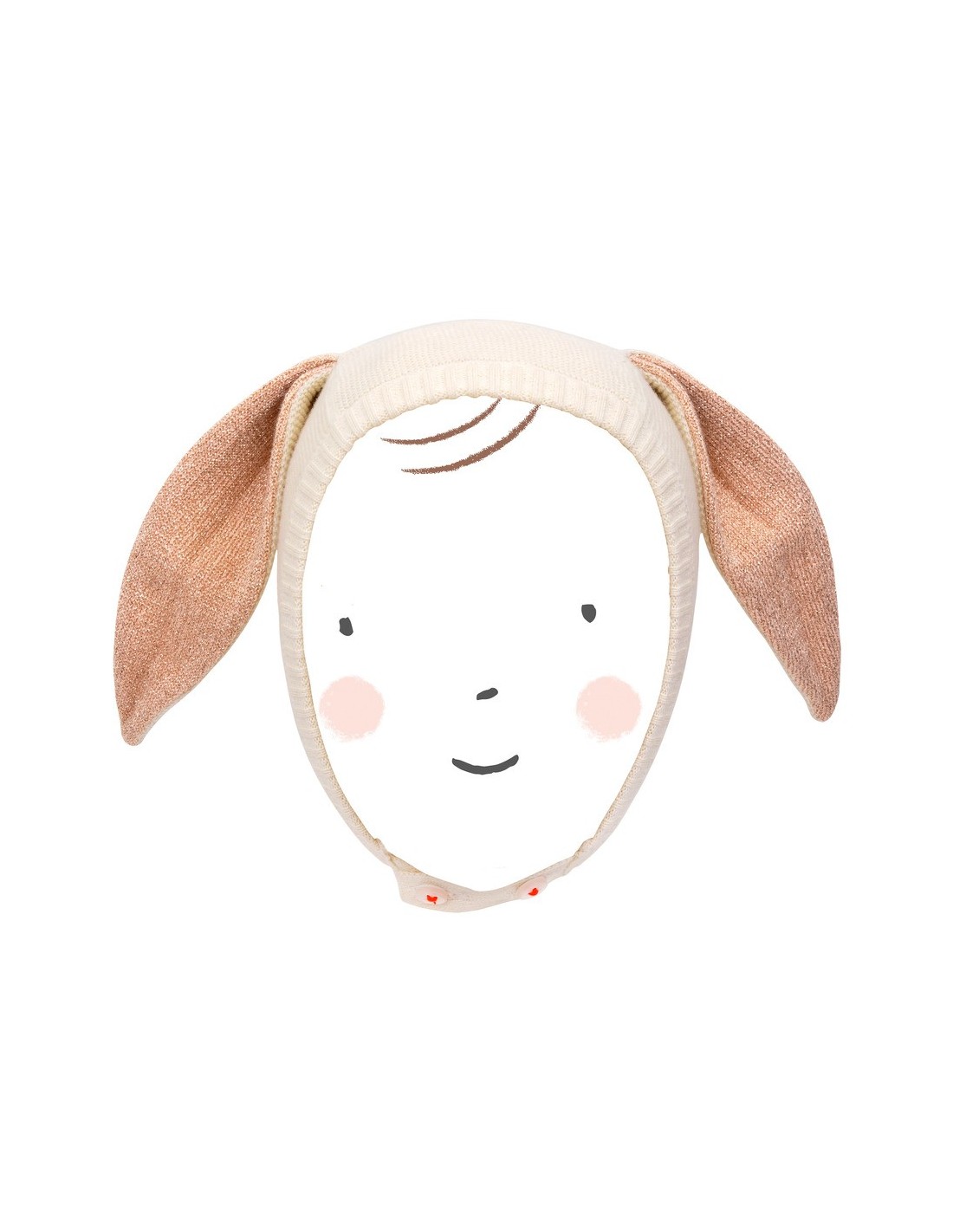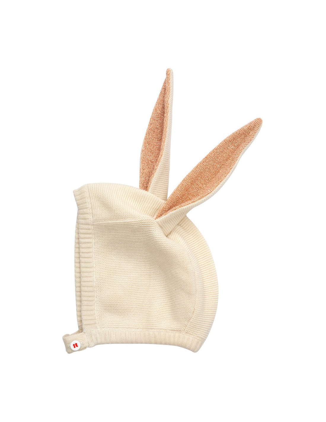 Una adorable capota tejida con algodón orgánico. Con orejas de conejo que en su interior tiene un tejido color rosa.