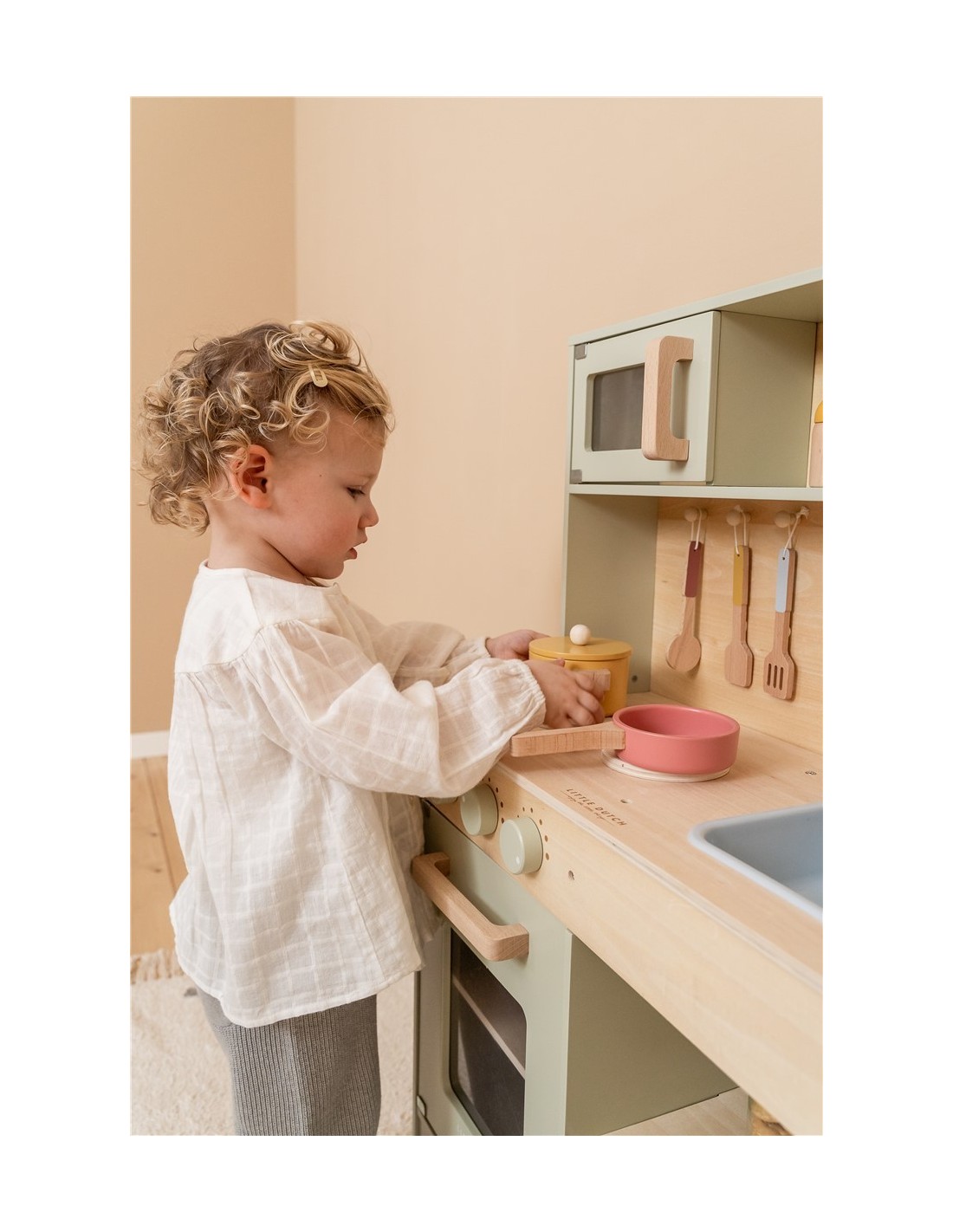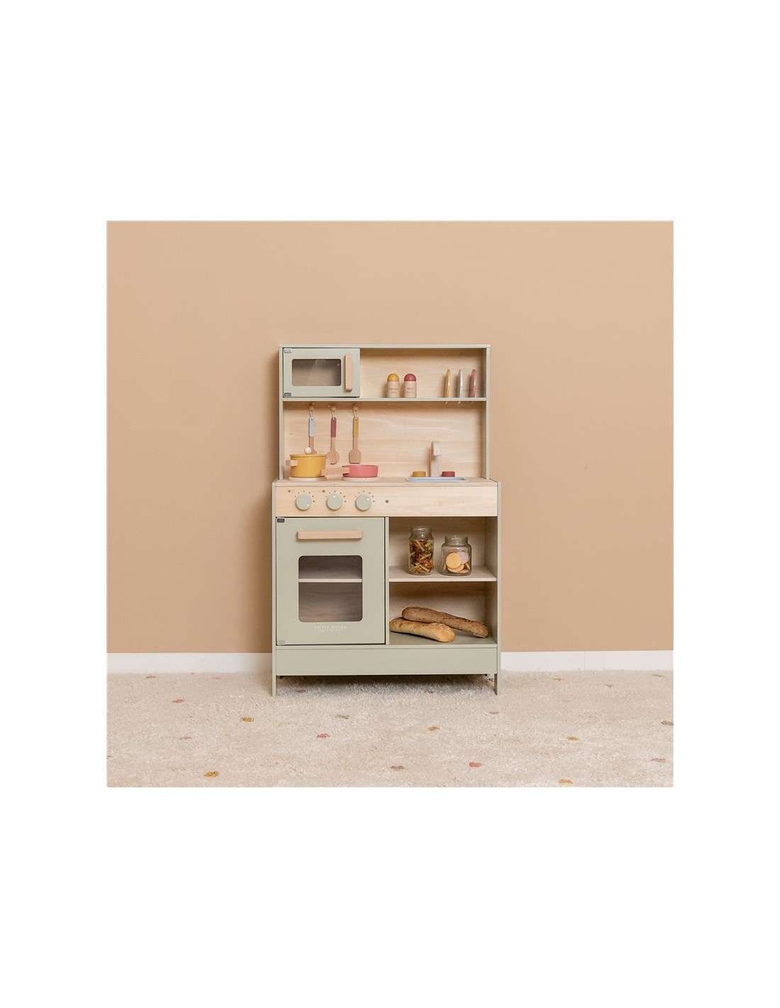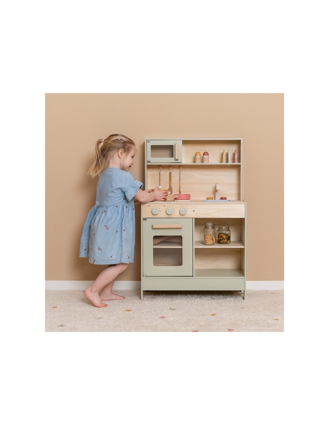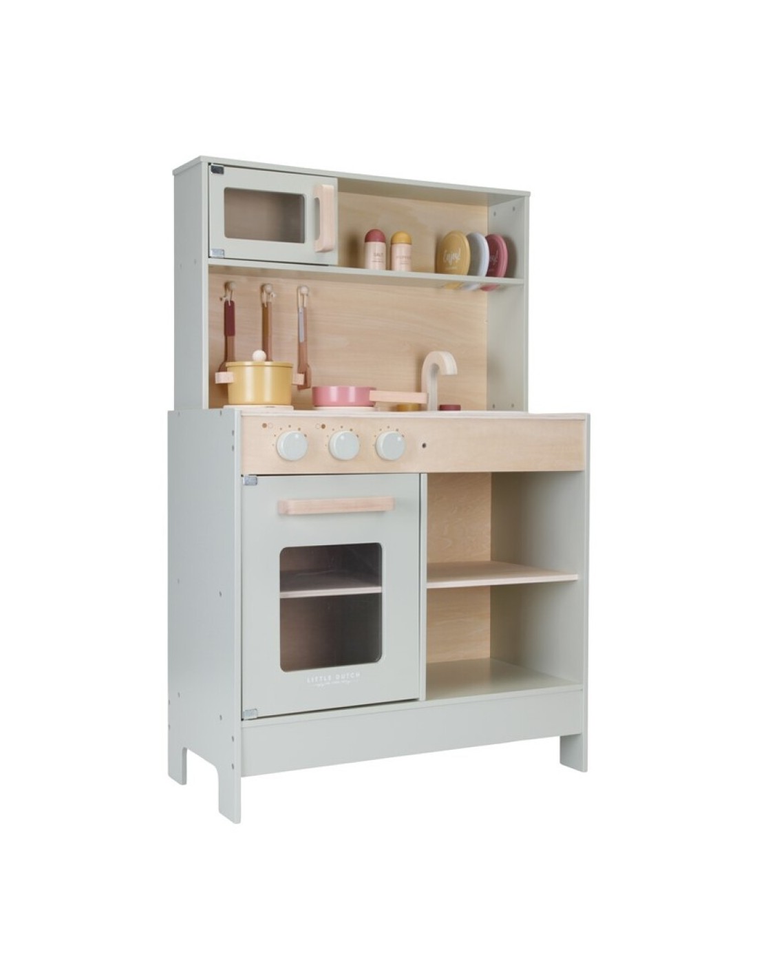 Una cocina de madera color mint con mucho encanto y detalles. Con dos sartenes y una batería de cocina, salero y pimentero, el juego simbólico será más real y enriquecedor.