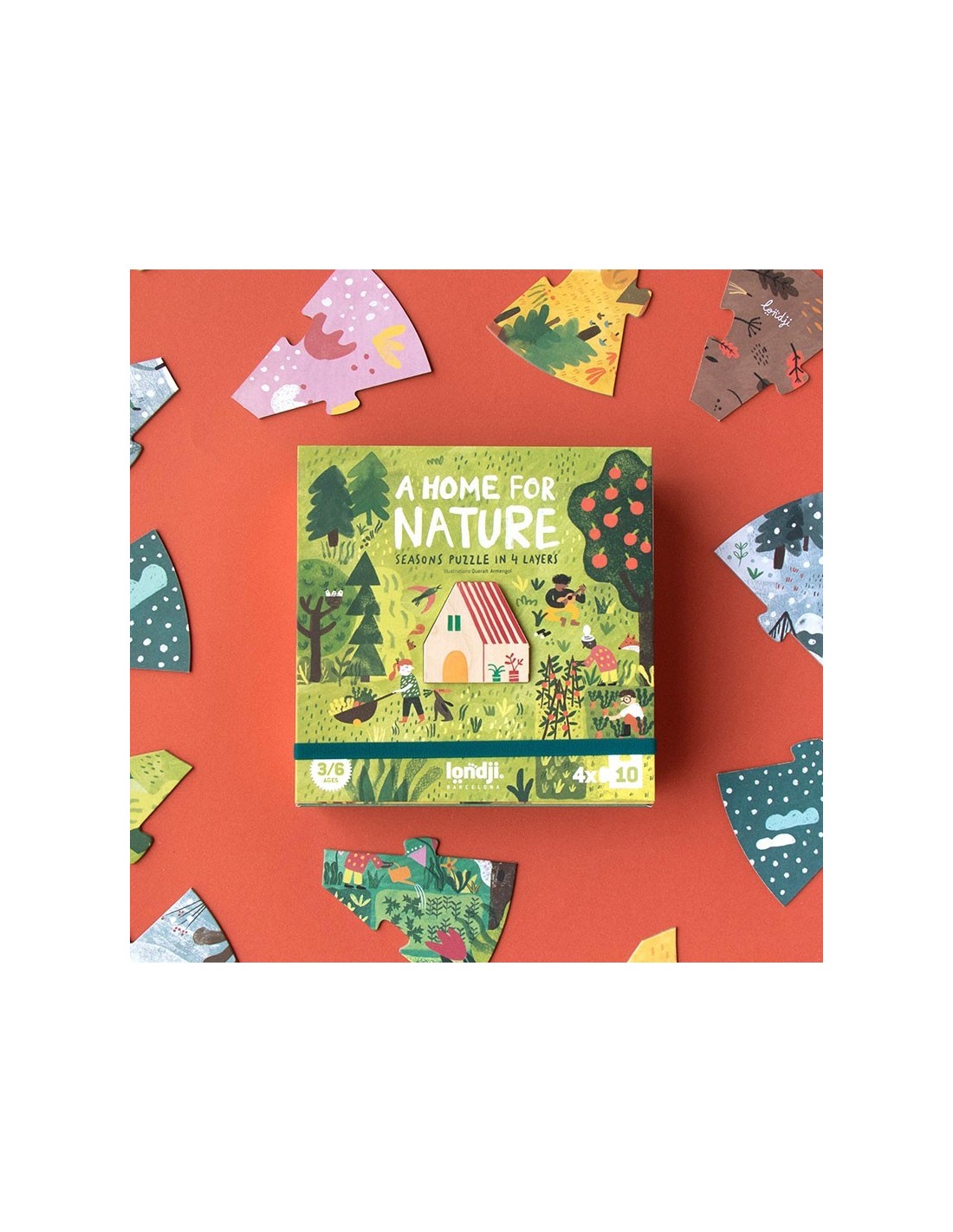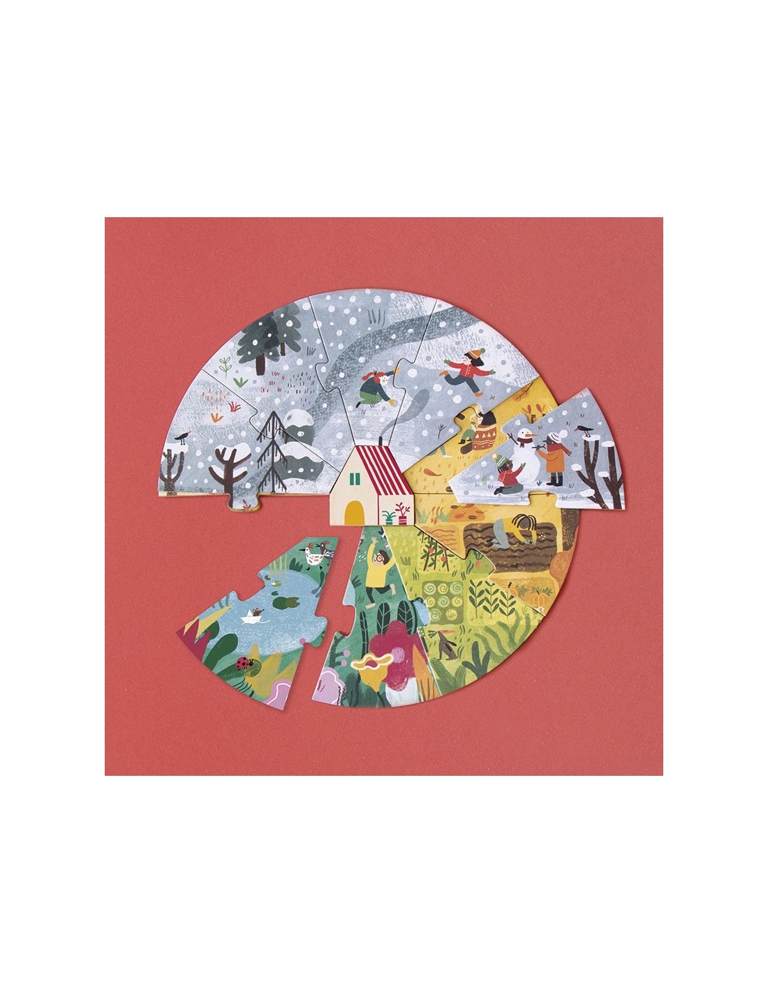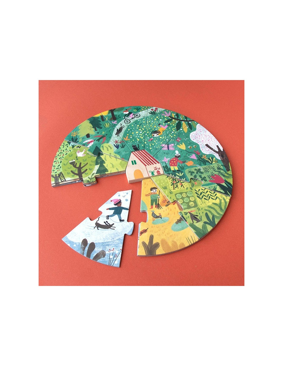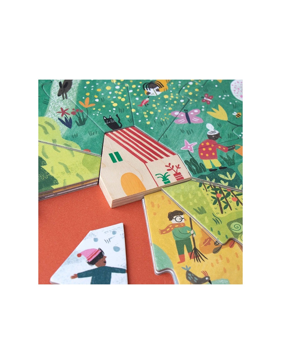 Incluye 4 puzles, de 10 piezas cada uno, que se montan uno sobre otro para ir descubriendo cómo cambia la naturaleza en cada estación, con una casa de madera.