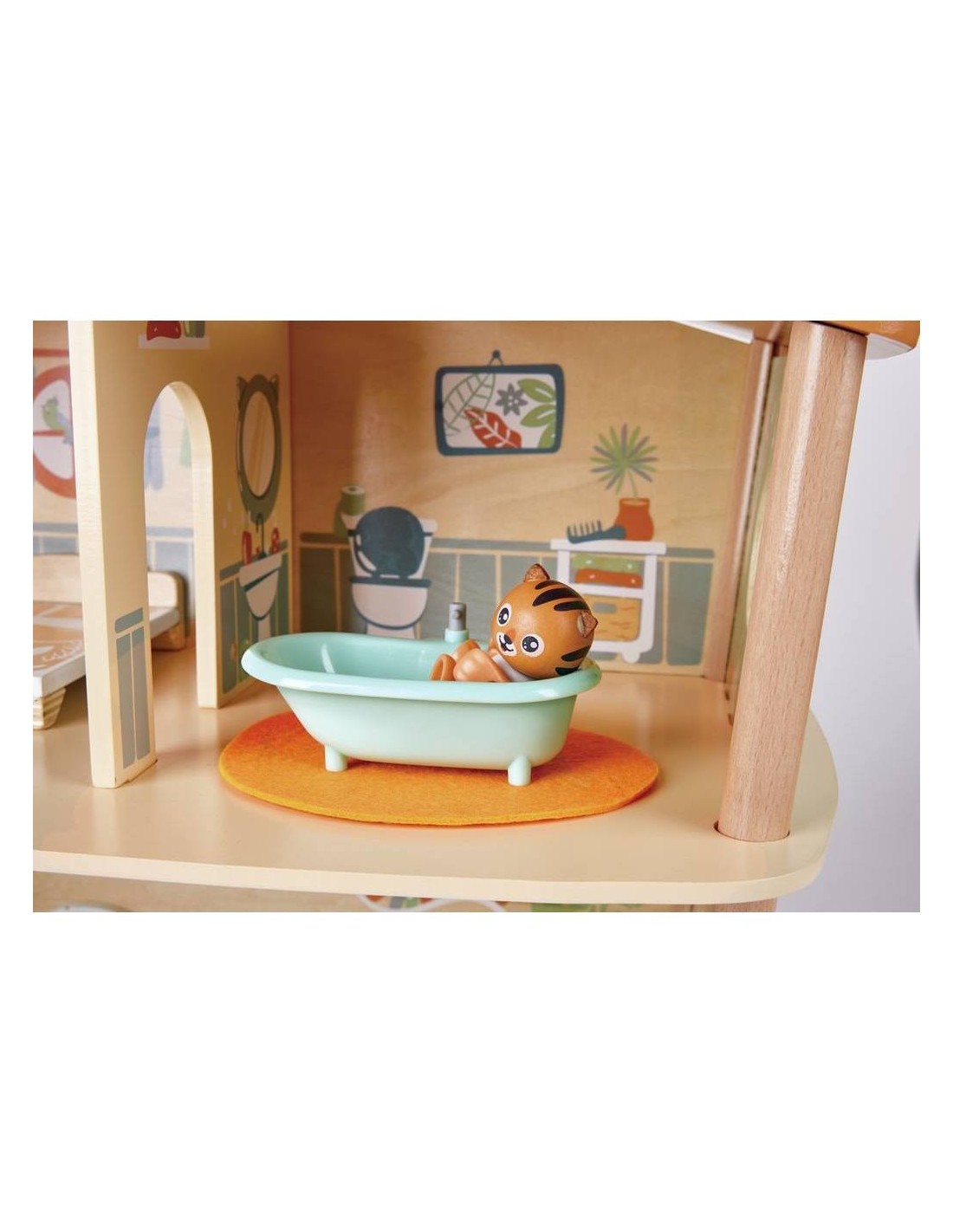 El juego incluye dos muñecos de tigre, una cama, una bañera con alfombra de baño, un sofá, una mesa de té, una sartén, dos platos, dos tazas, una estufa, un tobogán y 18 tarjetas de "basura" para desechar en los tres aberturas de reciclaje.