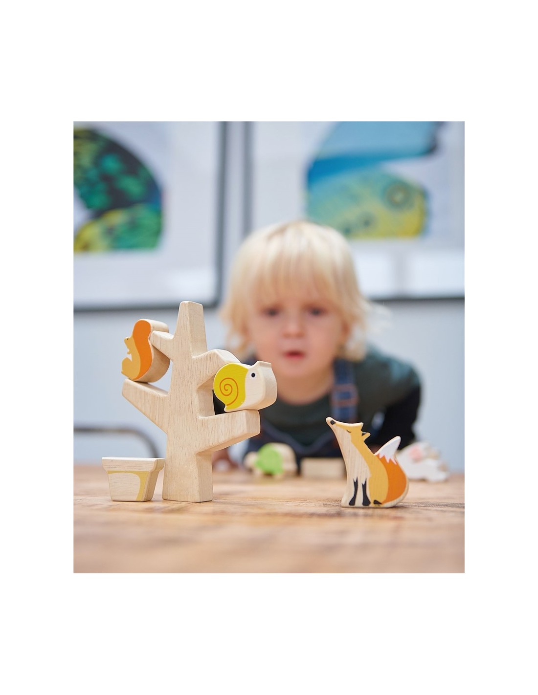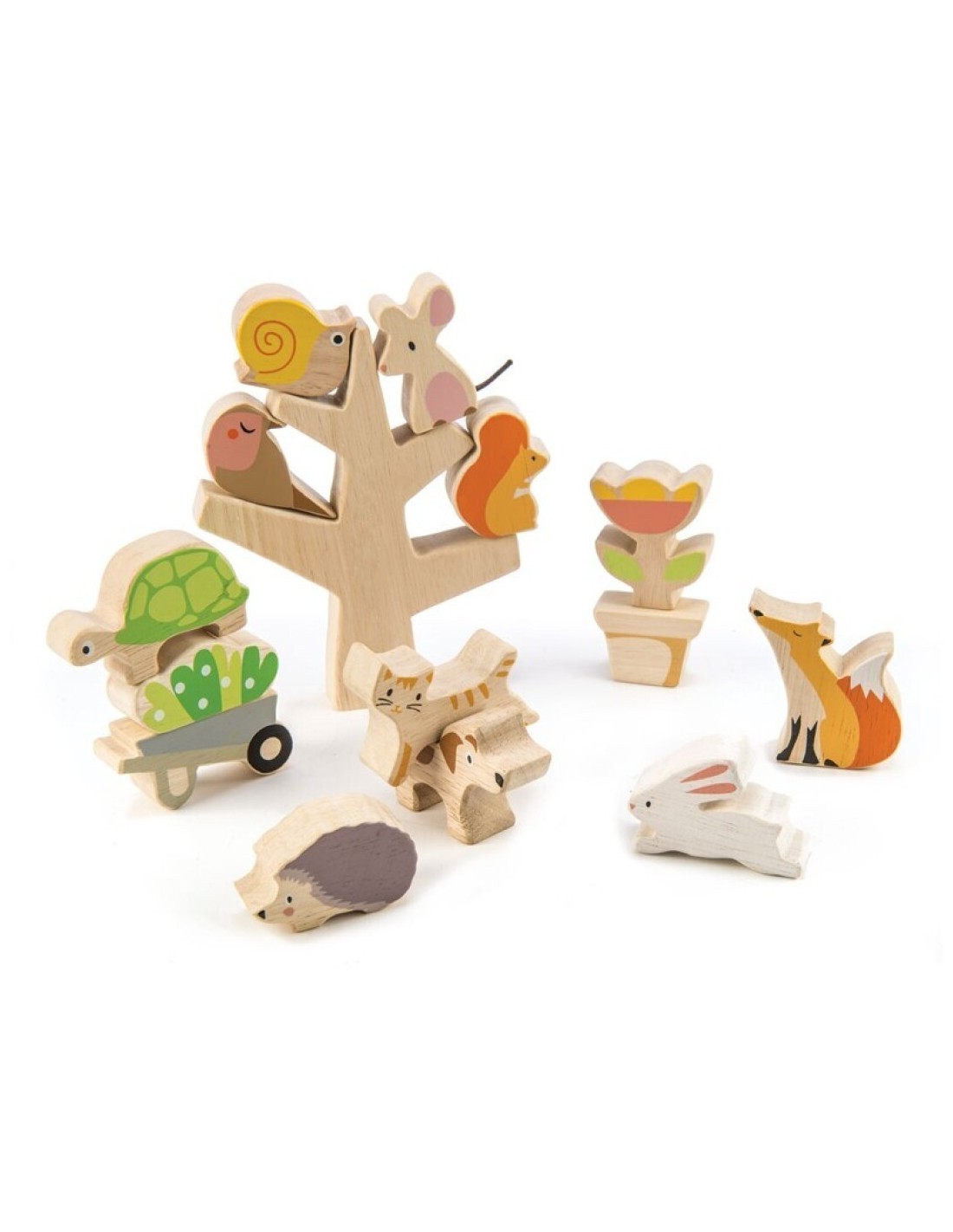 Un juego de equilibrio inspirado en animales y naturaleza. El objetivo es colocar el máximo de los animales en el árbol, maceta o carretilla. Este juguete favorecerá la observación y concentración. Además se puede jugar en paralelo con los animales y otros elementos como juego simbólico.