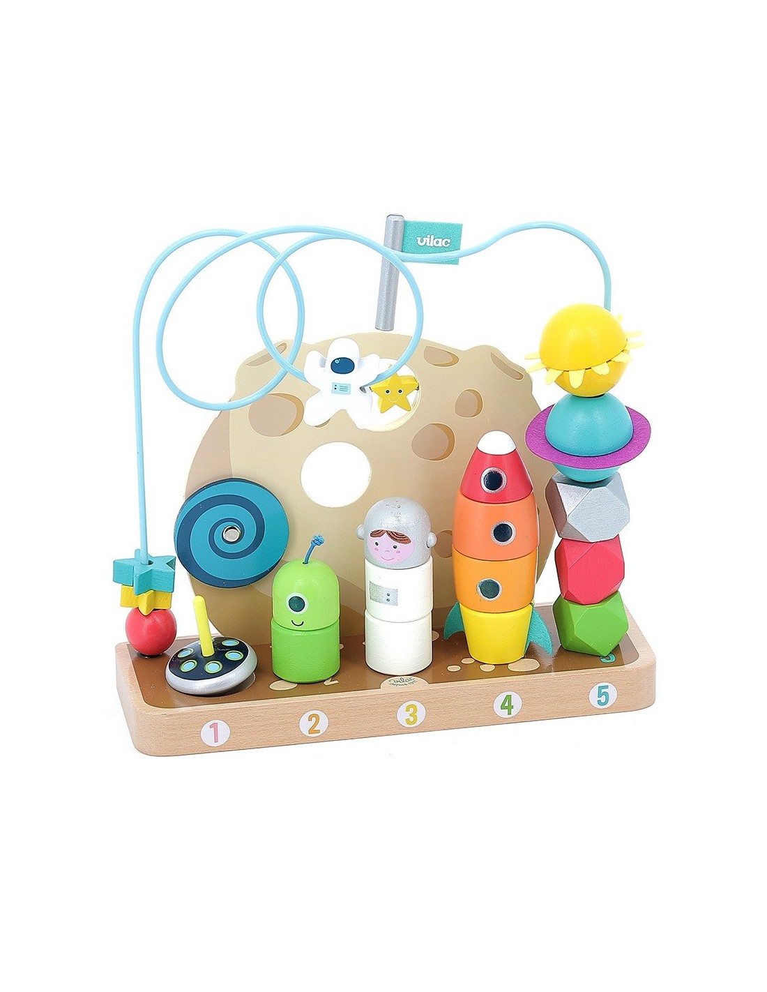 ¡Cuántas cosas por descubrir en este nuevo planeta: una peonza intergaláctica, un astronauta, un cohete y galaxias para apilar, estrellas para hacer viajar! ¡Todo mientras aprendes a contar!