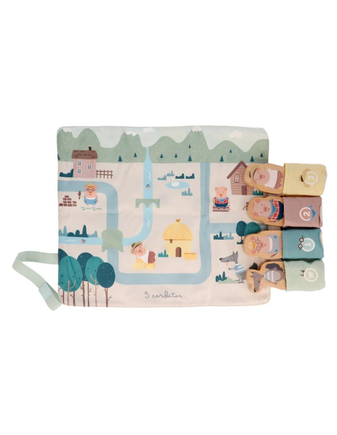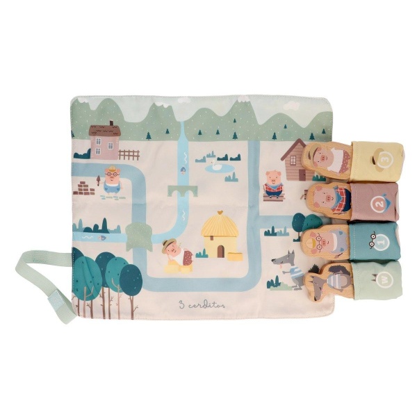 Lleva 4 elásticos para guardar los 3 cerditos y el lobo