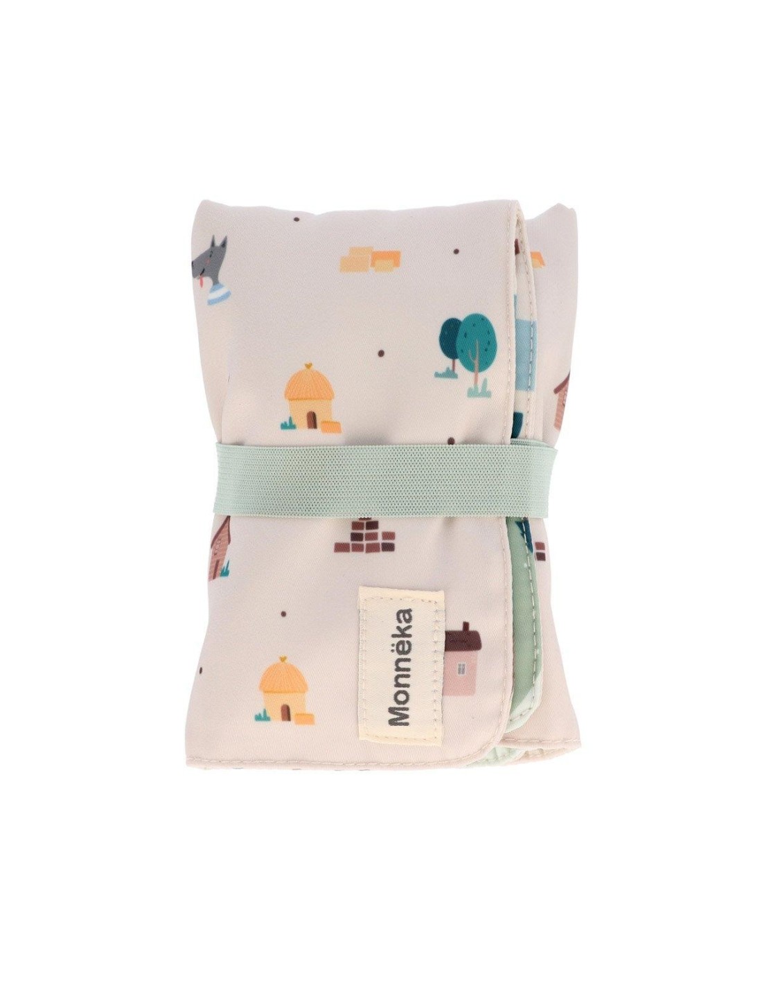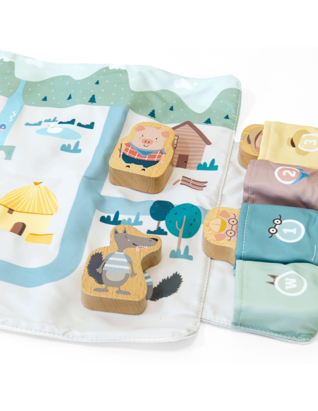 Mantelito de mesa con el dibujo de un circuito del bosque para poder jugar con los 4 juguetes de madera que trae. Las figuras son lo bastante robustas para que los más peques puedan agarrarlos con firmeza con sus manos.