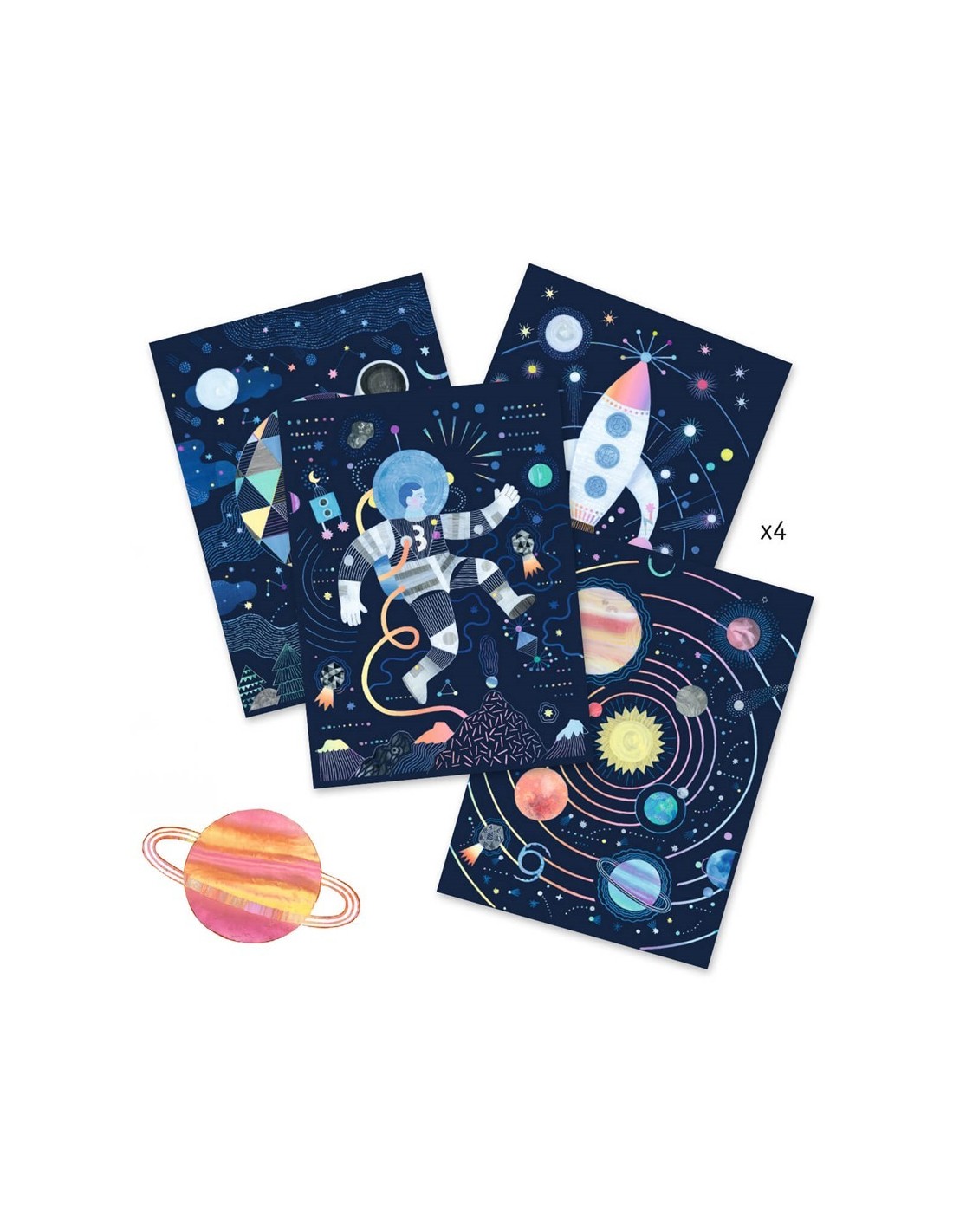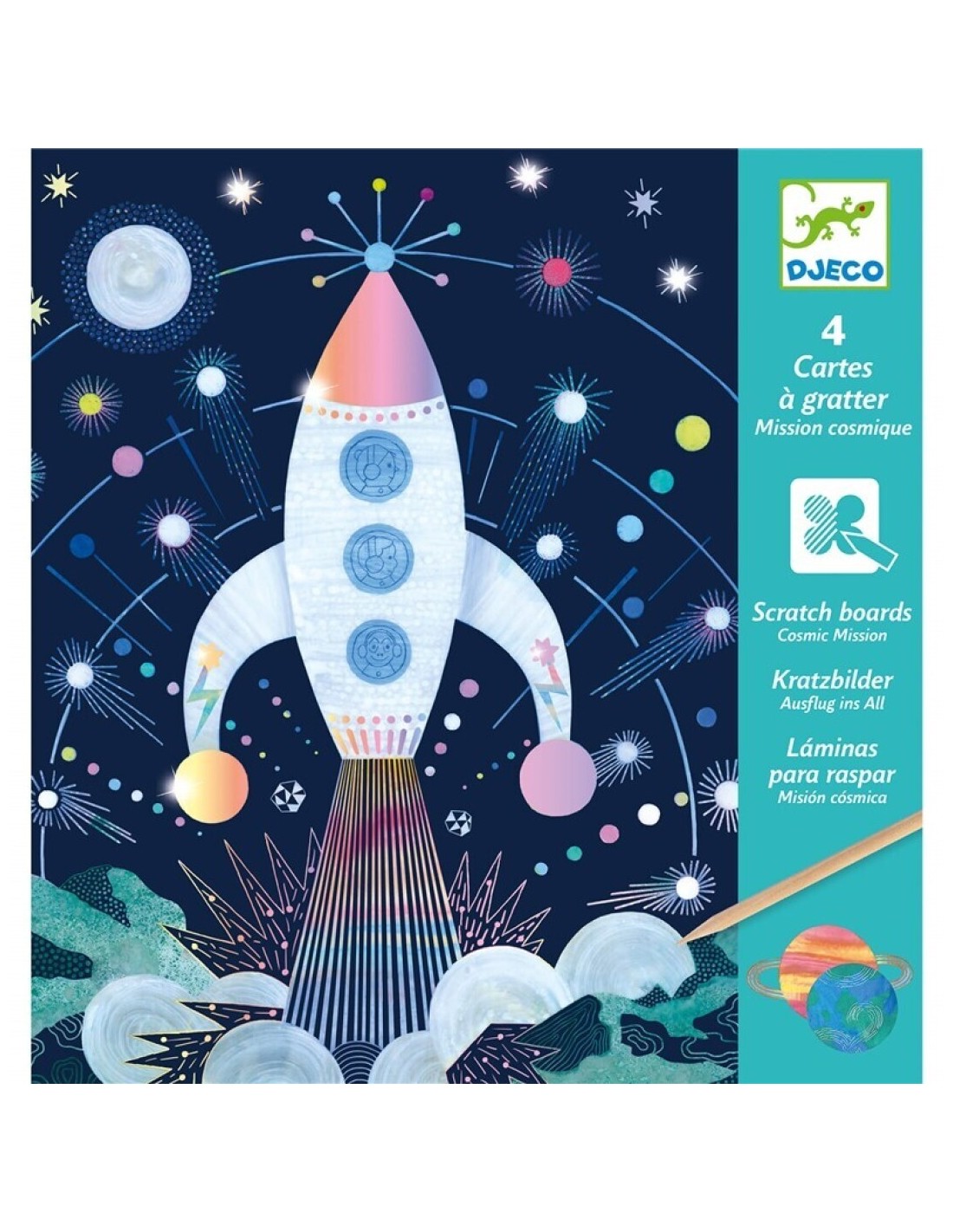 Un estuche de 4 tarjetas para rascar con reflejos irisados sobre el tema del espacio. El niño reproduce los dibujos imaginados por el artista raspando la superficie con el punzón de madera. ¡Progresivamente aparecen las ilustraciones como por arte de magia!