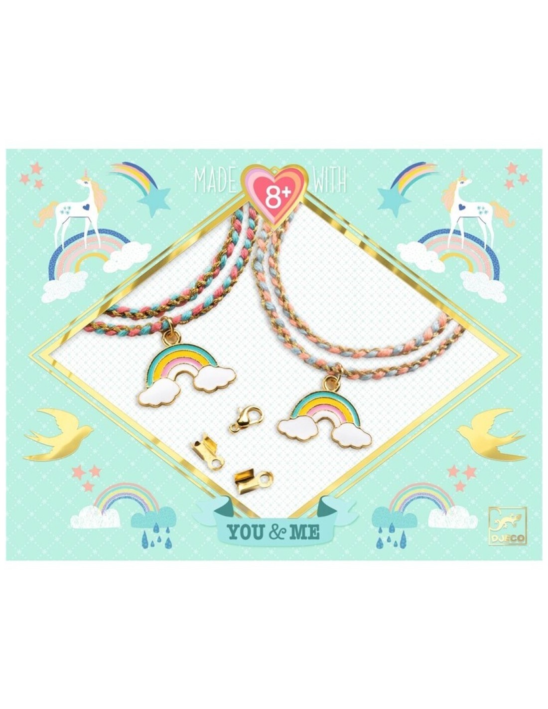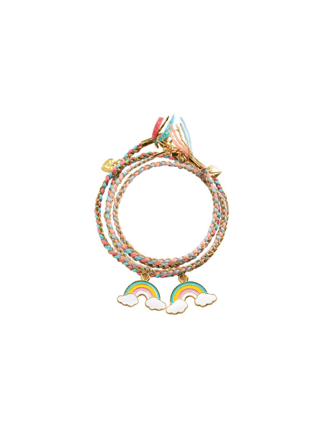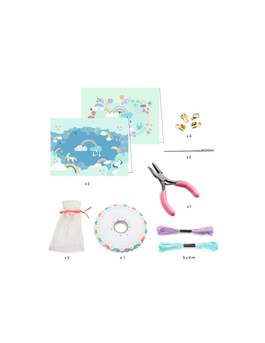 Una bonita caja brillante incluye todo el material para trenzar 2 bonitas pulseras arcoíris según el arte tradicional japonés del kumihimo. 2 joyas para guardar o regalar en una bonita bolsa de organza. Y para aún más recuerdos, se incluyen dos tarjetas con imágenes para escribir un bonito mensaje.