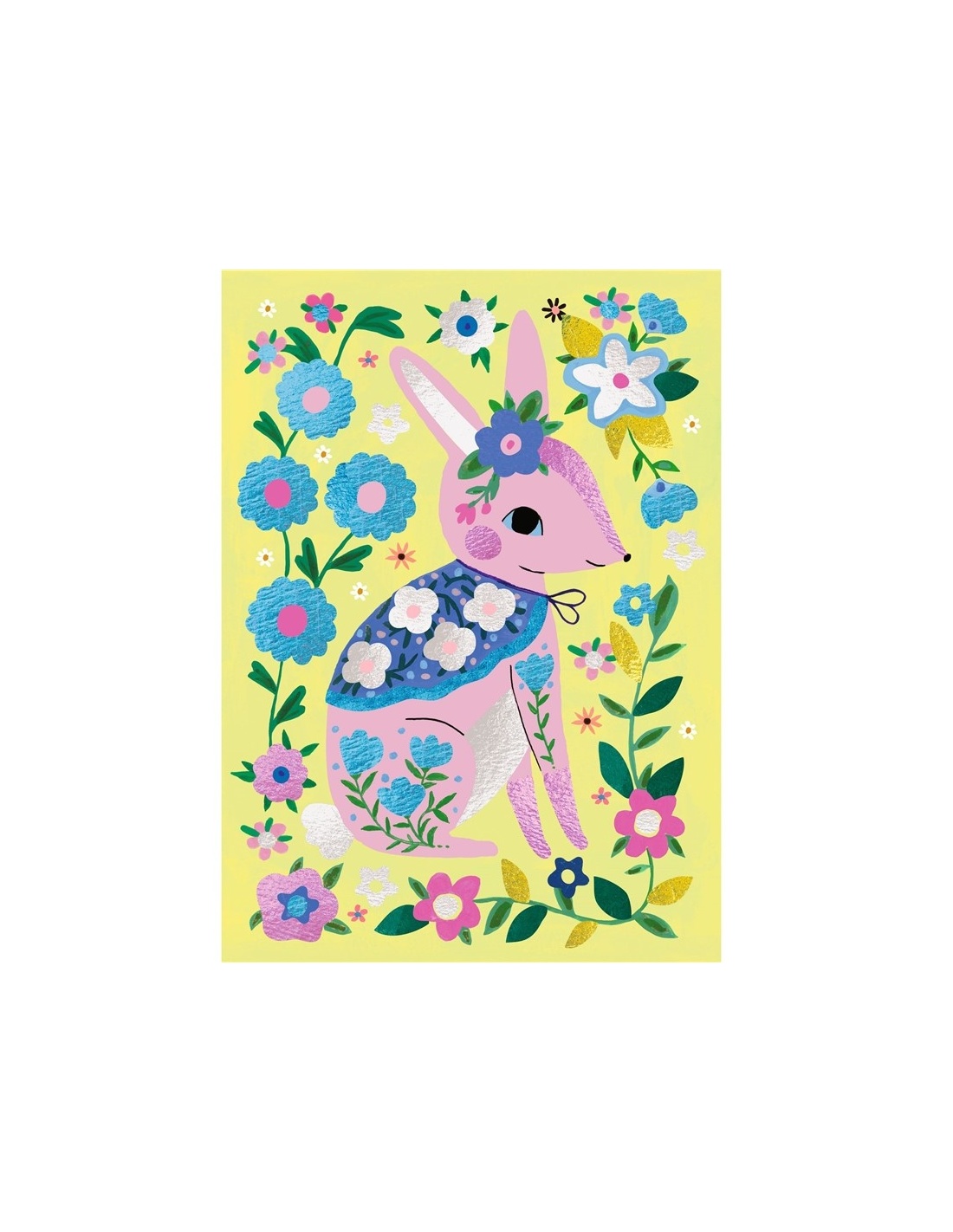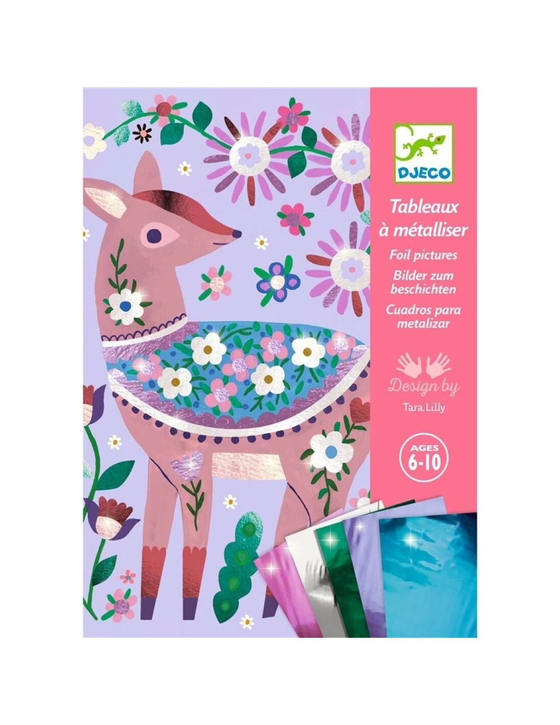 4 adorables animales para decorar con hojas metalizadas. Gracias al código de colores indicado en los cuadros, el niño puede identificar las áreas para metalizar. Utilizando la herramienta, quita la película protectora de la superficie adhesiva para colocar allí la hoja metalizada. El material se coloca como por arte de magia y los cuadros se iluminan.
