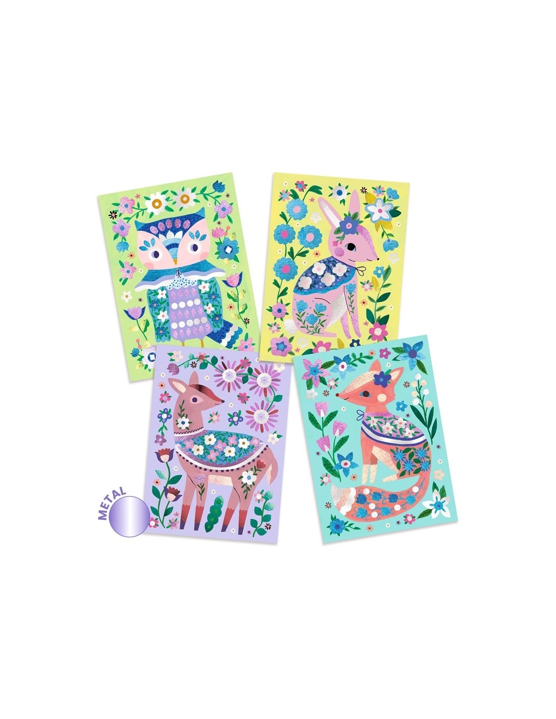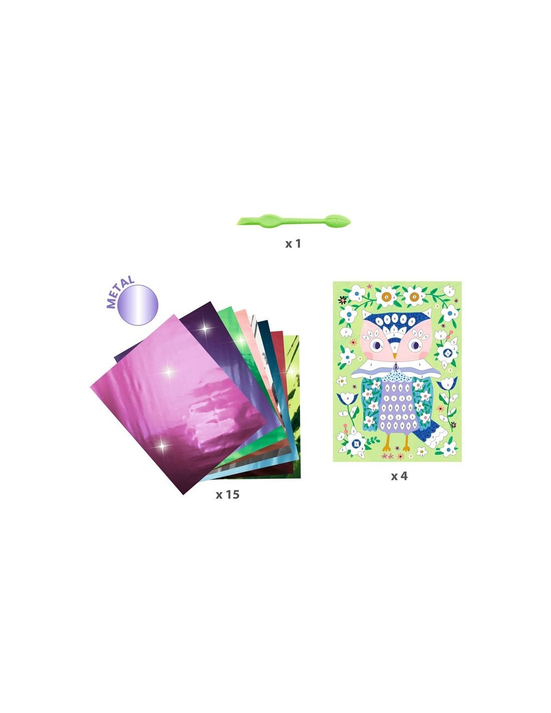 Contenido: 4 tarjetas ilustradas y con adhesivo (15 x 21 cm), 15 hojas de metal para colocar, 1 herramienta de plástico para descubrir las superficies adhesivas, 1 folleto explicativo paso a paso a color.