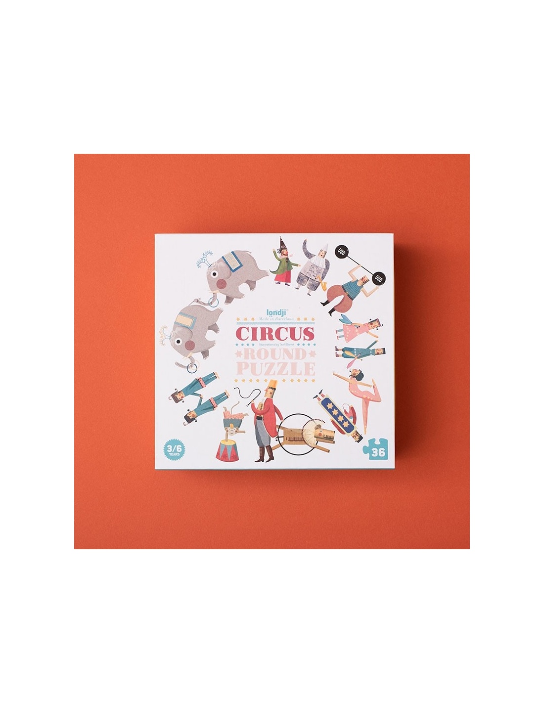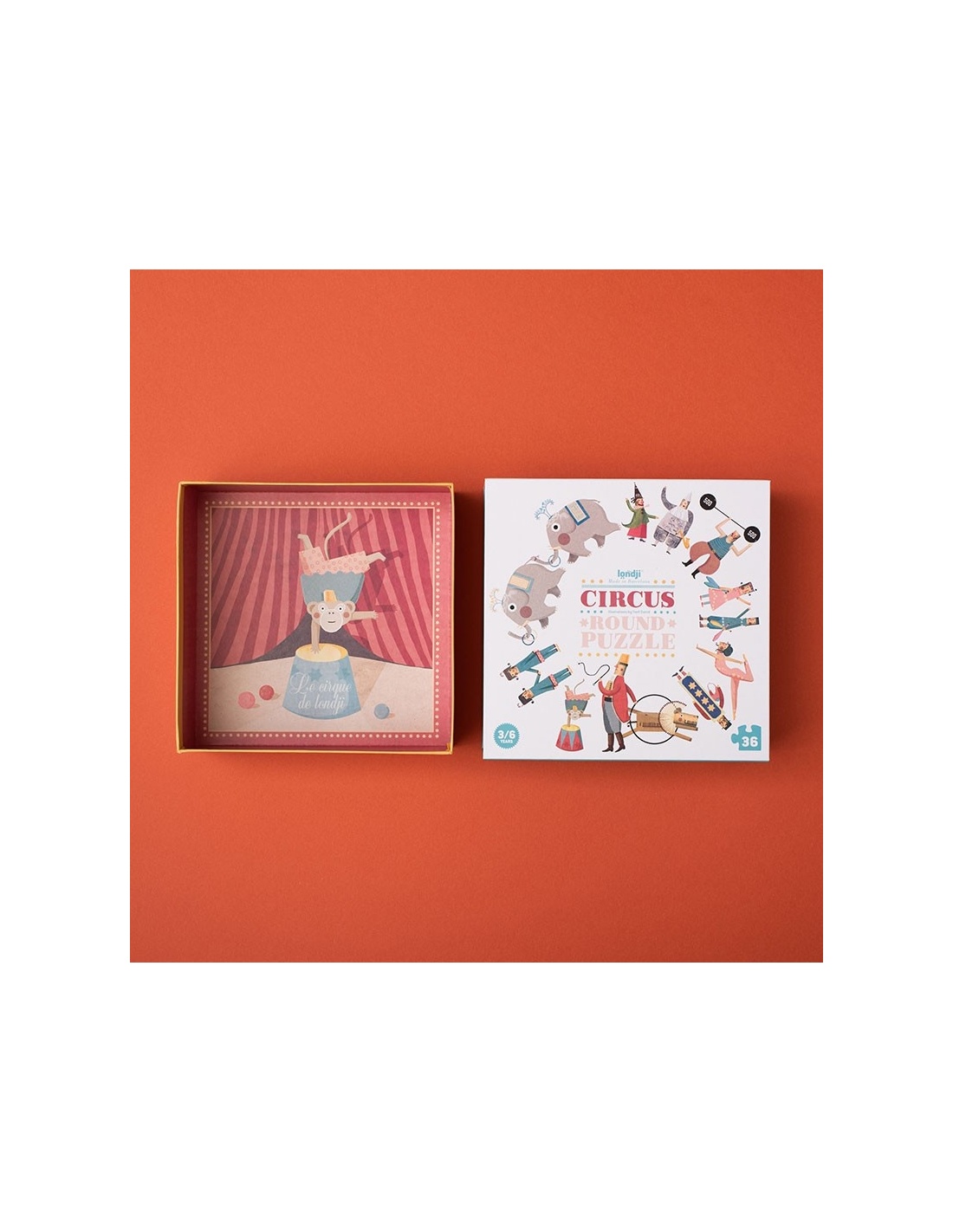 ¡Un puzzle de 36 piezas del circo y sus fantásticos habitantes! El rompecabezas es muy especial por su forma redonda y sus delicadas ilustraciones.