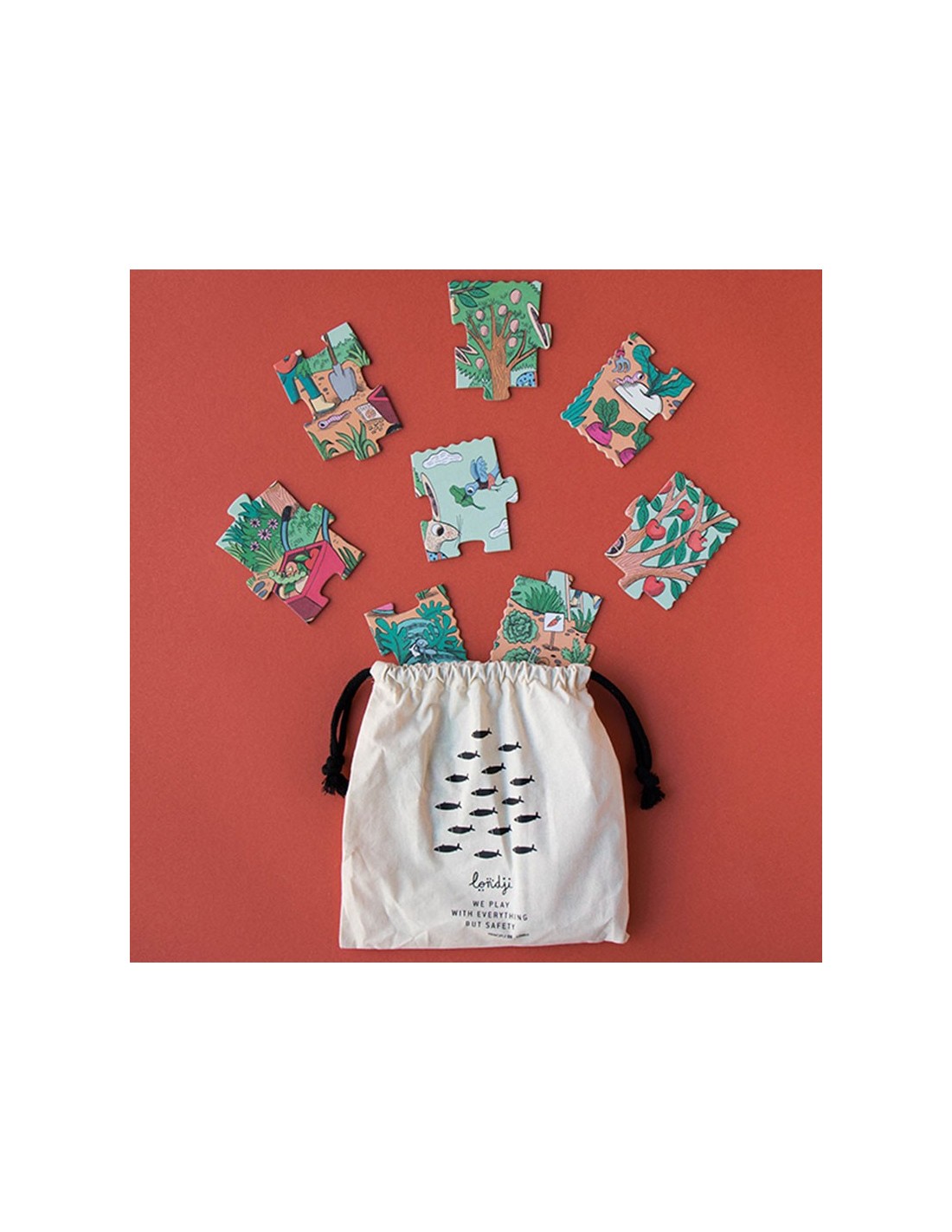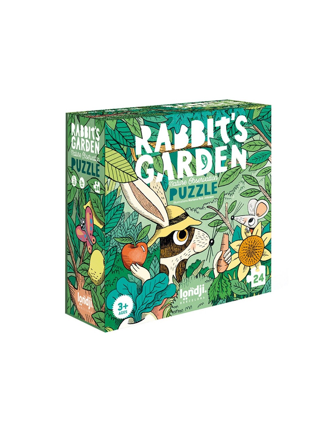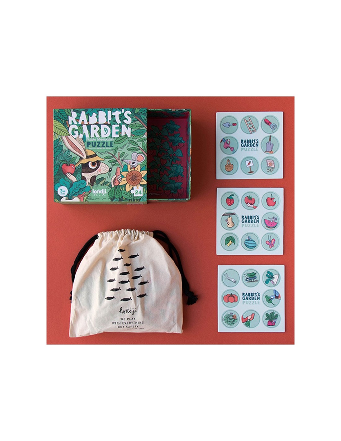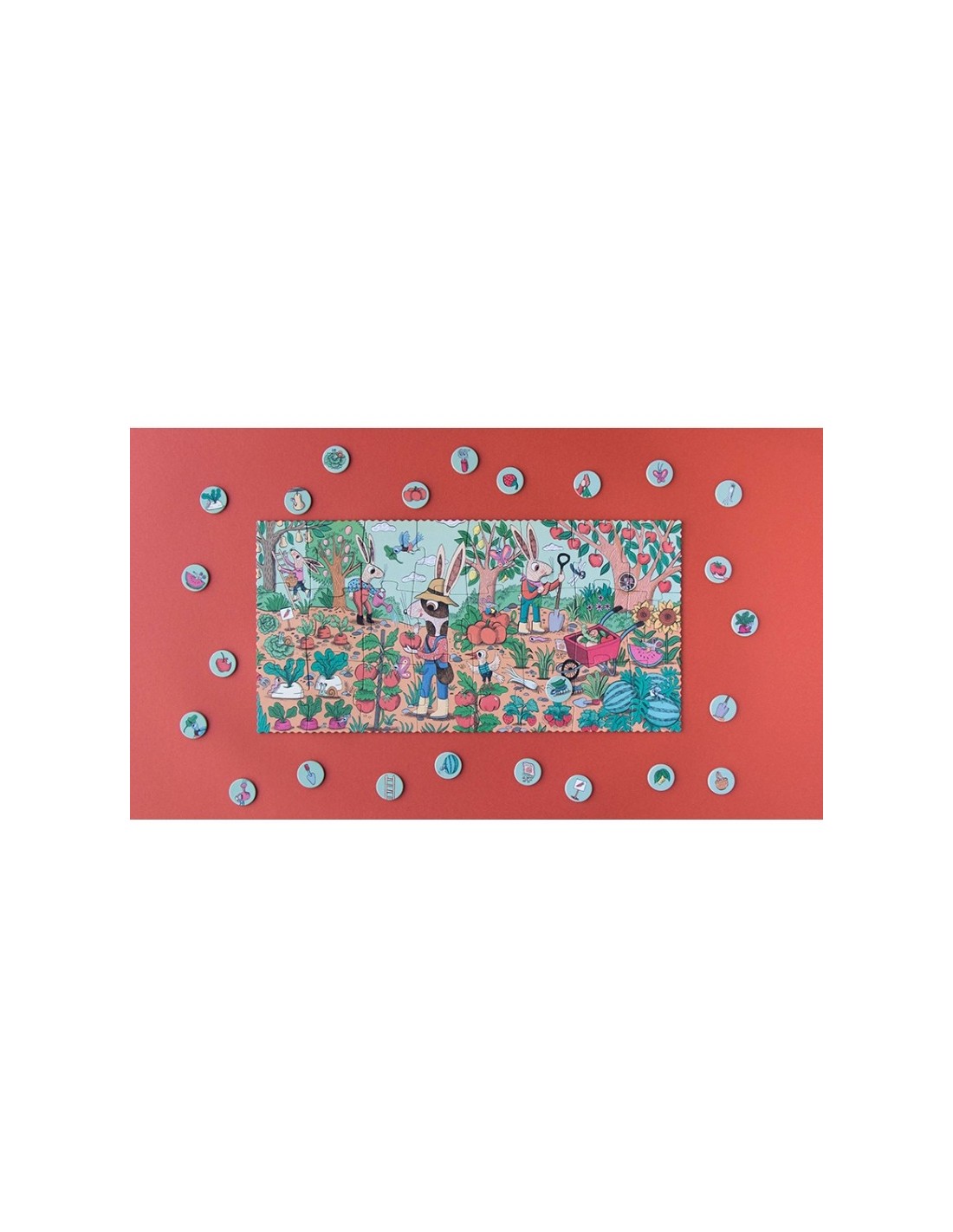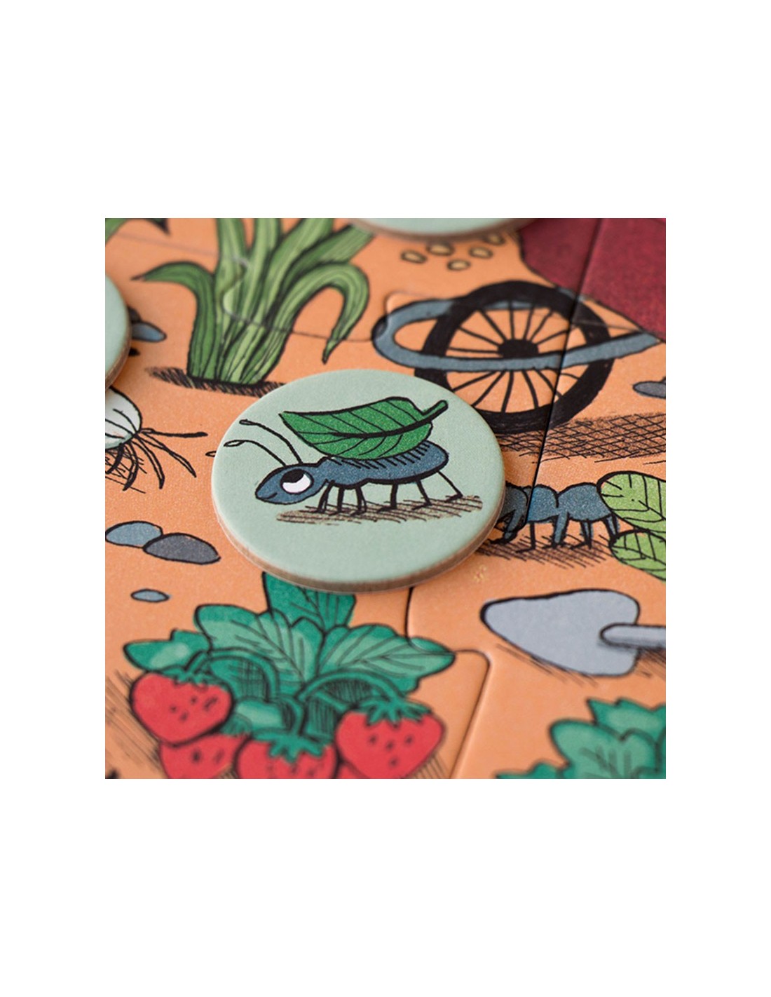 Un puzle de 24 piezas que se completa con un juego de observación. Una vez resuelto el puzle tenemos 24 fichas que iremos encontrando en la imagen, estimulando el descubrimiento del mundo de la huerta, las frutas y las verduras.