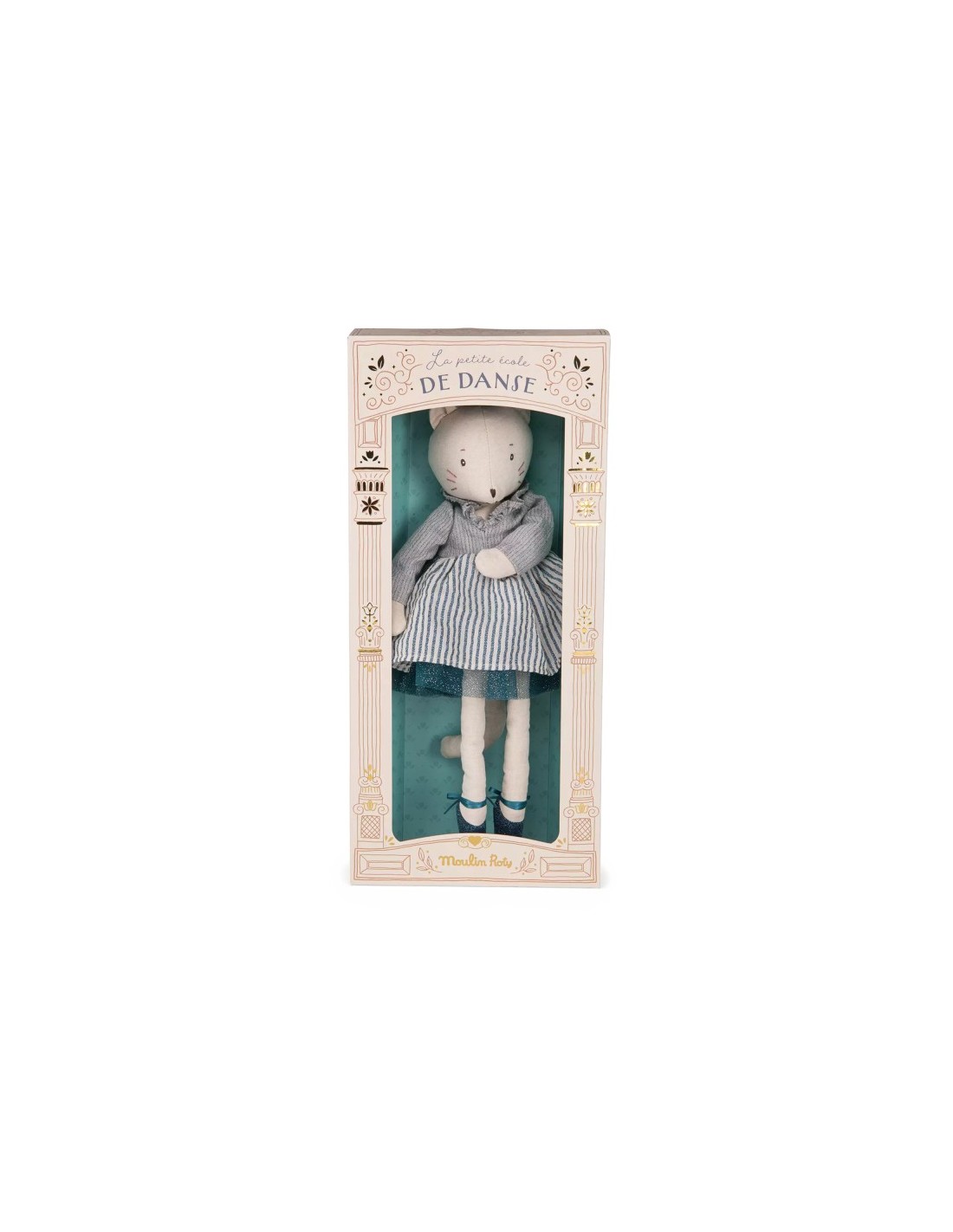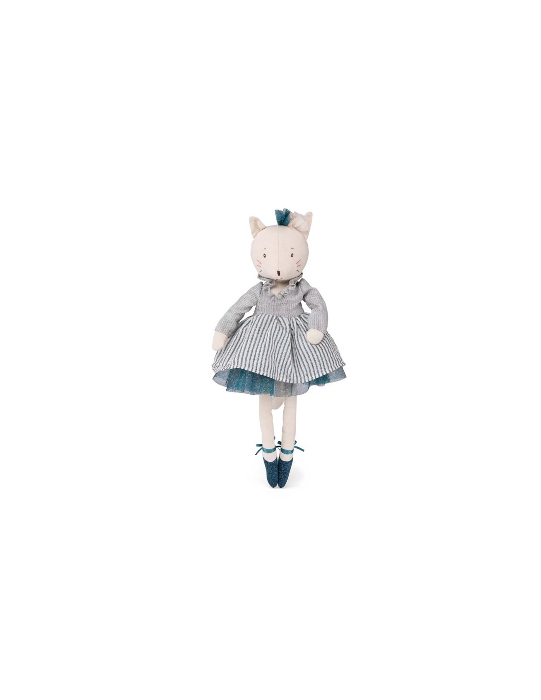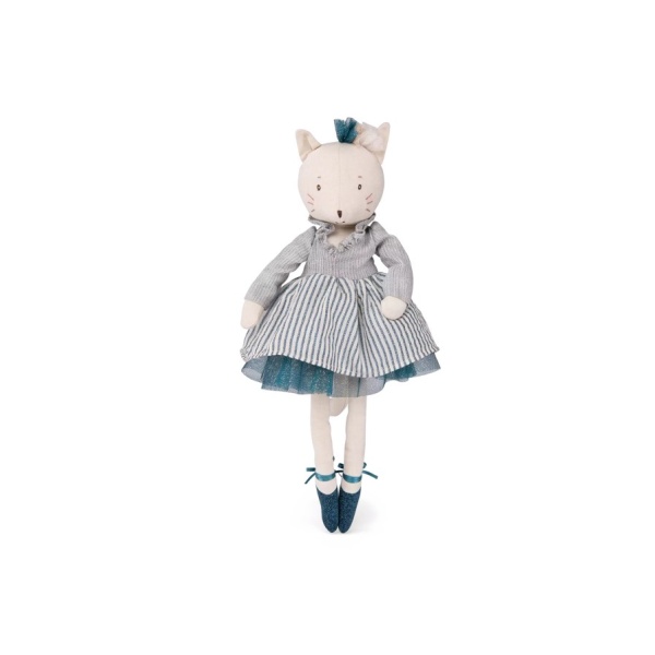 Muñeca de peluche en forma de Gata Bailarina con una dulce carita de gato bordada, Célestine viste como una bailarina: tutú, tocado de tul, zapatillas de cinta... Fácil de agarrar por las manitas, se convertirá en la compañera de juegos favorita de las pequeñas bailarinas de la casa. Presentada en caja de regalo vintage ideal para regalar.